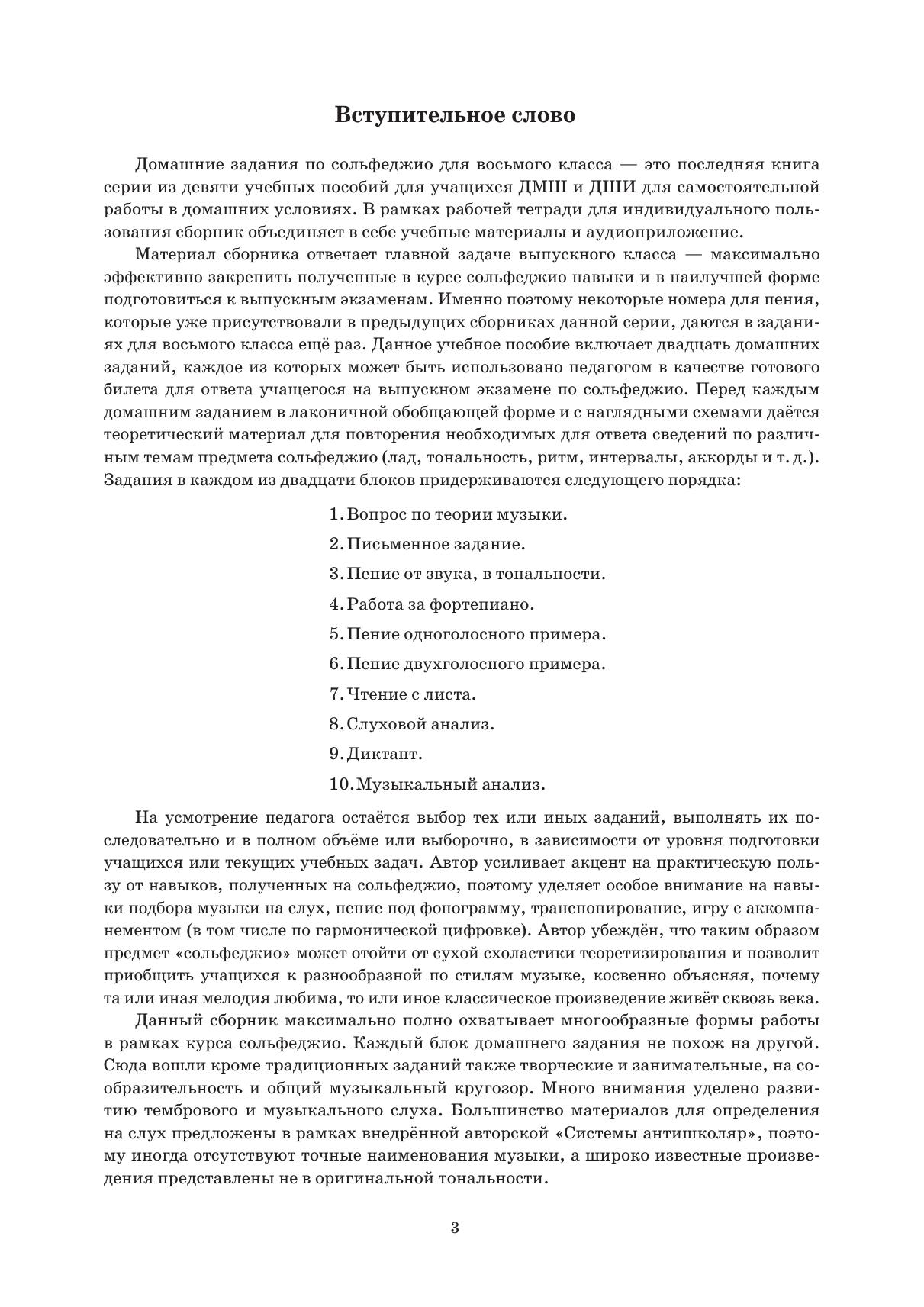 Учебное пособие разработано на основе образовательных программ ДПО для восьмого класса ДМШ и ДШИ в области музыкального искусства и предназначено для изучения сольфеджио в домашних условиях. В формате рабочей тетради для индивидуального пользования объединены учебные материалы по дисциплине «Сольфеджио», а также имеется аудиоприложение. Пособие может быть полезным преподавателям и родителям для создания благоприятных условий в обучении дома. Материал представлен в занимательной форме и позволит ребенку в полной мере раскрыть его музыкальные таланты. Пособие является интерактивным и содержит QR-код электронной библиотеки музыки для слушания. The textbook was worked out basing on curriculum of additional vocational education for the eighth grade of children’s music schools and children’s schools of arts in the field of musical art and is intended for studying solfeggio at home. The individual workbook includes training materials on the “Solfeggio” subject, as well as an audio application. The textbook may be useful for teachers, and parents in creating favorable conditions for children’s practice at home. The material is presented in a funny way and will allow the child to fully develop his/her musical talents. The textbook is interactive and contains an electronic music library QR code for listening.