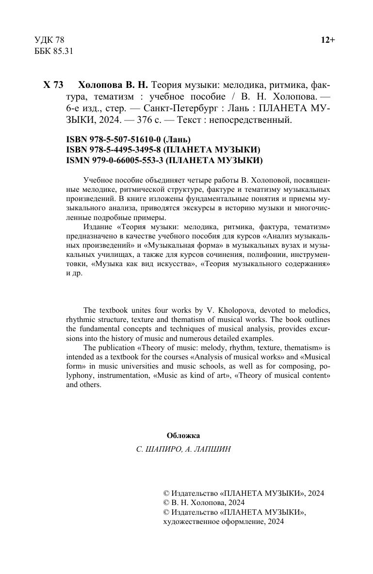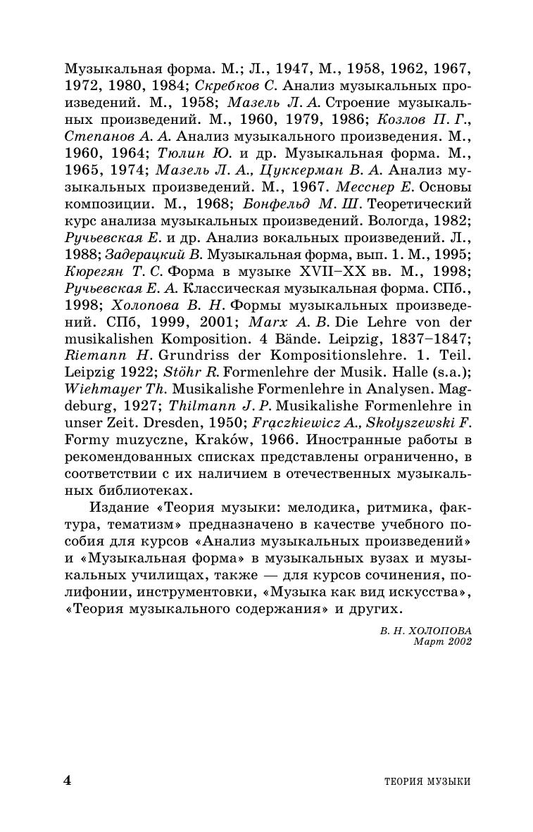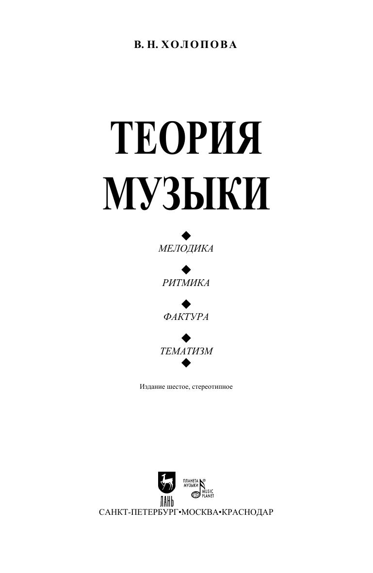 Учебное пособие объединяет четыре работы В. Холоповой, посвященныe мелодике, ритмической структуре, фактуре и тематизму музыкальных произведений. В книге изложены фундаментальные понятия и приемы музыкального анализа, приводятся экскурсы в историю музыки и многочисленные подробные примеры. Издание «Теория музыки: мелодика, ритмика, фактура, тематизм» предназначено в качестве учебного пособия для курсов «Анализ музыкальных произведений» и «Музыкальная форма» в музыкальных вузах и музыкальных училищах, также — для курсов сочинения, полифонии, инструментовки, «Музыка как вид искусства», «Теория музыкального содержания» и других. The textbook unites four works by V. Kholopova, devoted to melodics, rhythmic structure, texture and thematism of musical works. The book outlines the fundamental concepts and techniques of musical analysis, provides excursions into the history of music and numerous detailed examples. The publication «Theory of music: melody, rhythm, texture, thematism» is intended as a textbook for the courses «Analysis of musical works» and «Musical form» in music universities and music schools, as well as for composing, polyphony, instrumentation, «Music as kind of art», «Theory of musical content» and others.