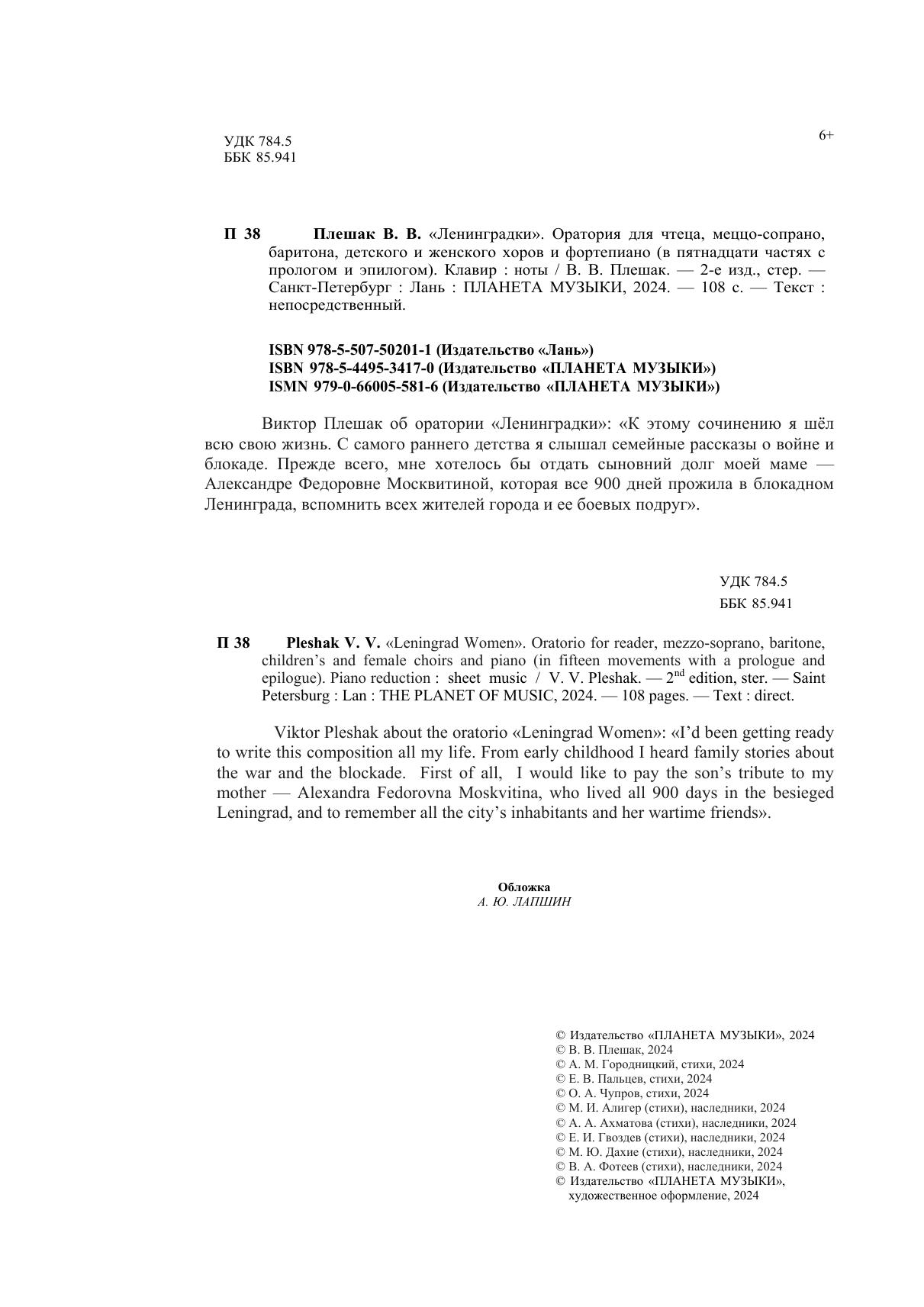 Виктор Плешак об оратории «Ленинградки»: "К этому сочинению я шёл всю свою жизнь. С самого раннего детства я слышал семейные рассказы о войне и блокаде. Прежде всего, мне хотелось бы отдать сыновний долг моей маме – Александре Федоровне Москвитиной, которая все 900 дней прожила в блокадном Ленинграде, вспомнить всех жителей города и ее боевых подруг". Victor Pleshak about the oratorio "Leningrad Women": "I’d been getting ready to write this composition all my life. From early childhood I heard family stories about the war and the blockade. First of all, I would like to pay the son’s tribute to my mother – Alexandra Fedorovna Moskvitina, who lived all 900 days in the besieged Leningrad, and to remember all the city’s inhabitants and her wartime friends".