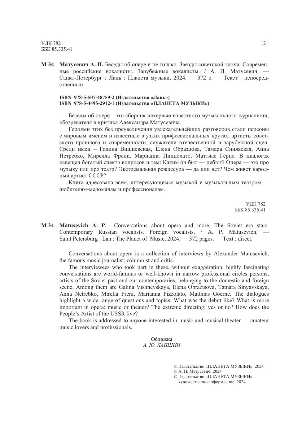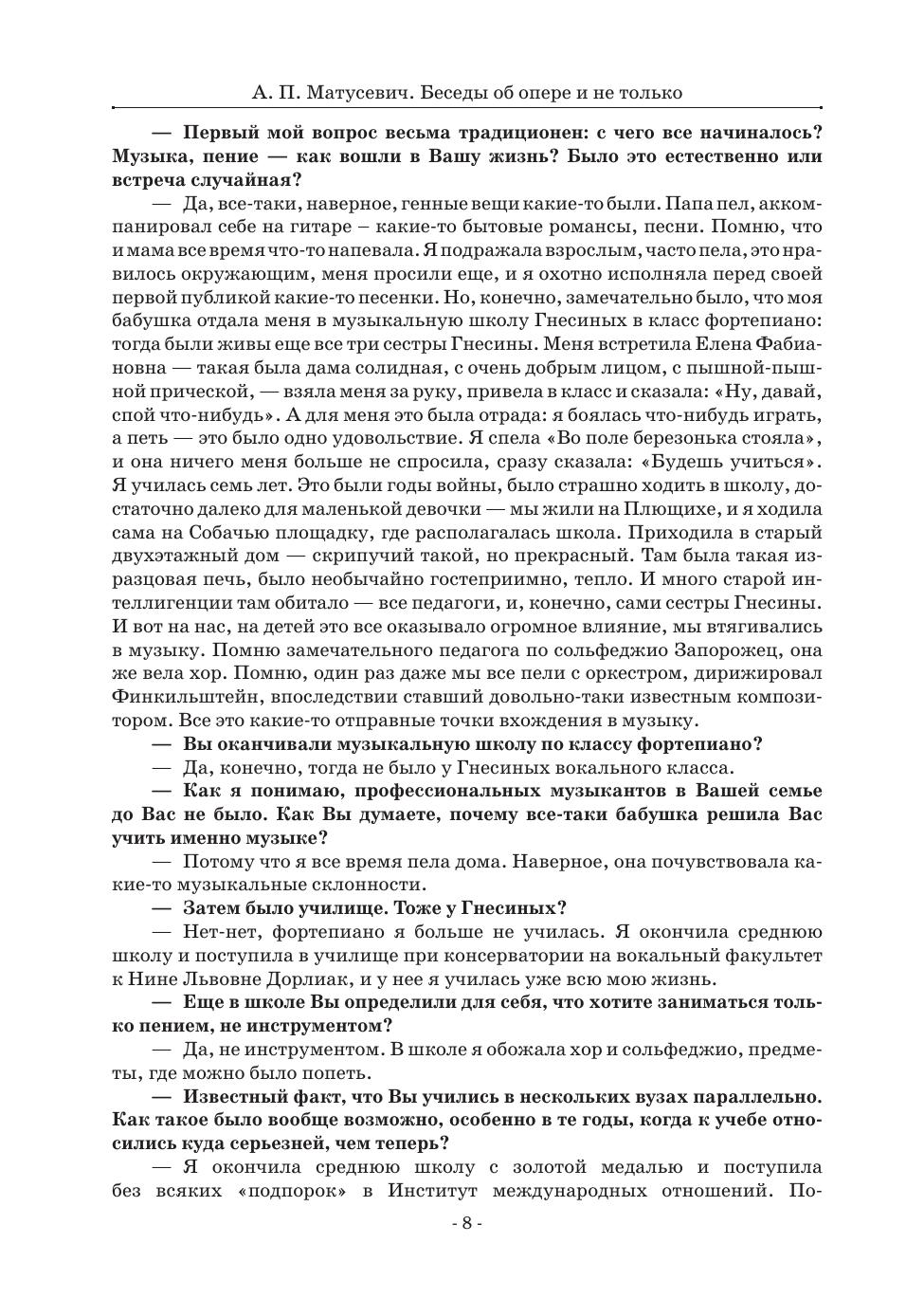 Беседы об опере – это сборник интервью известного музыкального журналиста, обозревателя и критика Александра Матусевича. Героями этих без преувеличения увлекательнейших разговоров стали персоны с мировым именем и известные в узких профессиональных кругах, артисты советского прошлого и современности, служители отечественной и зарубежной сцен. Среди имен – Галина Вишневская, Елена Образцова, Тамара Синявская, Анна Нетребко, Мирелла Френи, Марианна Пиццолато, Маттиас Гёрне. В диалогах освещен богатый спектр вопросов и тем: Каким он был – дебют? Опера – это про музыку или про театр? Экстремальная режиссура – да или нет? Чем живет народный артист СССР? Книга адресована всем, интересующимся музыкой и музыкальным театром – любителям-меломанам и профессионалам. Conversations about opera is a collection of interviews by Alexander Matusevich, the famous music journalist, columnist and critic. The interviewees who took part in these, without exaggeration, highly fascinating conversations are world-famous or well-known in narrow professional circles persons, artists of the Soviet past and our contemporaries, belonging to the domestic and foreign scene. Among them are Galina Vishnevskaya, Elena Obraztsova, Tamara Sinyavskaya, Anna Netrebko, Mirella Freni, Marianna Pizzolato, Matthias Goerne. The dialogues highlight a wide range of questions and topics: What was the debut like? What is more important in opera: music or theater? The extreme directing: yes or no? How does the People’s Artist of the USSR live? The book is addressed to anyone interested in music and musical theater — amateur music lovers and professionals.
