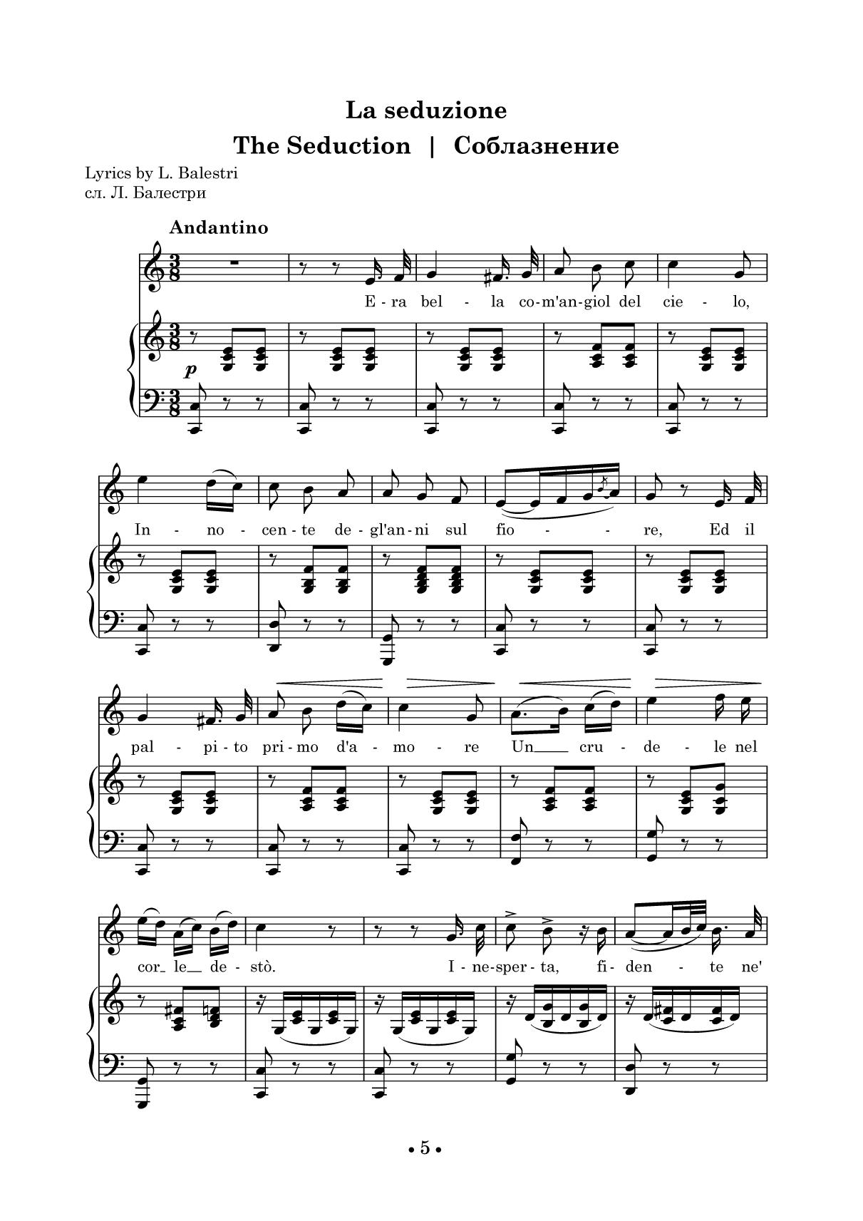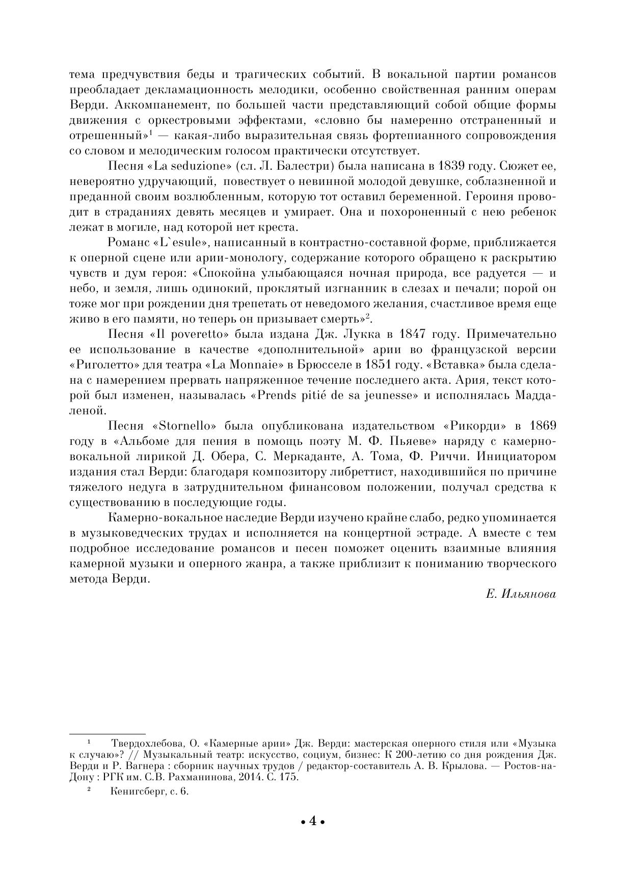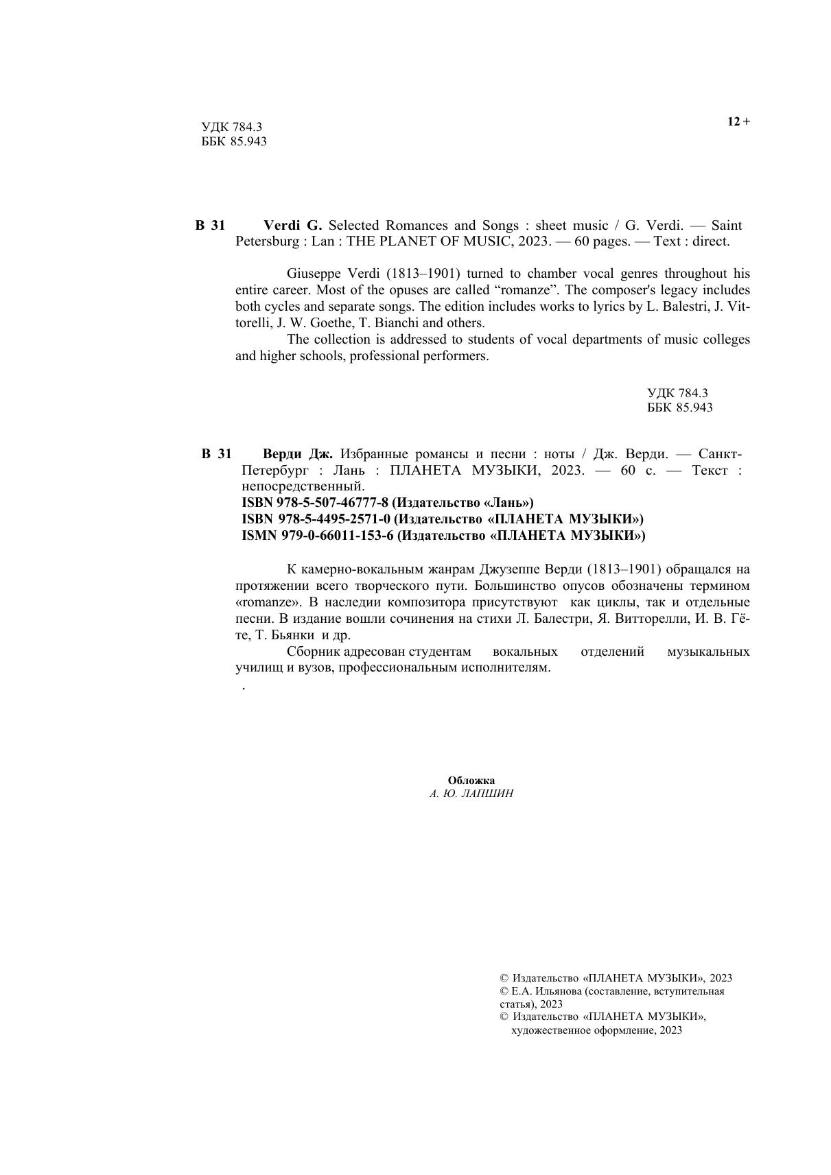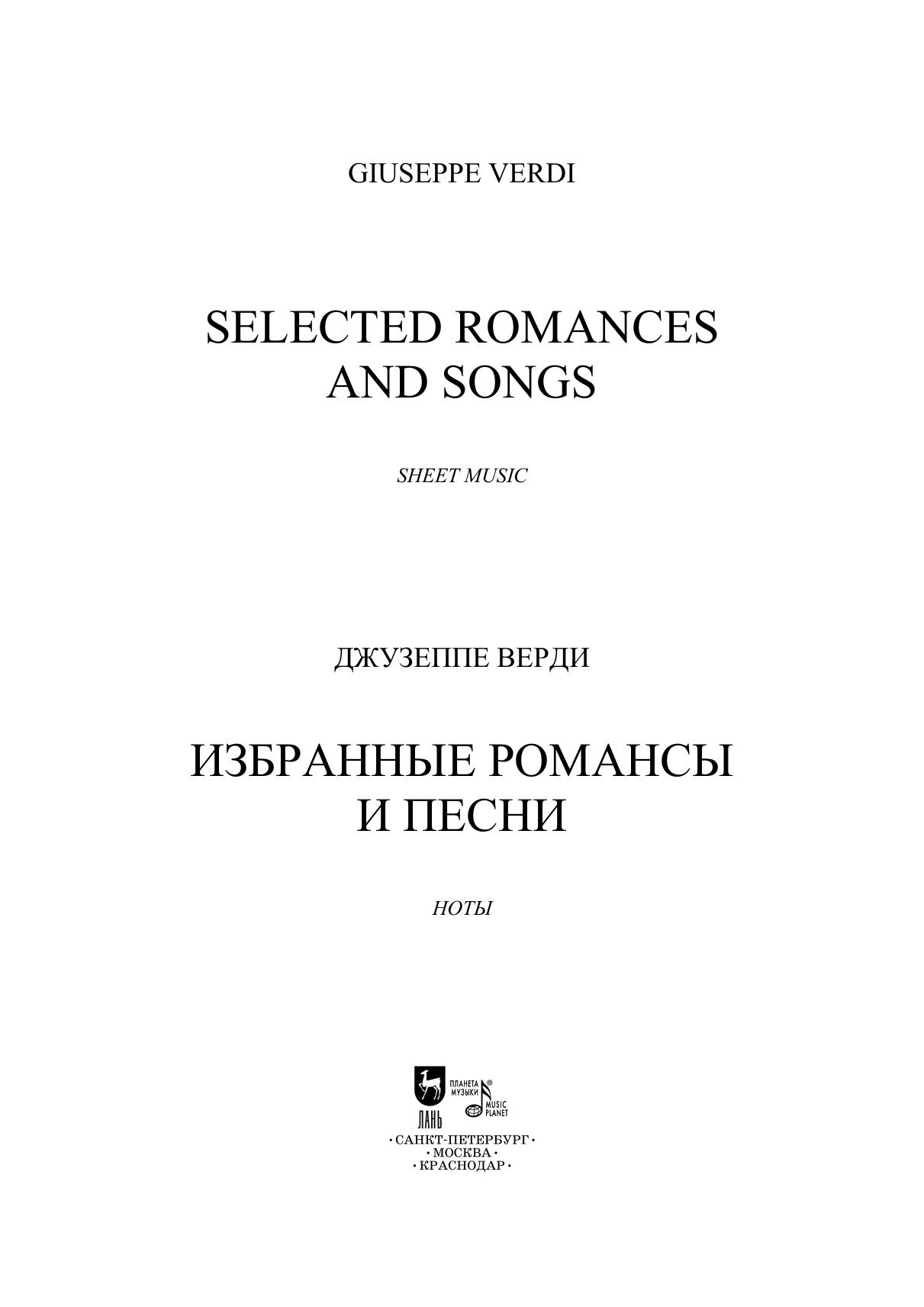 К камерно-вокальным жанрам Джузеппе Верди (1813-1901) обращался на протяжении всего творческого пути. Большинство опусов обозначены термином «romanze». В наследии композитора присутствуют как циклы, так и отдельные песни. В издание вошли сочинения на стихи Л. Балестри, Я. Витторелли, И. В. Гёте. Т. Бьянки и др. Сборник адресован студентам вокальных отделений музыкальных училищ и вузов, профессиональным исполнителям. Giuseppe Verdi (1813–1901) turned to chamber vocal genres throughout his entire career. Most of the opuses are called “romanze”. The composer's legacy includes both cycles and separate songs. The edition includes works to lyrics by L. Balestri, J. Vittorelli, J. W. Goethe, T. Bianchi and others. The collection is addressed to students of vocal departments of music colleges and higher schools, professional performers.