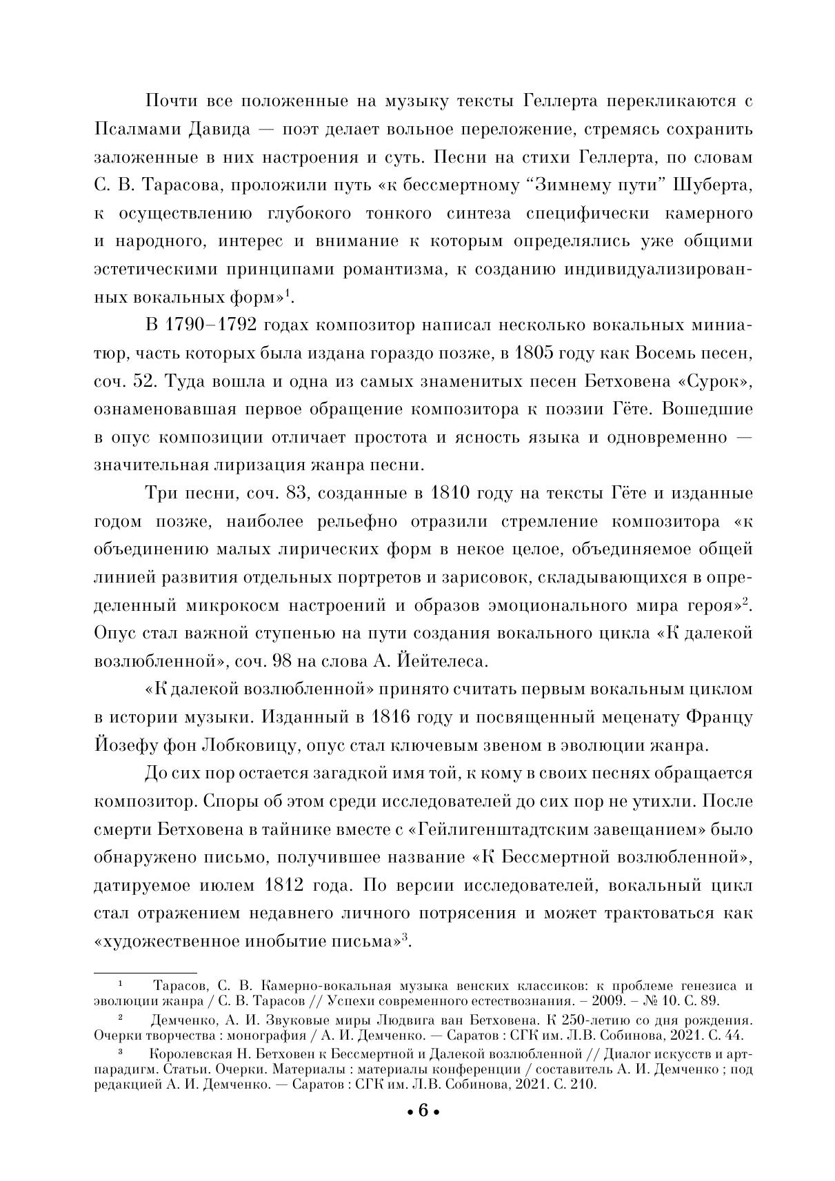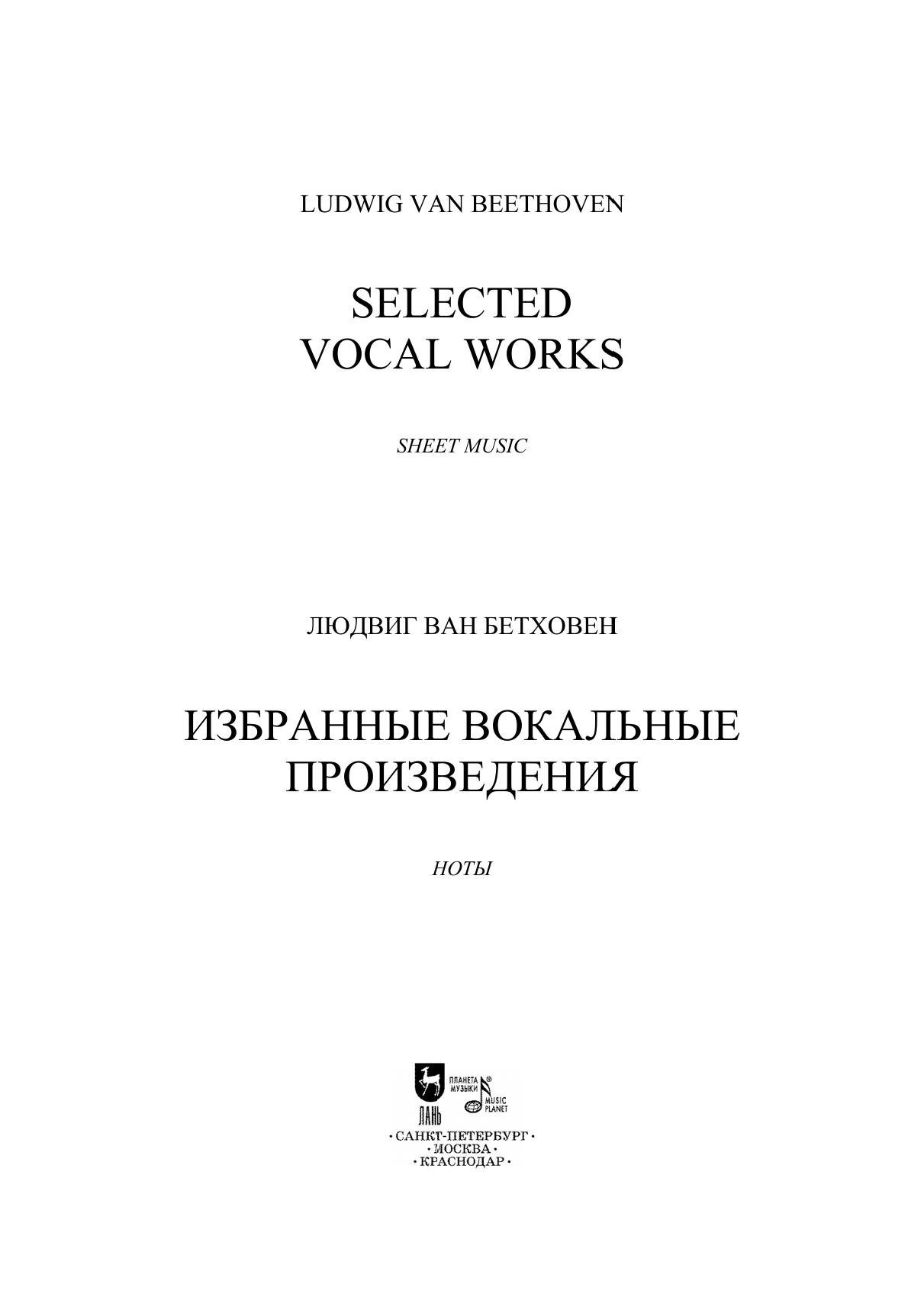 В наследии Л. ван Бетховена область камерно-вокальной музыки занимает весомое место. К жанру песни композитор обращался на протяжении всего творческого пути, написав около 90 опусов. В сборник вошли отдельные песни («Аделаида», «Песня издалека», «Возлюбленной», «Поцелуй») и вокальные циклы (соч. 48. 52, 83, 98) Бетховена. Издание адресовано студентам вокальных факультетов музыкальных училищ и вузов, профессиональным исполнителям, любителям вокальной музыки. The sphere of chamber vocal music occupies a significant place in the L. van Beethoven’s heritage. The composer turned himself to the genre of Lied throughout his entire career, having written about 90 opuses. The collection includes separate songs (“Adelaide”, “Song From Afar”, “To the Beloved”, “The Kiss”) and Beethoven’s vocal cycles (op. 48. 52, 83, 98). The edition is addressed to students of vocal faculties of music colleges and higher schools, professional performers, lovers of vocal music.