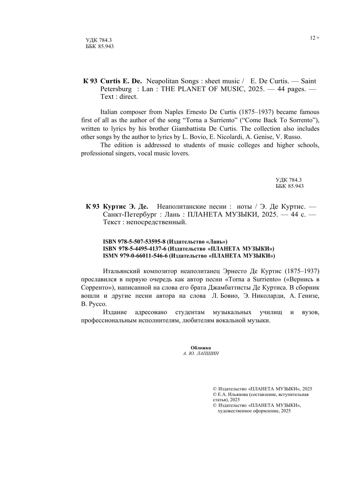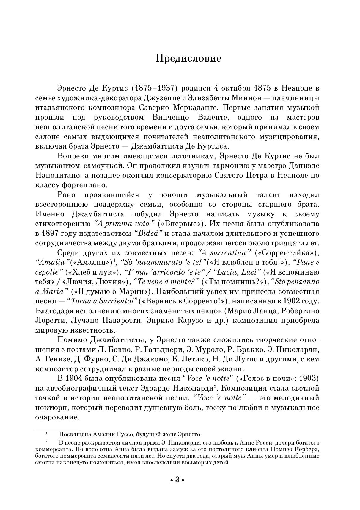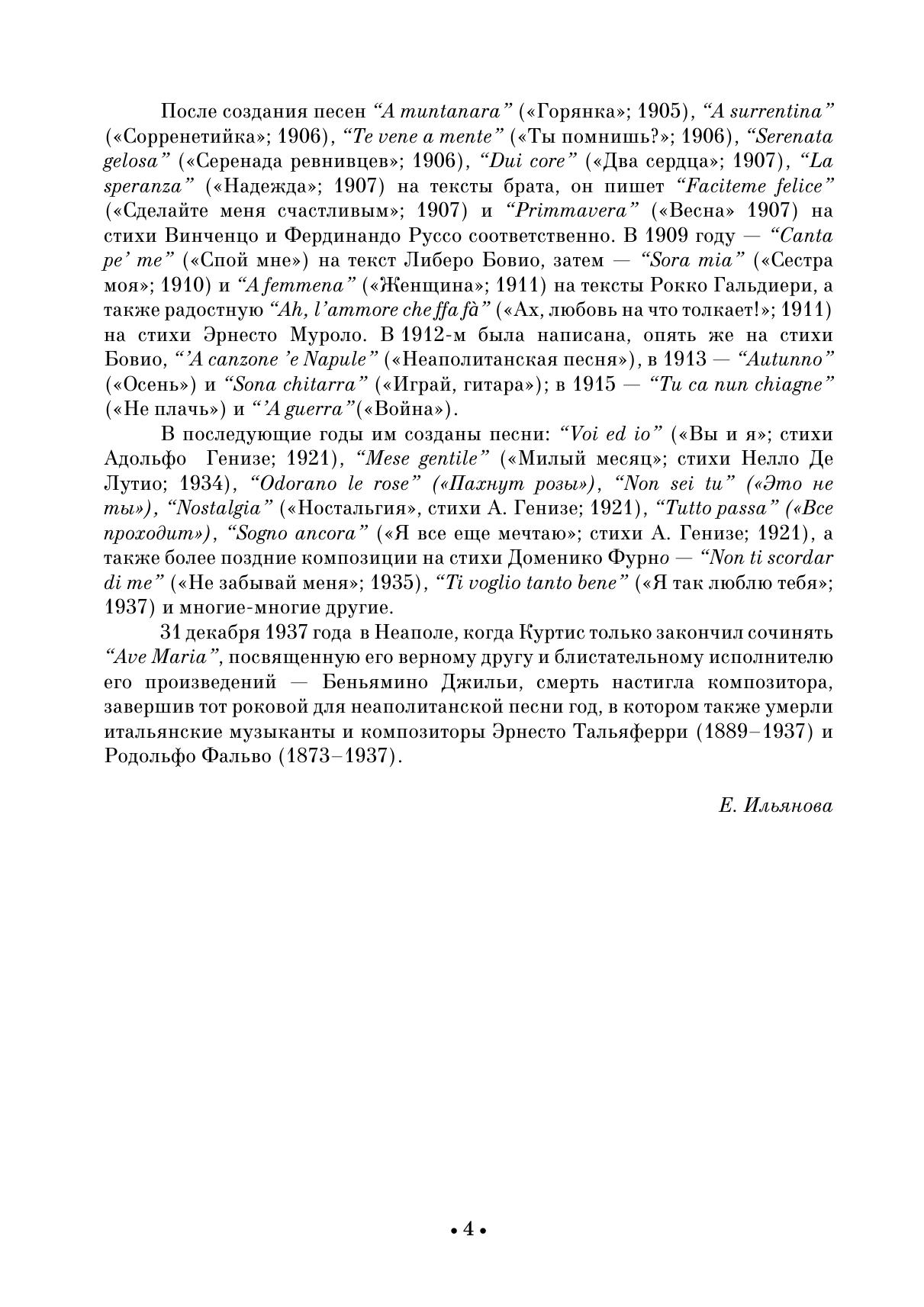 Итальянский композитор неаполитанец Эрнесто Де Куртис (1875–1937) прославился в первую очередь как автор песни «Torna a Surriento» («Вернись в Сорренто»), написанной на слова его брата Джамбаттисты Де Куртиса. В сборник вошли и другие песни автора на слова Л. Бовио, Э. Николарди, А. Генизе, В. Руссо. Издание адресовано студентам музыкальных училищ и вузов, профессиональным исполнителям, любителям вокальной музыки. Italian composer from Naples Ernesto De Curtis (1875–1937) became famous first of all as the author of the song “Torna a Surriento” (“Come Back To Sorrento”), written to lyrics by his brother Giambattista De Curtis. The collection also includes other songs by the author to lyrics by L. Bovio, E. Nicolardi, A. Genise, V. Russo. The edition is addressed to students of music colleges and higher schools, professional singers, vocal music lovers.
