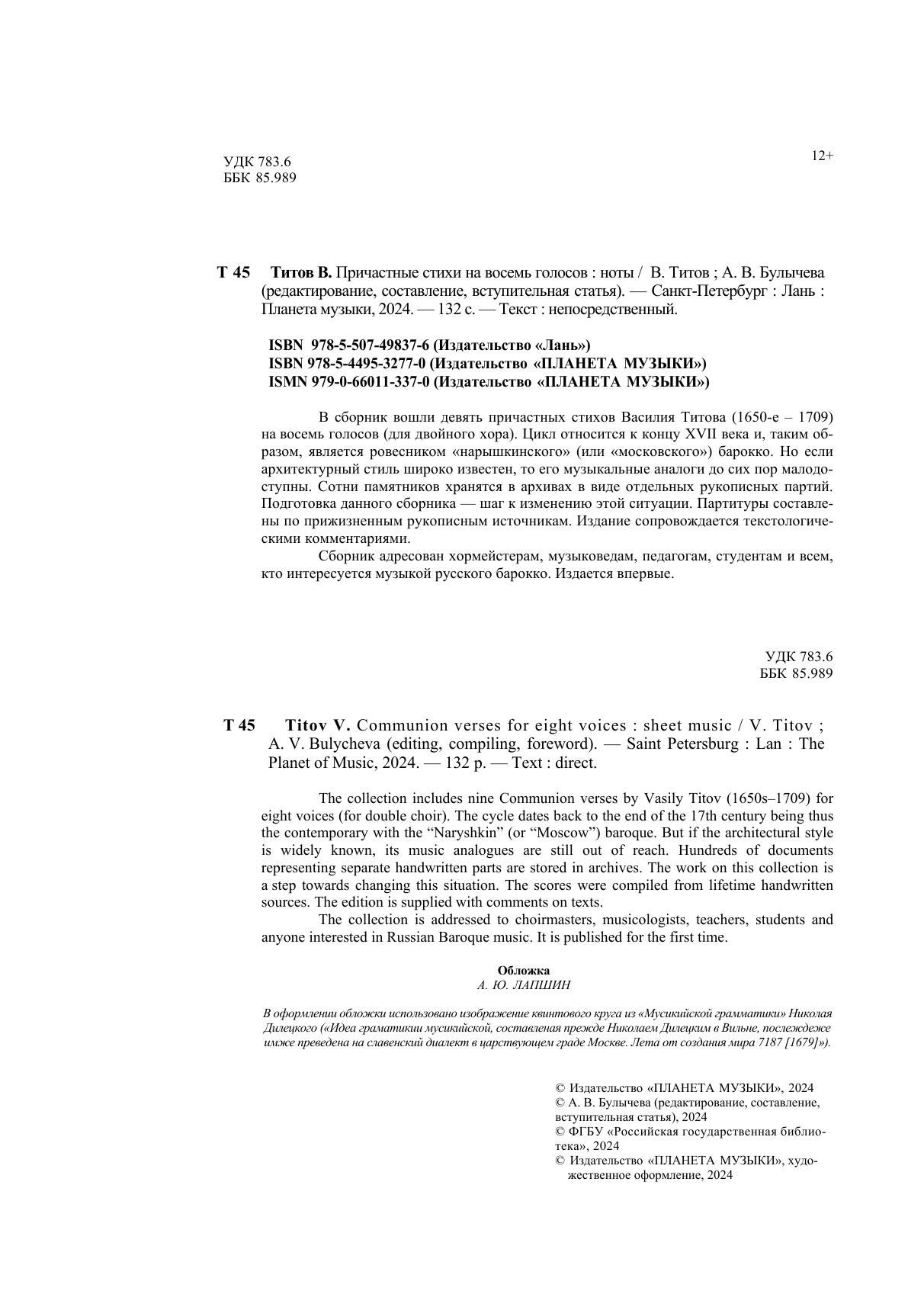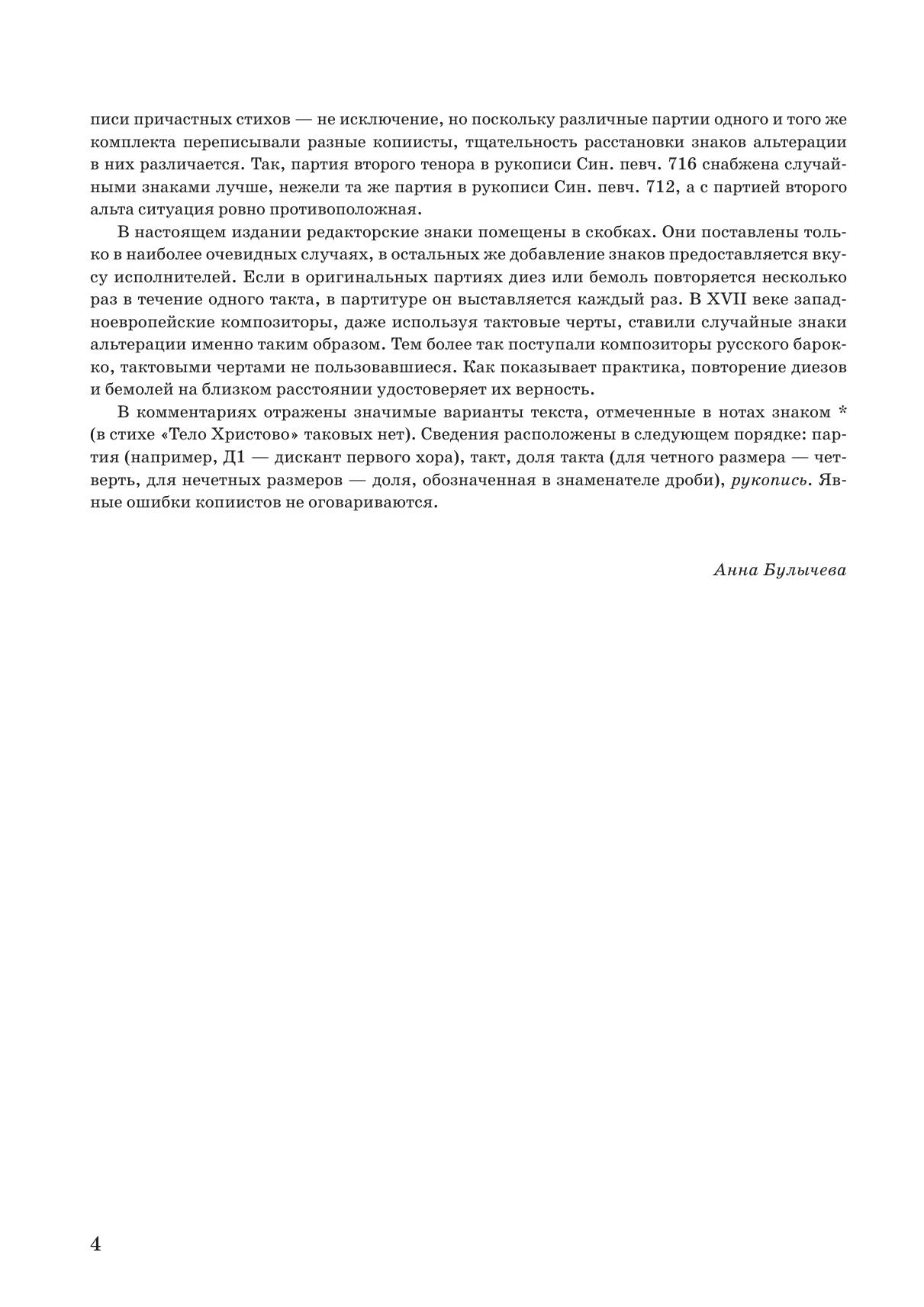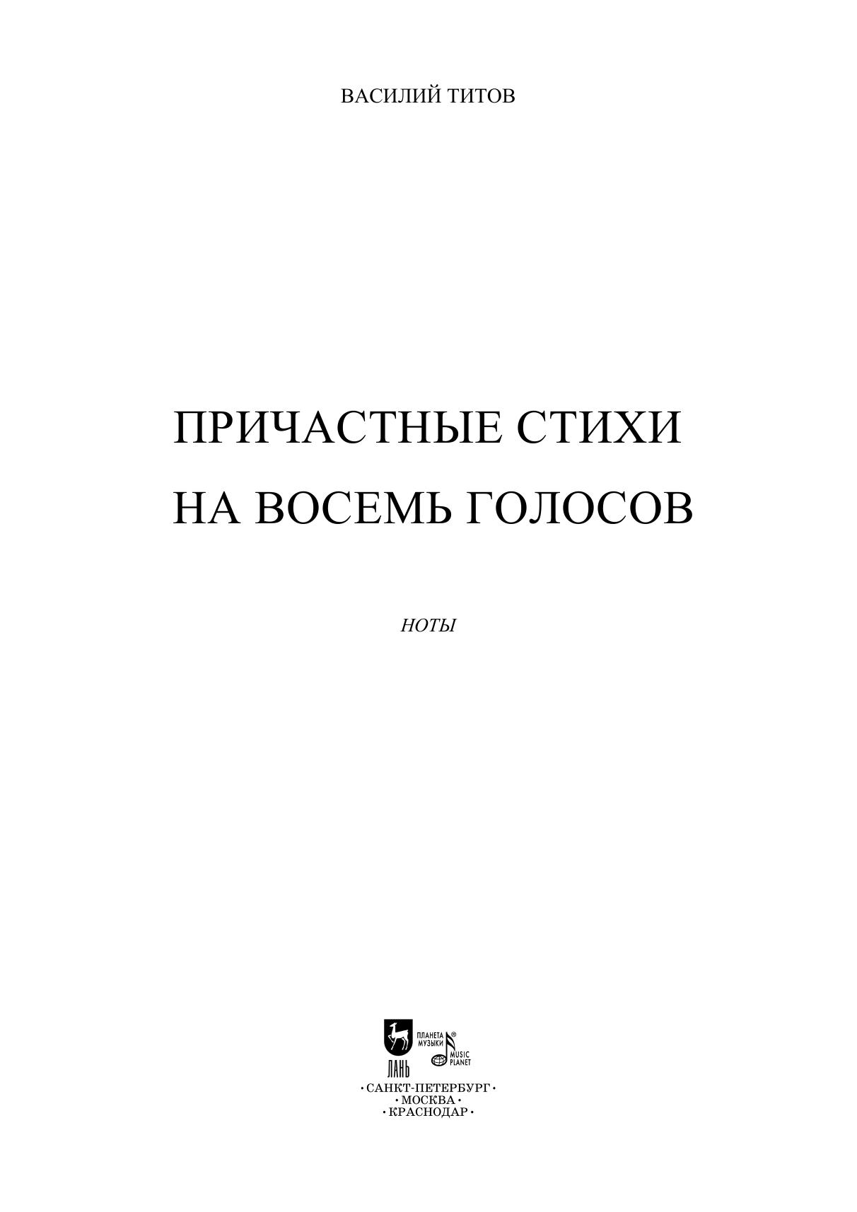 В сборник вошли девять причастных стихов Василия Титова (1650-е – 1709) на восемь голосов (для двойного хора). Цикл относится к концу XVII века и, таким образом, является ровесником «нарышкинского» (или «московского») барокко. Но если архитектурный стиль широко известен, то его музыкальные аналоги до сих пор малодоступны. Сотни памятников хранятся в архивах в виде отдельных рукописных партий. Подготовка данного сборника – шаг к изменению этой ситуации. Партитуры составлены по прижизненным рукописным источникам. Издание сопровождается текстологическими комментариями. Сборник адресован хормейстерам, музыковедам, педагогам, студентам и всем, кто интересуется музыкой русского барокко. Издается впервые. The collection includes nine Communion verses by Vasily Titov (1650s–1709) for eight voices (for double choir). The cycle dates back to the end of the 17th century being thus the contemporary with the “Naryshkin” (or “Moscow”) baroque. But if the architectural style is widely known, its music analogues are still out of reach. Hundreds of documents representing separate handwritten parts are stored in archives. The work on this collection is a step towards changing this situation. The scores were compiled from lifetime handwritten sources. The edition is supplied with comments on texts. The collection is addressed to choirmasters, musicologists, teachers, students and anyone interested in Russian Baroque music. It is published for the first time.