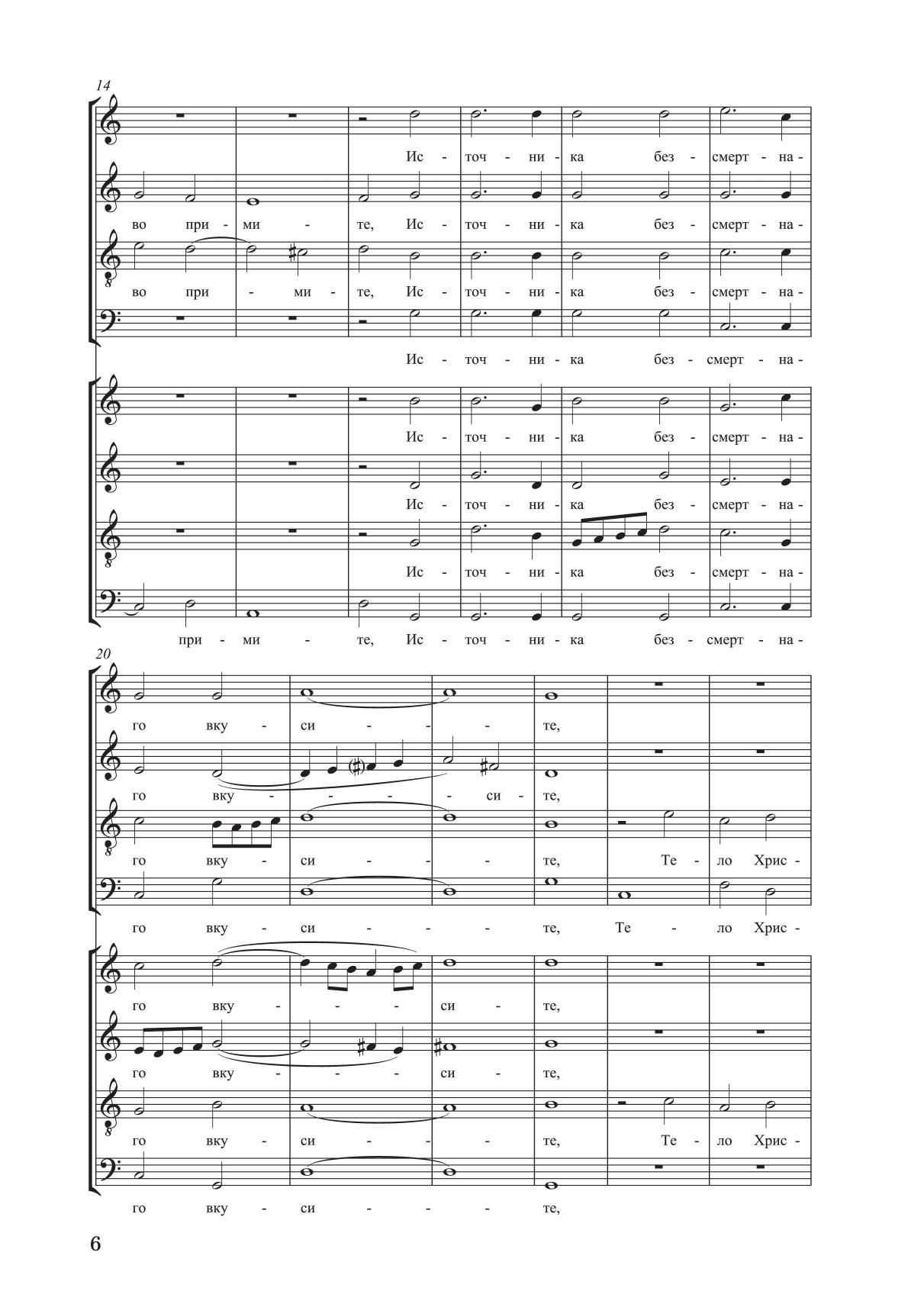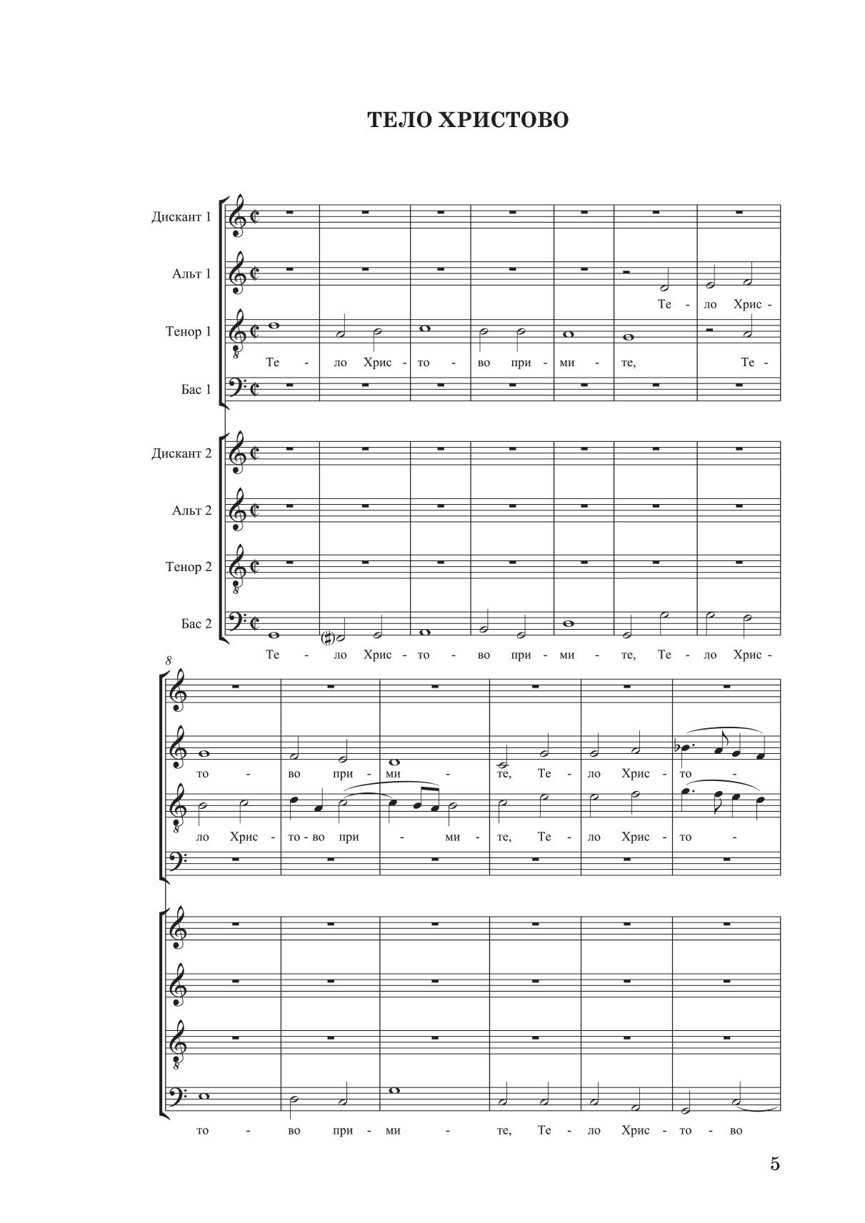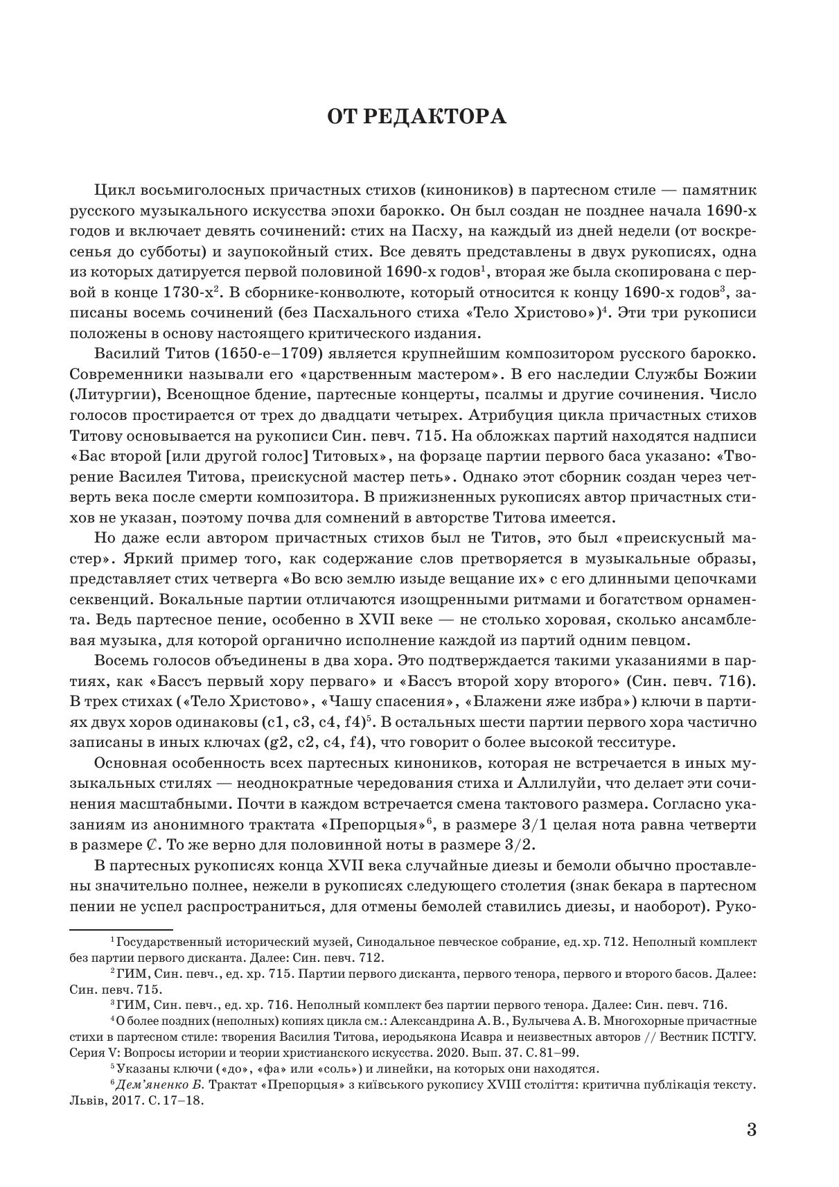 В сборник вошли девять причастных стихов Василия Титова (1650-е – 1709) на восемь голосов (для двойного хора). Цикл относится к концу XVII века и, таким образом, является ровесником «нарышкинского» (или «московского») барокко. Но если архитектурный стиль широко известен, то его музыкальные аналоги до сих пор малодоступны. Сотни памятников хранятся в архивах в виде отдельных рукописных партий. Подготовка данного сборника – шаг к изменению этой ситуации. Партитуры составлены по прижизненным рукописным источникам. Издание сопровождается текстологическими комментариями. Сборник адресован хормейстерам, музыковедам, педагогам, студентам и всем, кто интересуется музыкой русского барокко. Издается впервые. The collection includes nine Communion verses by Vasily Titov (1650s–1709) for eight voices (for double choir). The cycle dates back to the end of the 17th century being thus the contemporary with the “Naryshkin” (or “Moscow”) baroque. But if the architectural style is widely known, its music analogues are still out of reach. Hundreds of documents representing separate handwritten parts are stored in archives. The work on this collection is a step towards changing this situation. The scores were compiled from lifetime handwritten sources. The edition is supplied with comments on texts. The collection is addressed to choirmasters, musicologists, teachers, students and anyone interested in Russian Baroque music. It is published for the first time.