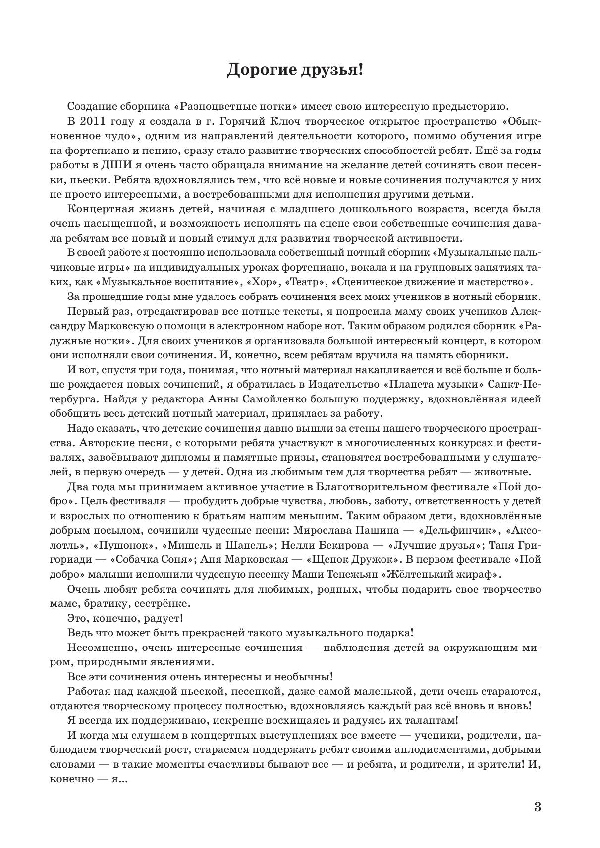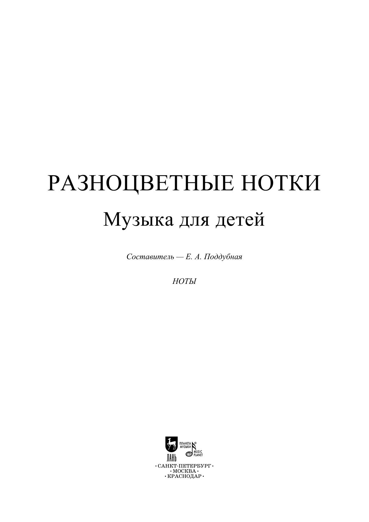 Вы держите в руках не обычный сборник, а удивительные и уникальные «Разноцветные нотки» – первое в России издание, состоящее из музыки, написанной детьми. В «Разноцветных нотках» собраны песенки, пьесы и высказывания о музыке учеников Е. А. Поддубной – музыканта, педагога, автора детских песен, игр, сказок, руководителя Творческого открытого пространства «Обыкновенное чудо». На страницах сборника самые маленькие музыканты воплотили в колыбельных и считалках, вальсах и маршах образы родных и близких людей, природных явлений, животных и птиц – свои необыкновенные чувства и эмоции. Старшие детки сумели передать в музыке радость первых открытий и путешествий, времени, когда появляются настоящие друзья, и мир становится всё интересней! Сборник понравится юным музыкантам, станет вдохновением для педагогов и непременно привлечет внимание любителей музыки. Here you have not an ordinary collection, but an amazing and unique “Multi-Coloured Little Music Notes”, the first collection in Russia consisting of music written by children. The “Multi-Coloured Little Music Notes” includes songs, pieces and phrases about music by the students of E. A. Poddubnaya, the musician, teacher, author of children’s songs, games, fairy tales, director of the Creative Open Space “The Ordinary Miracle”. The youngest musicians expressed their extraordinary feelings and emotions, the images of their families and friends, scenes of nature, animals and birds in lullabies and counting rhymes, waltzes and marches of this collection. The older children managed to convey in music the joy of first discoveries and trips, joy of the time when real friends appear and the world around becomes more and more interesting! The collection will appeal to young musicians, will become an inspiration for teachers and will certainly attract the attention of music lovers.