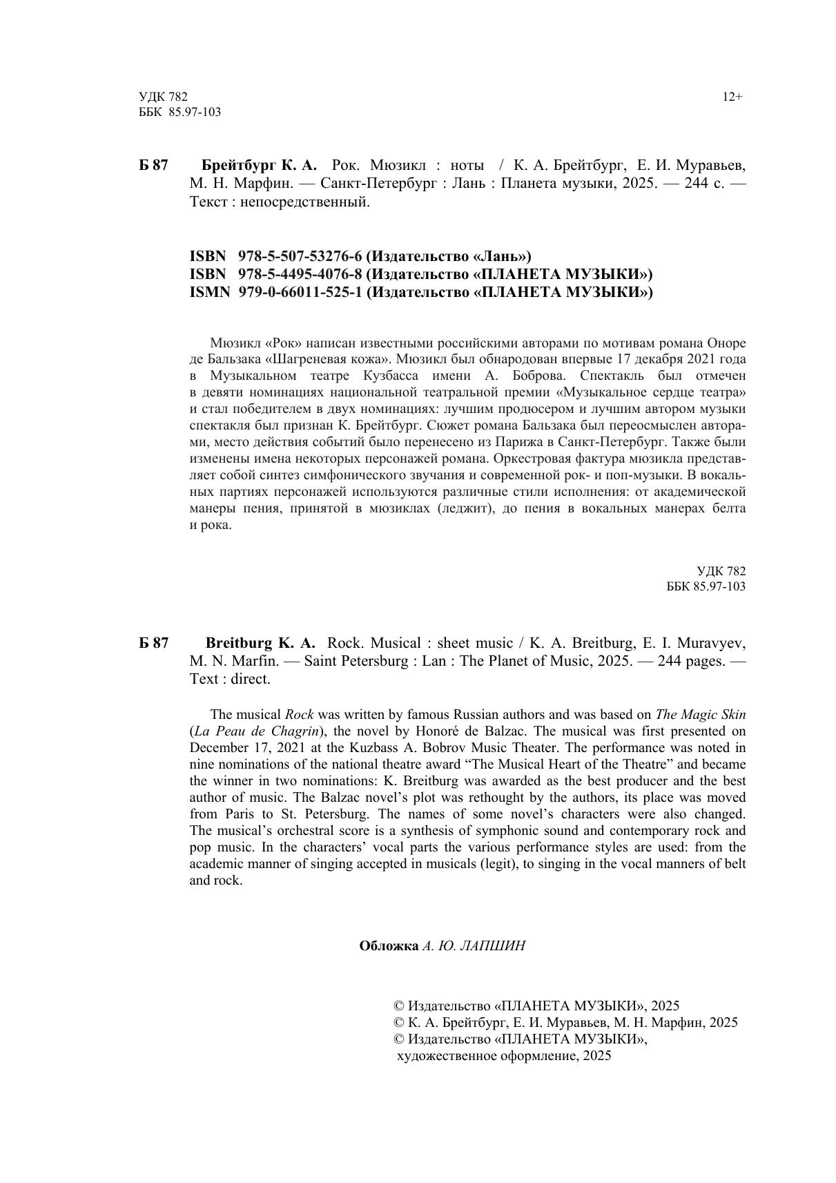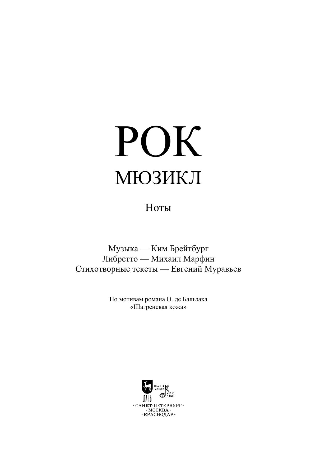 Мюзикл «РОК» написан известными российскими авторами по мотивам романа Оноре де Бальзака «Шагреневая кожа». Мюзикл был обнародован впервые 17 декабря 2021 года в Музыкальном театре Кузбасса имени А. Боброва. Спектакль был отмечен в девяти номинациях национальной театральной премии «Музыкальное сердце театра» и стал победителем в двух номинациях: лучшим продюсером и лучшим автором музыки спектакля был признан К. Брейтбург. Сюжет романа Бальзака был переосмыслен авторами, место действия событий было перенесено из Парижа в Санкт-Петербург. Также были изменены имена некоторых персонажей романа. Оркестровая фактура мюзикла представляет собой синтез симфоничесого звучания и современной рок- и поп-музыки. В вокальных партиях персонажей используются различные стили исполнения: от академической манеры пения, принятой в мюзиклах (леджит), до пения в вокальных манерах белта и рока. The musical ROCK was written by famous Russian authors and was based on The Magic Skin (La Peau de Chagrin), the novel by Honoré de Balzac. The musical was first presented on December 17, 2021 at the Kuzbass A. Bobrov Music Theater. The performance was noted in nine nominations of the national theatre award “The Musical Heart of the Theatre” and became the winner in two nominations: K. Breitburg was awarded as the best producer and the best author of music. The Balzac novel’s plot was rethought by the authors, its place was moved from Paris to St. Petersburg. The names of some novel’s characters were also changed. The musical’s orchestral score is a synthesis of symphonic sound and contemporary rock and pop music. In the characters’ vocal parts the various performance styles are used: from the academic manner of singing accepted in musicals (legit), to singing in the vocal manners of belt and rock.