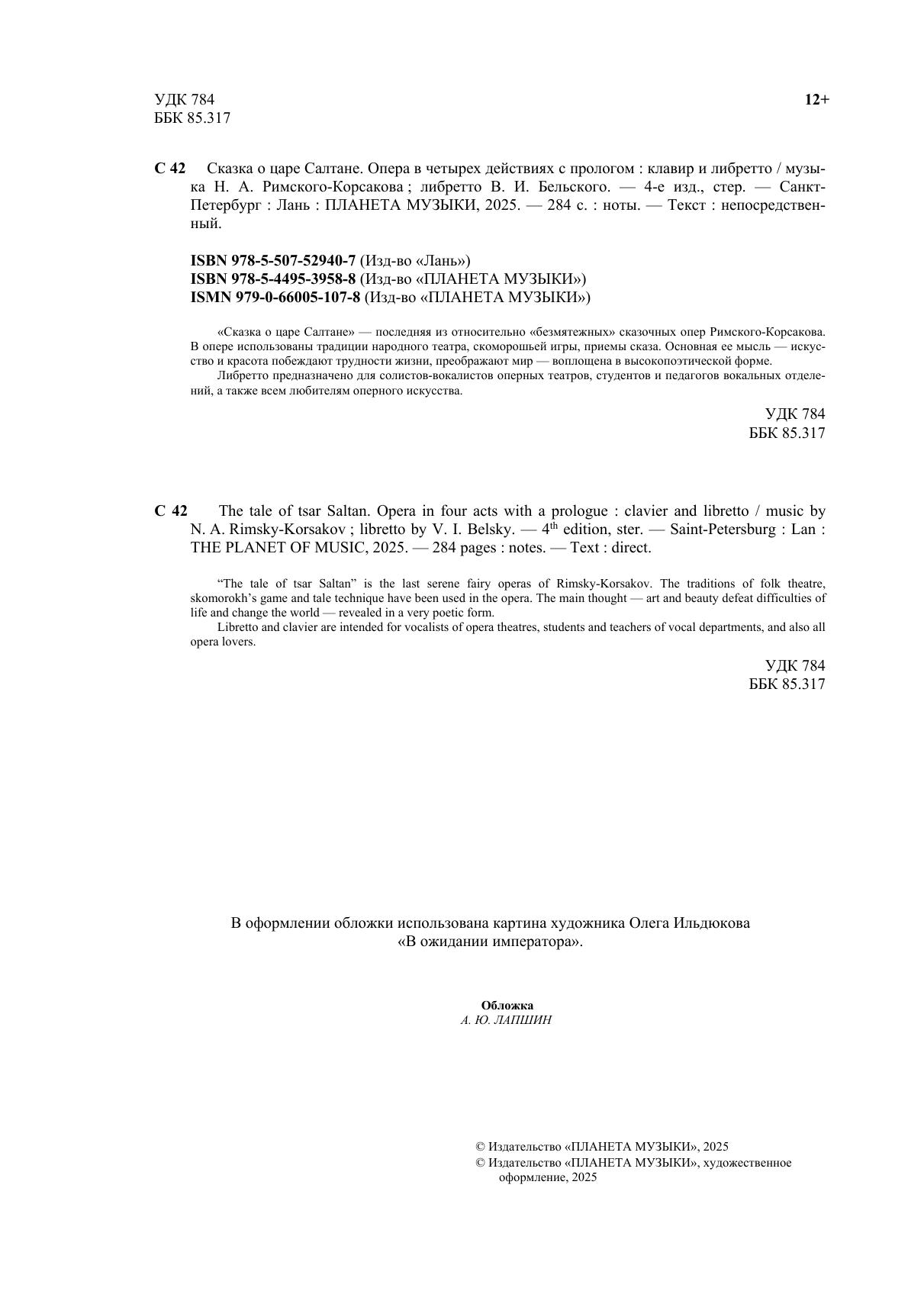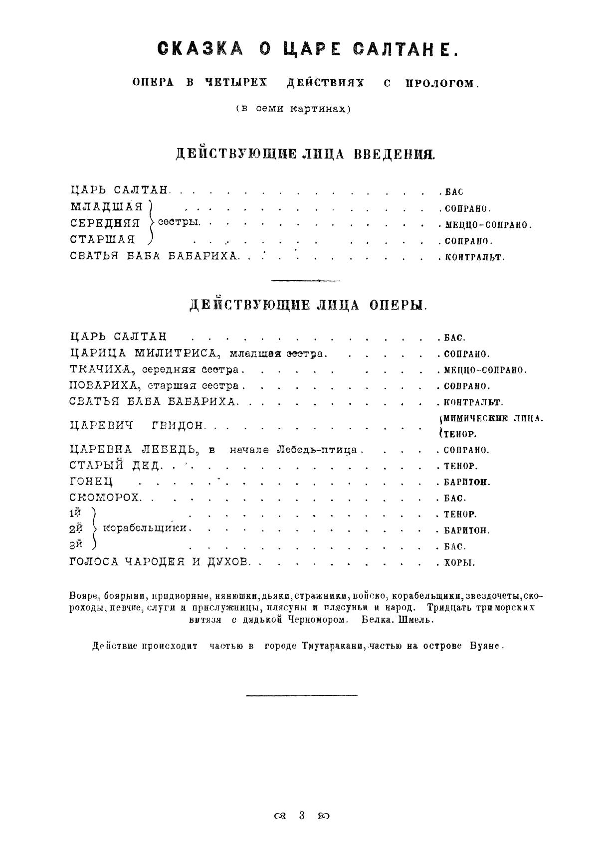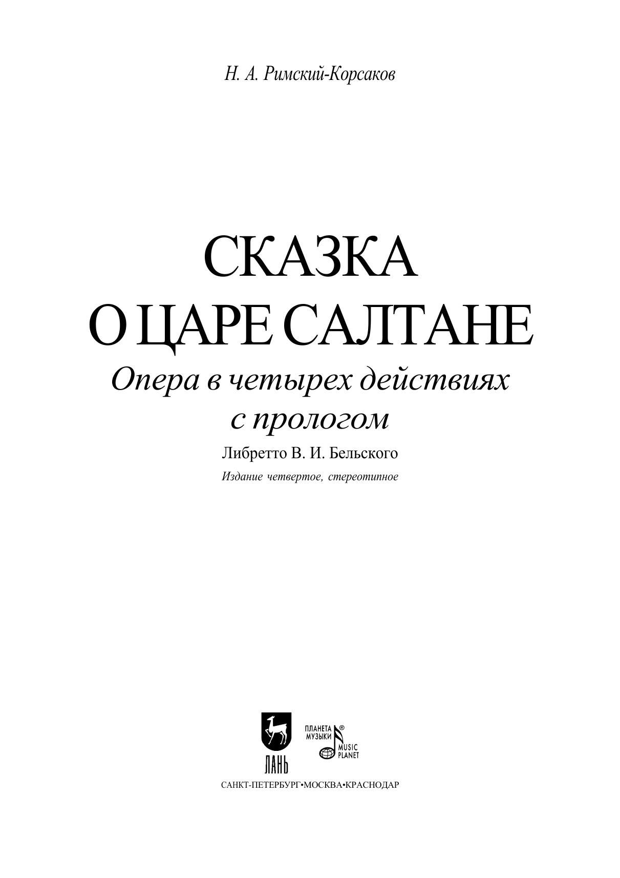 «Сказка о царе Салтане» — последняя из относительно «безмятежных» сказочных опер Римского-Корсакова. В опере использованы традиции народного театра, скоморошьей игры, приемы сказа. Основная ее мысль — искусство и красота побеждают трудности жизни, преображают мир — воплощена в высокопоэтической форме. Либретто предназначено для солистов-вокалистов оперных театров, студентов и педагогов вокальных отделений, а также всем любителям оперного искусства.