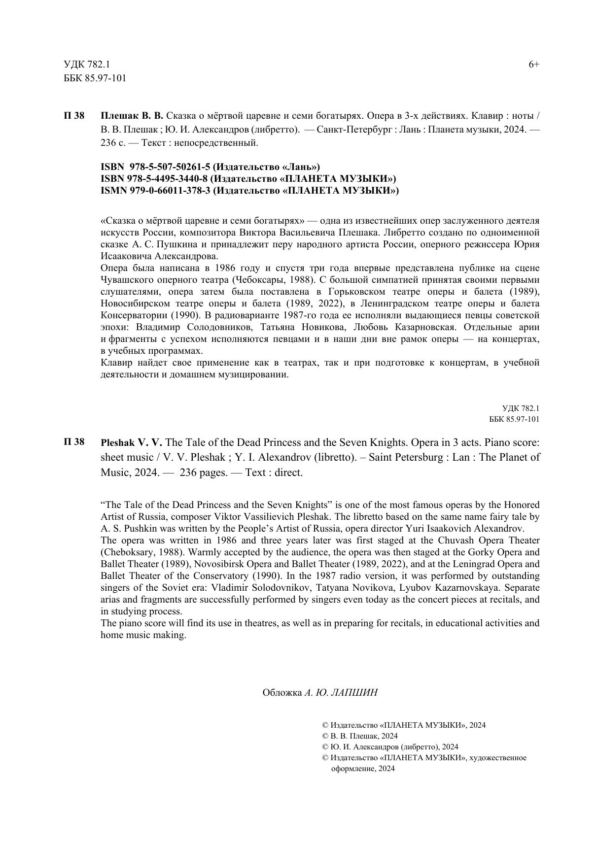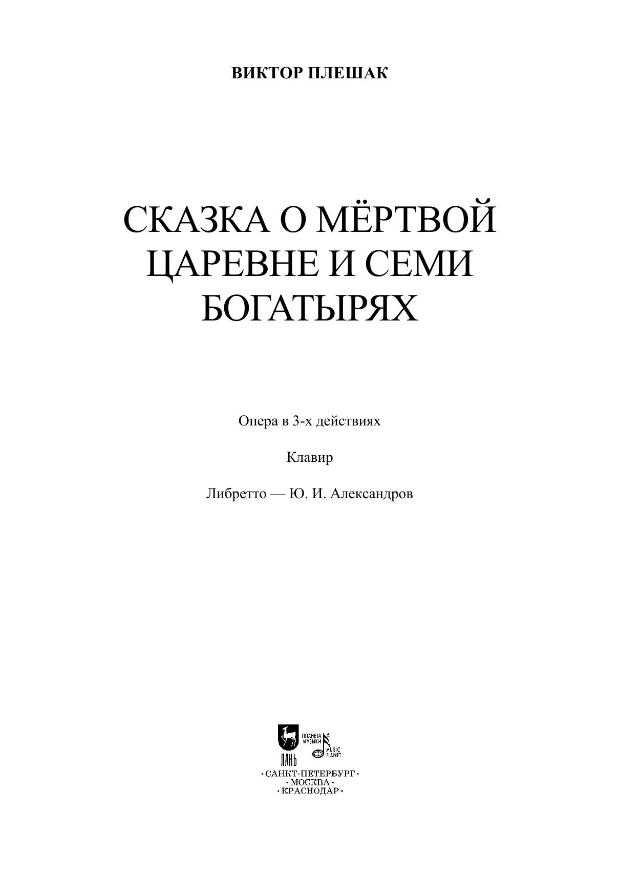 «Сказка о мёртвой царевне и семи богатырях» - одна из известнейших опер заслуженного деятеля искусств России, композитора Виктора Васильевича Плешака. Либретто создано по одноименной сказке А. С. Пушкина и принадлежит перу народного артиста России, оперного режиссера - Александрова Юрия Исааковича. Опера была написана в 1986 году и, спустя три года, впервые представлена публике на сцене Чувашского оперного театра (Чебоксары, 1988). С большой симпатией принятая своими первыми слушателями, опера затем была поставлена в Горьковском театре оперы и балета (1989), Новосибирском театре оперы и балета (1989, 2022), в Ленинградском театре оперы и балета Консерватории (1990). В радио варианте 1987-го года ее исполняли выдающиеся певцы советской эпохи: Владимир Солодовников, Татьяна Новикова, Любовь Казарновская. Отдельные арии и фрагменты с успехом исполняются певцами и в наши дни вне рамок оперы – на концертах, в учебных программах. Клавир найдет свое применение как в театрах, так и при подготовке к концертам, в учебной деятельности и домашнем музицировании. “The Tale of the Dead Princess and the Seven Knights” is one of the most famous operas by the Honored Artist of Russia, composer Viktor Vassilievich Pleshak. The libretto based on the same name fairy tale by A. S. Pushkin was written by the People’s Artist of Russia, opera director Yuri Isaakovich Alexandrov. The opera was written in 1986 and three years later was first staged at the Chuvash Opera Theater (Cheboksary, 1988). Warmly accepted by the audience, the opera was then staged at the Gorky Opera and Ballet Theater (1989), Novosibirsk Opera and Ballet Theater (1989, 2022), and at the Leningrad Opera and Ballet Theater of the Conservatory (1990). In the 1987 radio version, it was performed by outstanding singers of the Soviet era: Vladimir Solodovnikov, Tatyana Novikova, Lyubov Kazarnovskaya. Separate arias and fragments are successfully performed by singers even today as the concert pieces at recitals, and in studying process. The piano score will find its use in theatres, as well as in preparing for recitals, in educational activities and home music making.