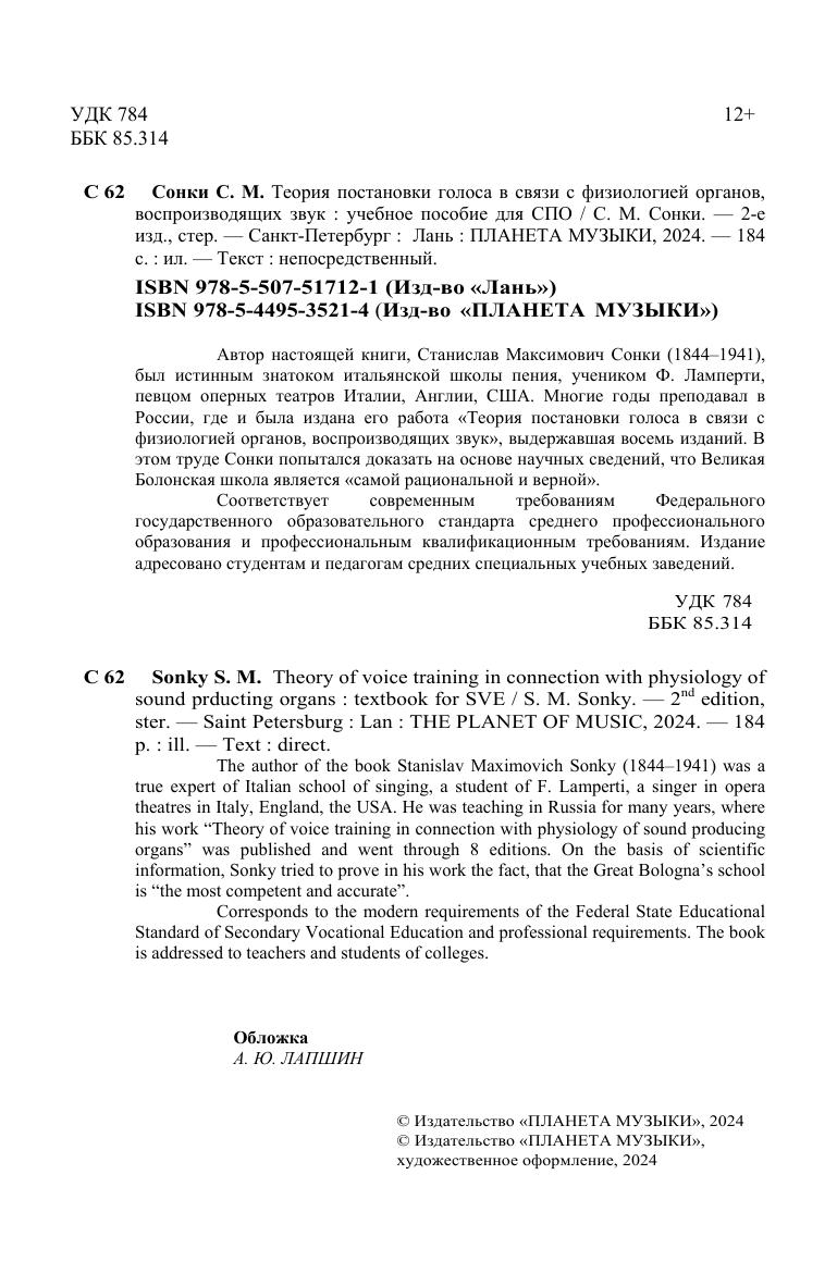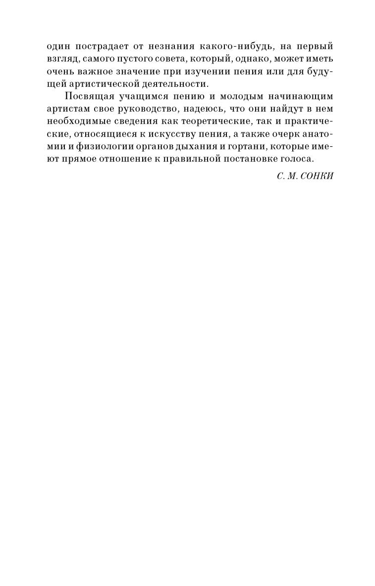 Автор настоящей книги, Станислав Максимович Сонки (1844-1941), был истинным знатоком Итальянской школы пения, учеником Ф. Ламперти, певцом оперных театров Италии, Англии, США. Многие годы преподавал в России, где и была издана его работа «Теория постановки голоса в связи с физиологией органов, воспроизводящих звук», выдержавшая 8 изданий. В этом труде Сонки попытался доказать на основе научных сведений, что Великая Болонская школа является «самой рациональной и верной». Издание адресовано студентам и педагогам средних специальных учебных заведений.