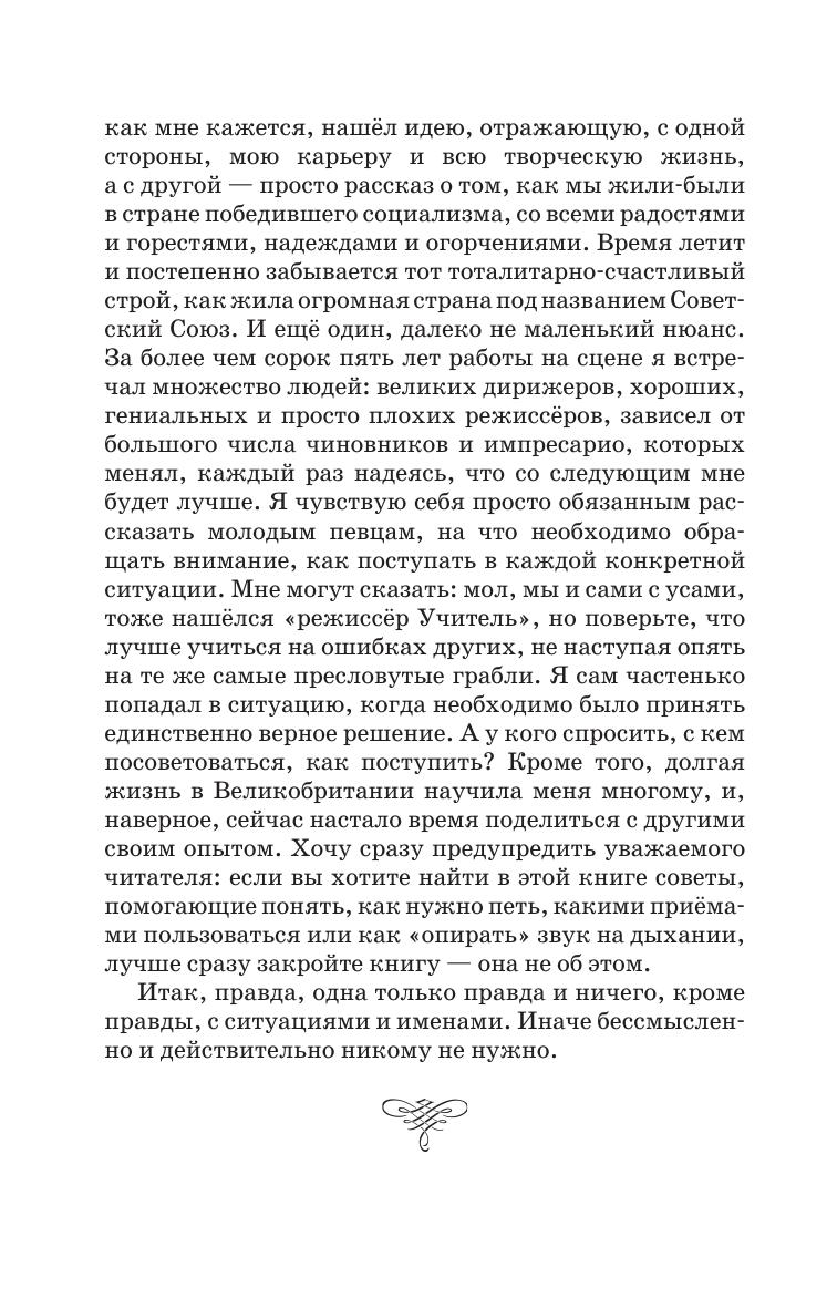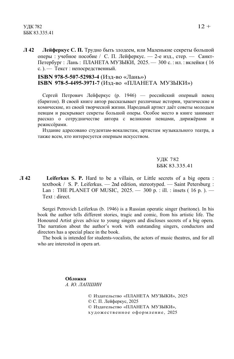 Сергей Петрович Лейферкус (р. 1946) — российский оперный певец (баритон). В своей книге автор рассказывает различные истории, трагические и комические, из своей творческой жизни. Народный артист даёт советы молодым певцам и раскрывает секреты большой оперы. Особое место в книге занимает рассказ о сотрудничестве автора с великими певцами, дирижёрами и режиссёрами. Издание адресовано студентам-вокалистам, артистам музыкального театра, а также всем, кто интересуется оперным искусством..