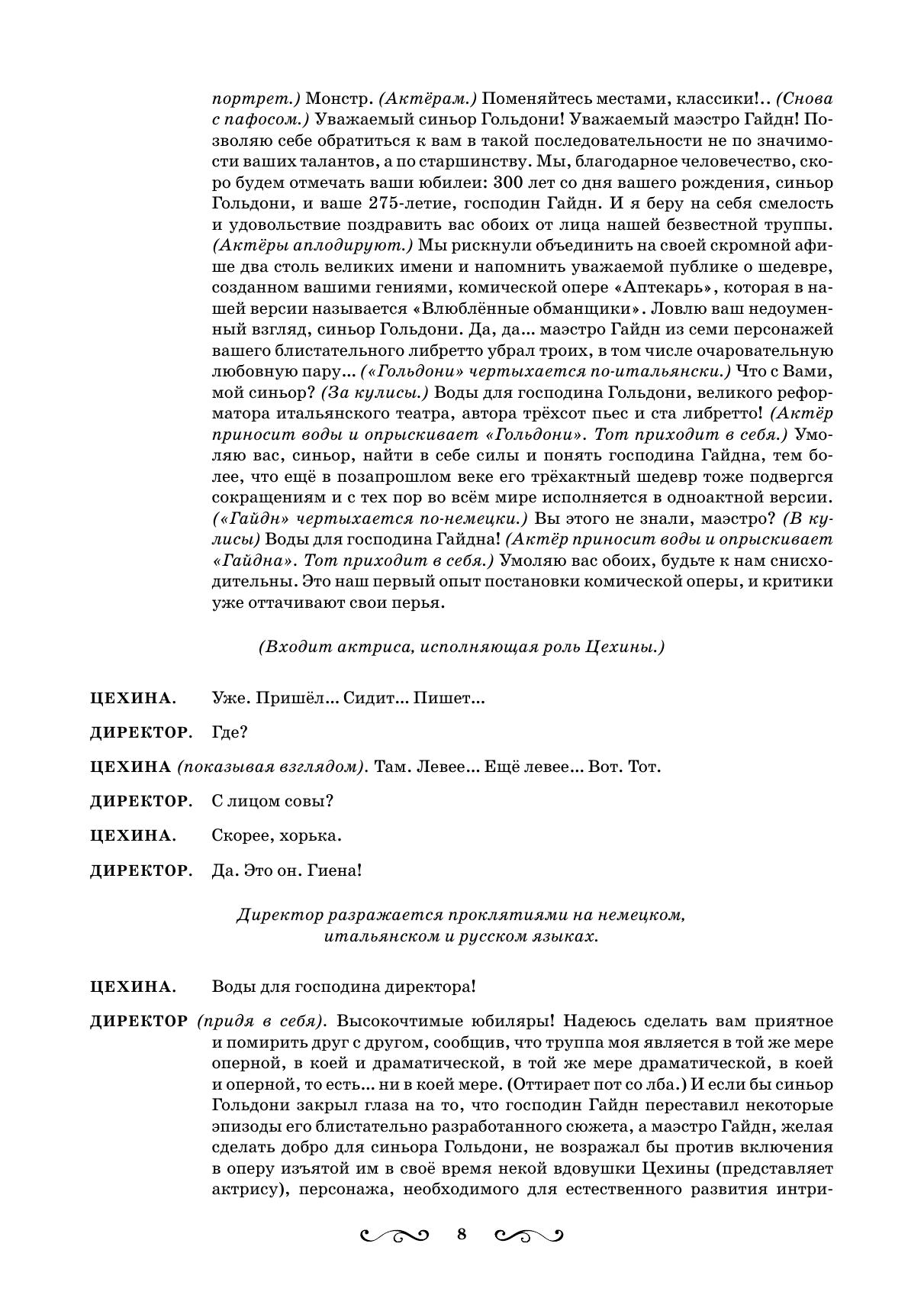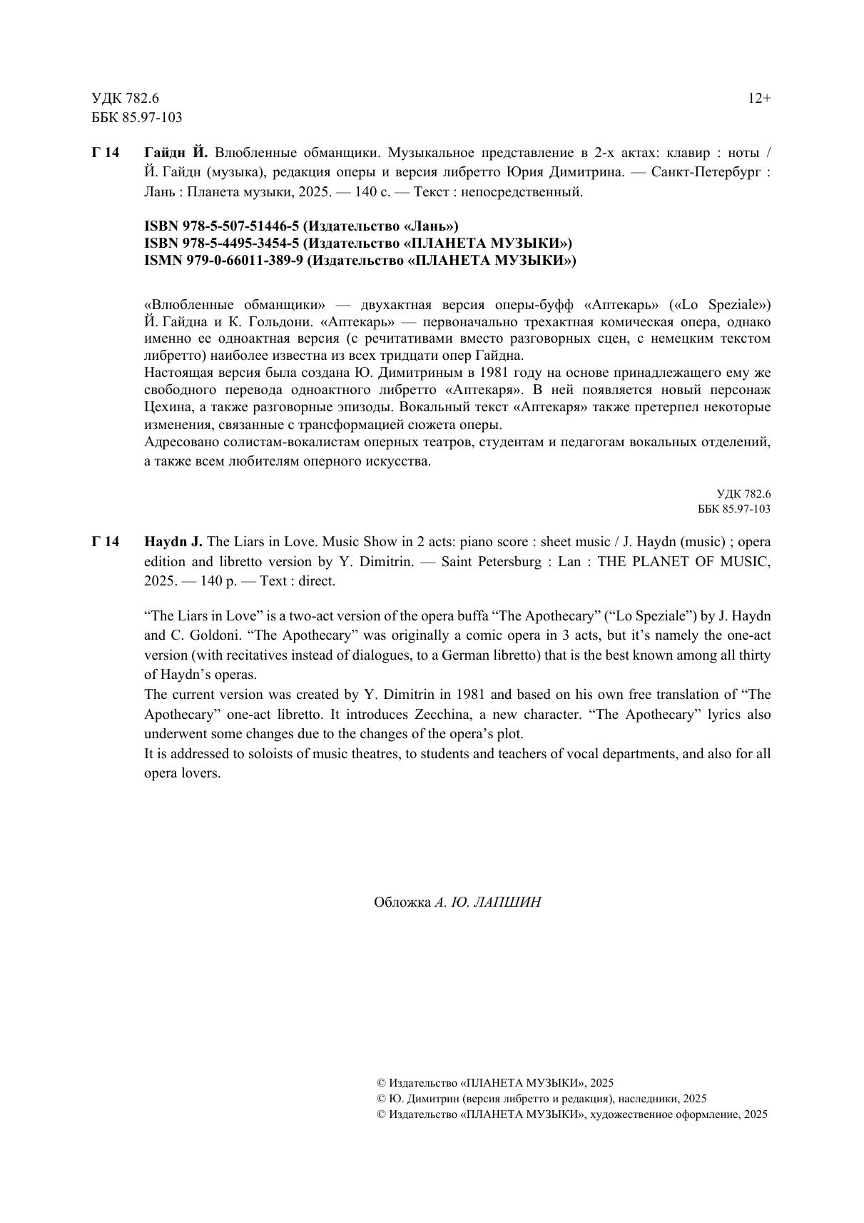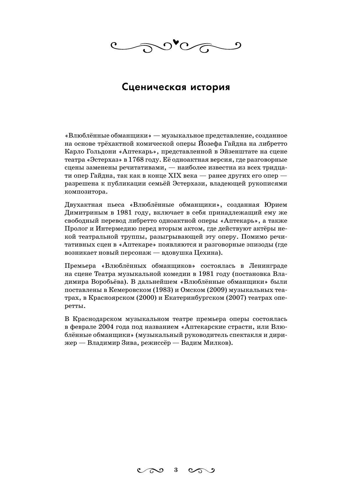 «Влюблённые обманщики» – двухактная версия оперы-буфф «Аптекарь» («Lo Speziale») Й. Гайдна и К. Гольдони. «Аптекарь» – первоначально трехактная комическая опера, однако именно ее одноактная версия (с речитативами вместо разговорных сцен, с немецким текстом либретто) наиболее известна из всех тридцати опер Гайдна. Настоящая версия была создана Ю. Димитриным в 1981 году на основе принадлежащего ему же свободного перевода одноактного либретто «Аптекаря». В ней появляется новый персонаж Цехина, а также разговорные эпизоды, в основе которых лежат фрагменты некоторых сцен комедии К. Гольдони «Специалист». Вокальный текст «Аптекаря» также претерпел некоторые изменения, связанные с трансформацией сюжета оперы. Адресовано солистам-вокалистам оперных театров, студентам и педагогам вокальных отделений, а также всем любителям оперного искусства. “The Liars in Love” is a two-act version of the opera buffa “The Apothecary” (“Lo Speziale”) by J. Haydn and C. Goldoni. “The Apothecary” was originally a comic opera in 3 acts, but it’s namely the one-act version (with recitatives instead of dialogues, to a German libretto) that is the best known among all thirty of Haydn’s operas. The current version was created by Y. Dimitrin in 1981 and based on his own free translation of “The Apothecary” one-act libretto. It introduces Zecchina, a new character. “The Apothecary” lyrics also underwent some changes due to the changes of the opera’s plot. It is addressed to soloists of music theatres, to students and teachers of vocal departments, and also for all opera lovers.