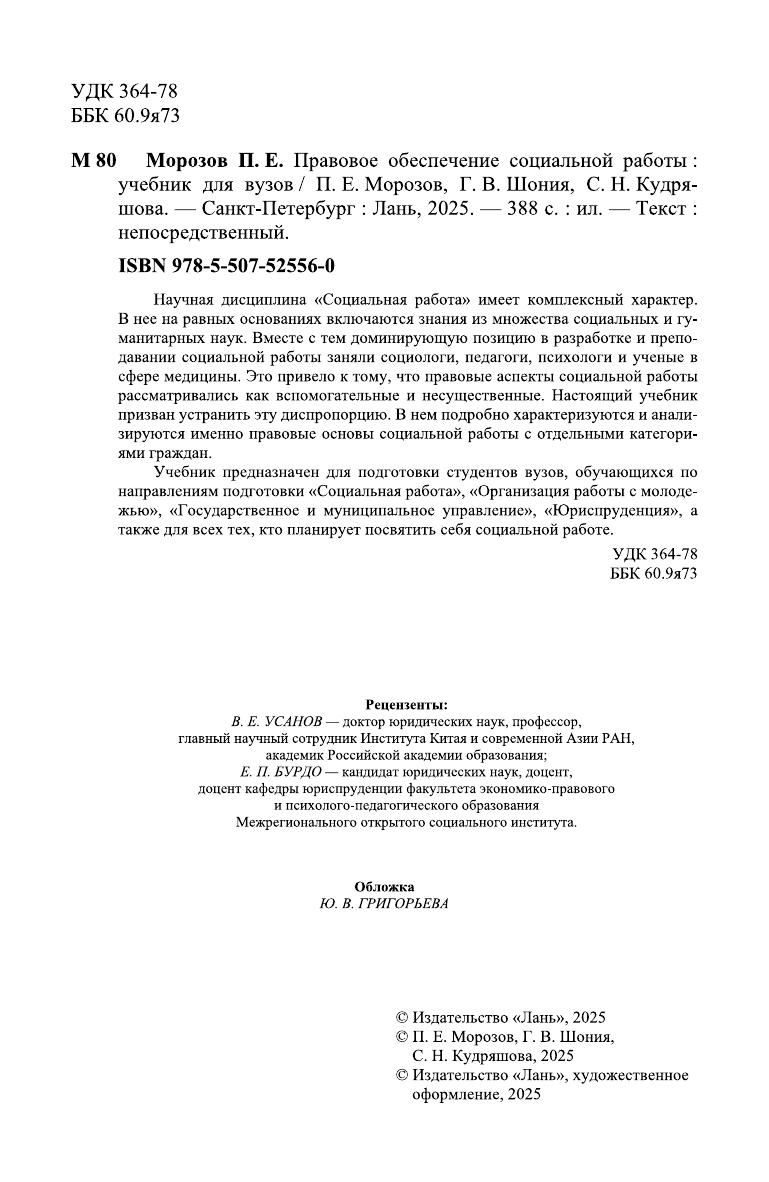 Научная дисциплина «Социальная работа» имеет комплексный характер. В нее на равных основаниях включаются знания из множества социальных и гуманитарных наук. Вместе с тем доминирующую позицию в разработке и преподавании социальной работы заняли социологи, педагоги, психологи и ученые в сфере медицины. Это привело к тому, что правовые аспекты социальной работы рассматривались как вспомогательные и несущественные. Настоящий учебник призван устранить эту диспропорцию. В нем подробно характеризуются и анализируются именно правовые основы социальной работы с отдельными категориями граждан. Учебник предназначен для подготовки студентов вузов, обучающихся по направлениям подготовки «Социальная работа», «Организация работы с молодежью», «Государственное и муниципальное управление», «Юриспруденция», а также для всех тех, кто планирует посвятить себя социальной работе.
