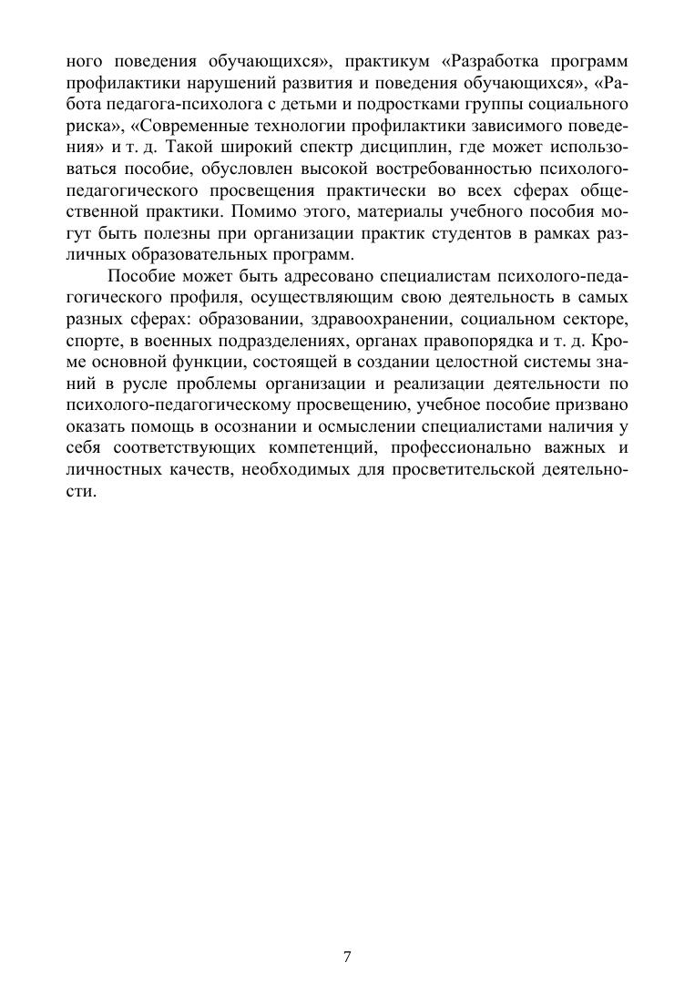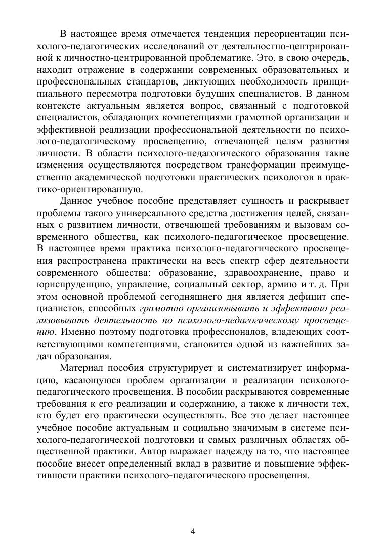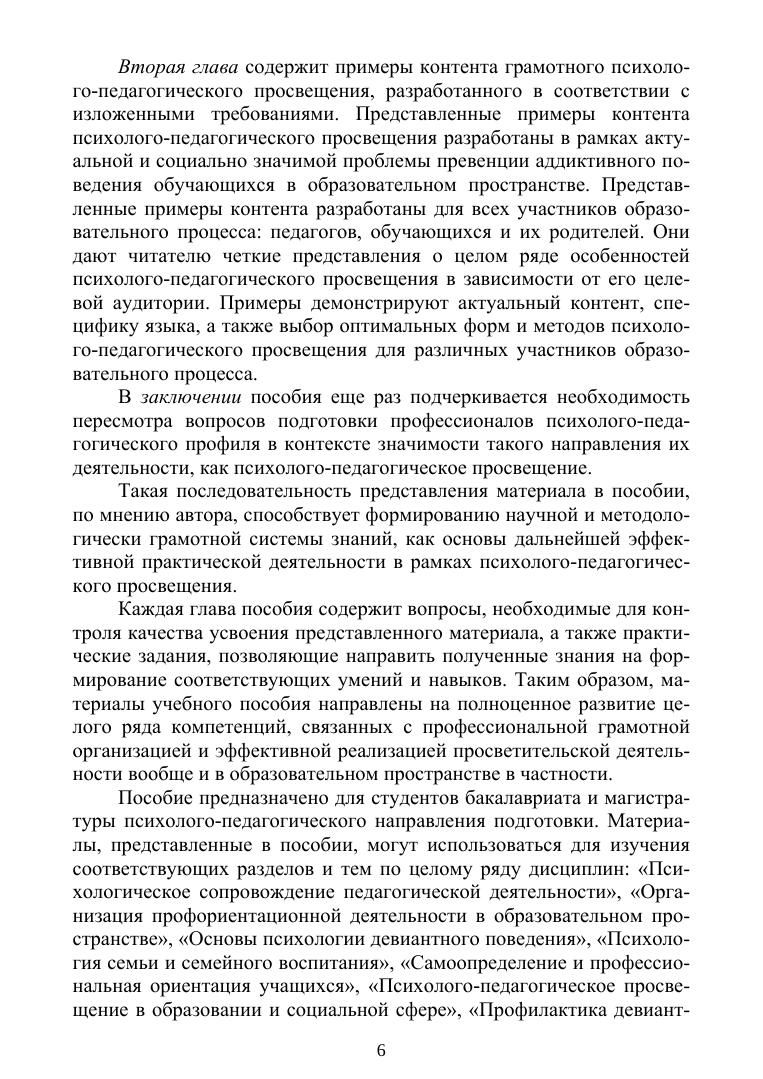 Содержание учебного пособия соответствует требованиям ФГОС ВО при изучении дисциплины «Психолого-педагогическое просвещение в образовании и социальной сфере», а также соответствующих разделов целого ряда других дисциплин. Пособие структурировано по принципу дедукции, что способствует формированию научной и методологически грамотной системы знаний, являющихся основой формирования профессиональных компетенций в рамках психолого-педагогического просвещения. Каждая глава содержит вопросы, необходимые для контроля качества усвоения материала, а также — практические задания, позволяющие направить полученные знания на формирование умений и навыков. Учебное пособие предназначено для студентов и преподавателей психолого-педагогического направления подготовки классических и педагогических университетов и институтов. Материалы пособия могут использоваться в рамках изучения целого ряда смежных дисциплин, а также при организации деятельности по психолого-педагогическому просвещению.