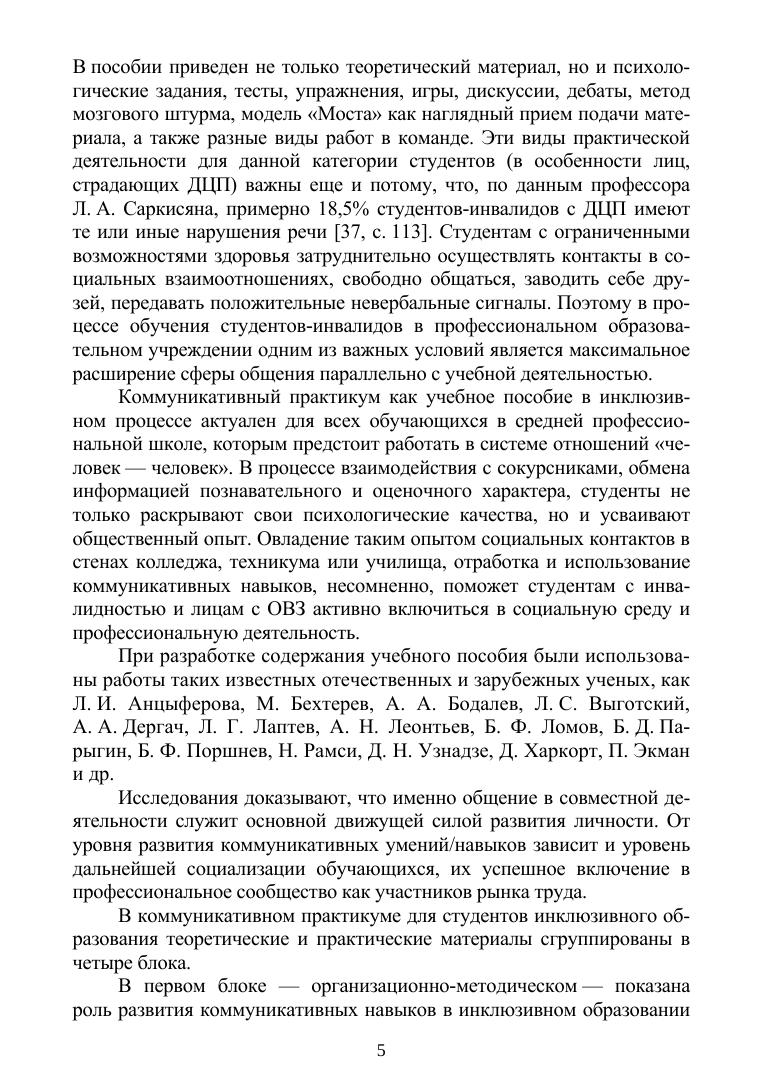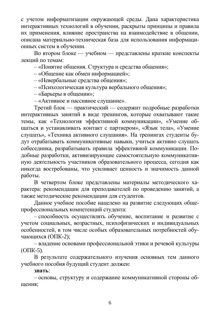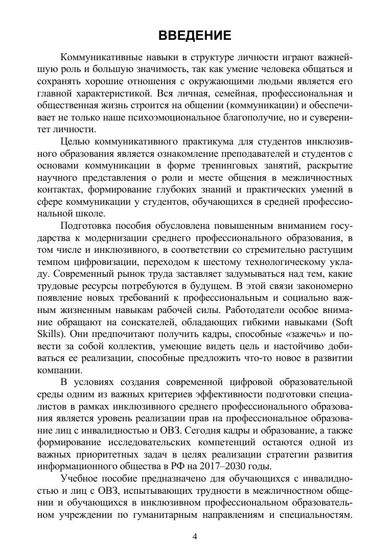 Данное пособие нацелено на ознакомление студентов с вербальными и невербальными средствами общения, что является необходимым условием формирования коммуникативной активности личности в целом. В пособии, кроме теоретического материала, дается практический блок с описанием тренингов и методические рекомендации к ним. Отличительной чертой пособия является то, что в нем учитываются особенности проведения тренингов для студентов с ограниченными возможностями здоровья в профессиональных учебных заведениях с инклюзивной формой обучения. Соответствует современным требованиям Федерального государственного образовательного стандарта среднего профессионального образования и профессиональным квалификационным требованиям. Пособие предназначено для студентов профессиональных учебных заведений психолого-педагогической направленности, но будет полезно всем студентам инклюзивных образовательных организаций как средство саморазвития и самопознания, а также преподавателям этих организаций для оказания методической помощи в проведении тренингов по развитию навыков коммуникации.