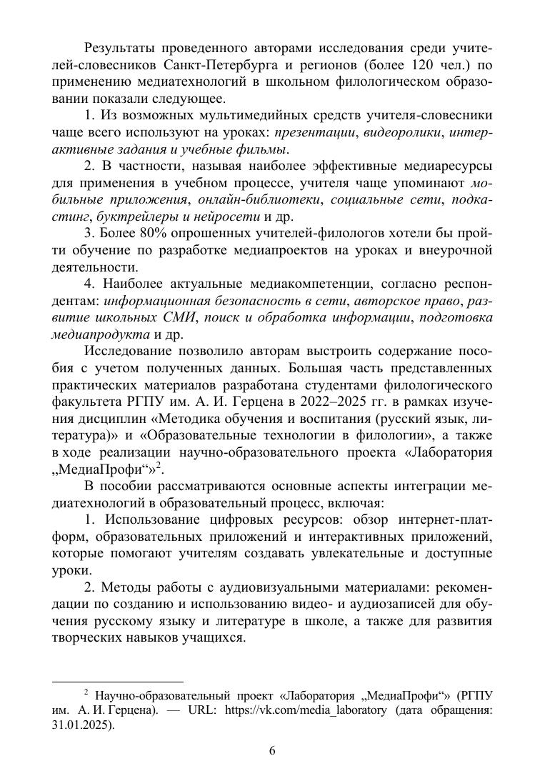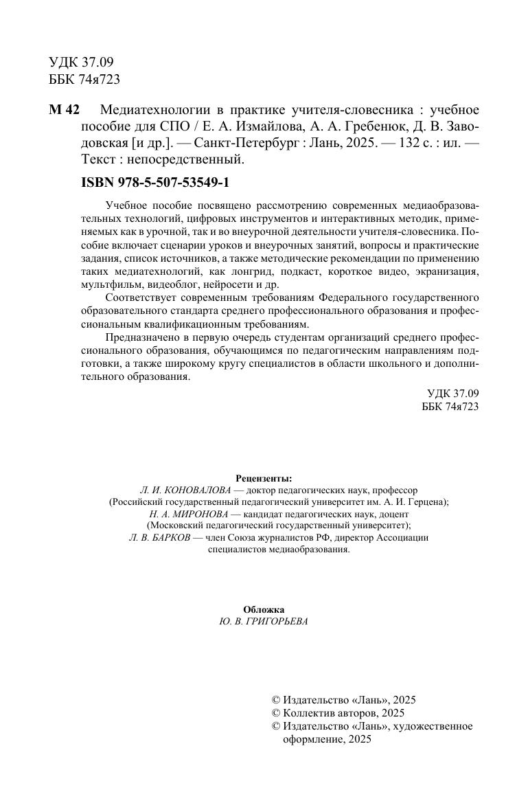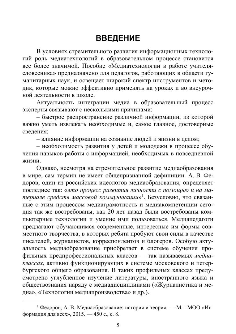 Учебное пособие посвящено рассмотрению современных медиаобразовательных технологий, цифровых инструментов и интерактивных методик, применяемых как в урочной, так и во внеурочной деятельности учителя-словесника. Пособие включает сценарии уроков и внеурочных занятий, вопросы и практические задания, список источников, а также методические рекомендации по применению таких медиатехнологий, как лонгрид, подкаст, короткое видео, экранизация, мультфильм, видеоблог, нейросети и др. Соответствует современным требованиям Федерального государственного образовательного стандарта среднего профессионального образования и профессиональным квалификационным требованиям. Предназначено в первую очередь студентам организаций среднего профессионального образования, обучающимся по педагогическим направлениям подготовки, а также широкому кругу специалистов в области школьного и дополнительного образования.