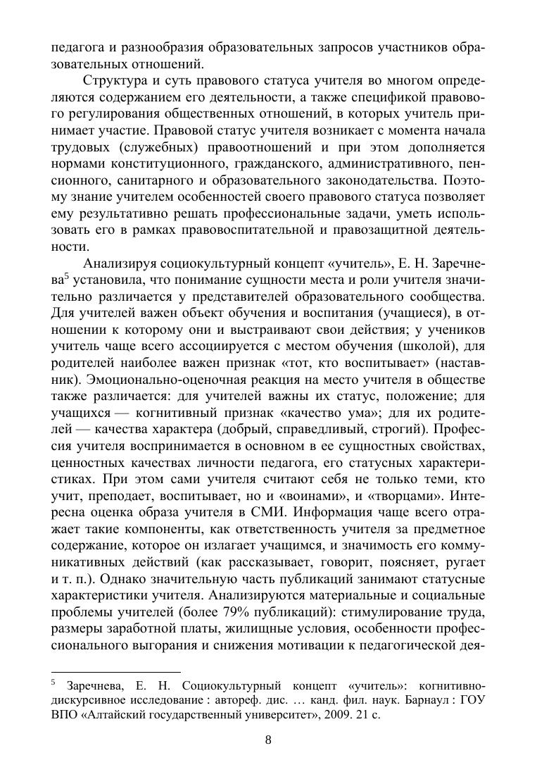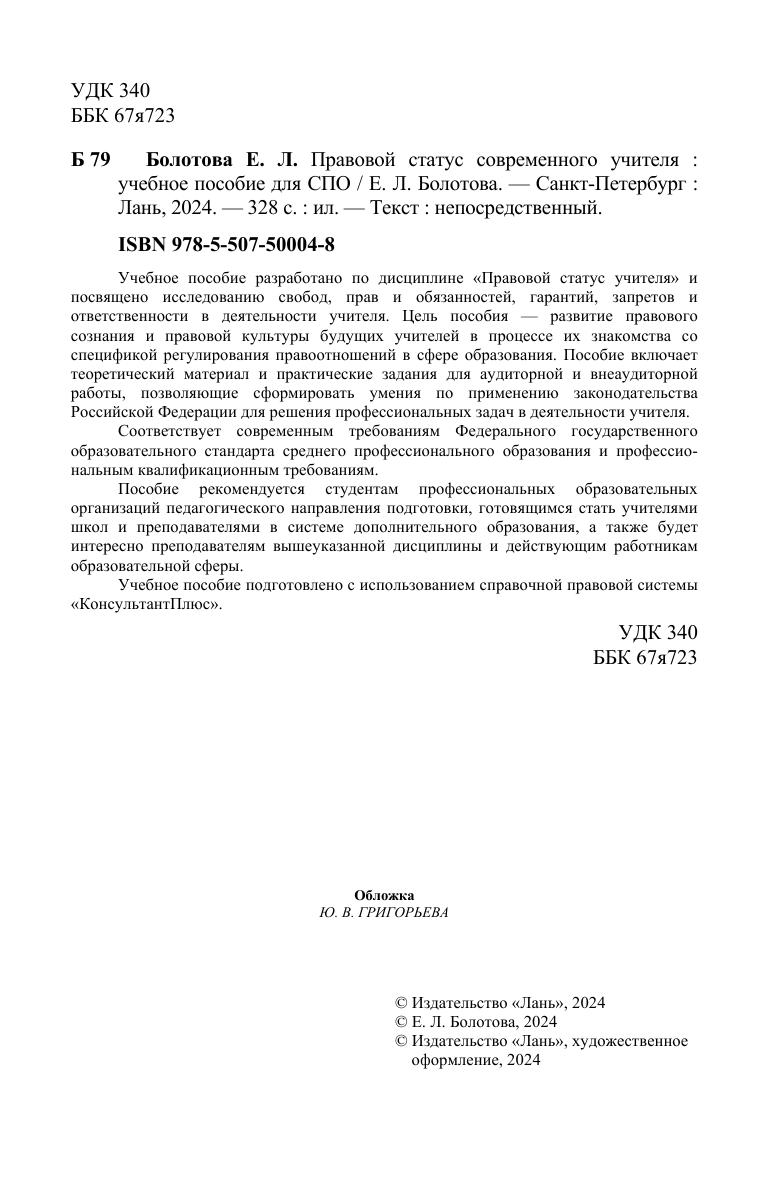 Учебное пособие разработано по дисциплине «Правовой статус учителя» и посвящено исследованию свобод, прав и обязанностей, гарантий, запретов и ответственности в деятельности учителя. Цель пособия — развитие правового сознания и правовой культуры будущих учителей в процессе их знакомства со спецификой регулирования правоотношений в сфере образования. Пособие включает теоретический материал и практические задания для аудиторной и внеаудиторной работы, позволяющие сформировать умения по применению законодательства Российской Федерации для решения профессиональных задач в деятельности учителя. Соответствует современным требованиям Федерального государственного образовательного стандарта среднего профессионального образования и профессиональным квалификационным требованиям. Пособие рекомендуется студентам профессиональных образовательных организаций педагогического направления подготовки, готовящимся стать учителями школ и преподавателями в системе дополнительного образования, а также будет интересно преподавателям вышеуказанной дисциплины и действующим работникам образовательной сферы. Учебное пособие подготовлено с использованием справочной правовой системы «КонсультантПлюс».