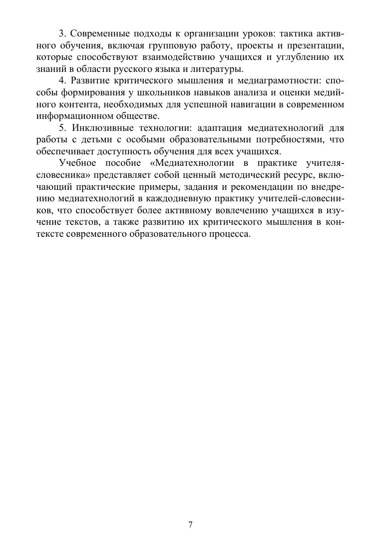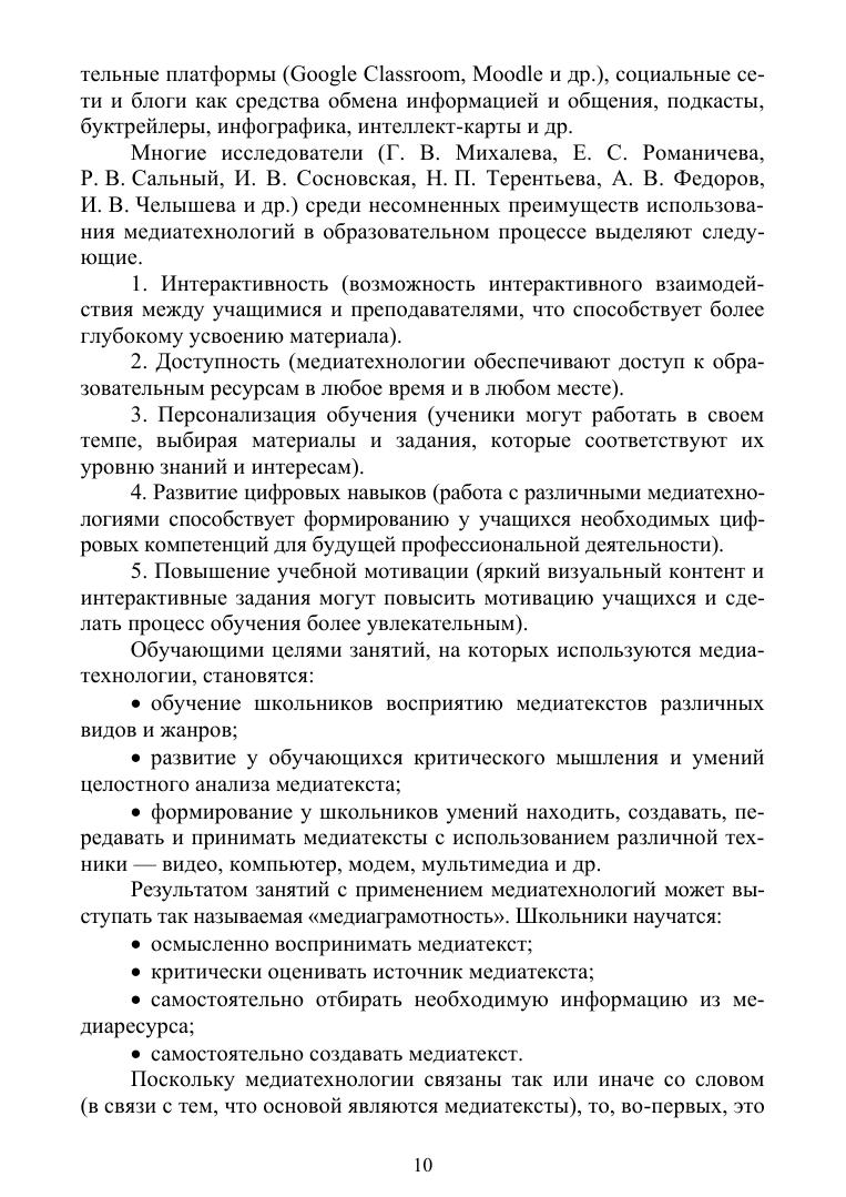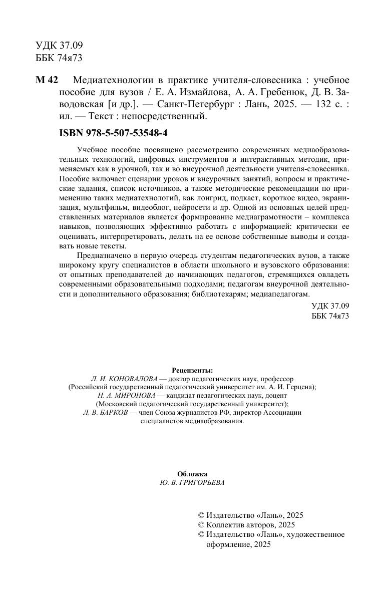 Учебное пособие посвящено рассмотрению современных медиаобразовательных технологий, цифровых инструментов и интерактивных методик, применяемых как в урочной, так и во внеурочной деятельности учителя-словесника. Пособие включает сценарии уроков и внеурочных занятий, вопросы и практические задания, список источников, а также методические рекомендации по применению таких медиатехнологий, как лонгрид, подкаст, короткое видео, экранизация, мультфильм, видеоблог, нейросети и др. Одной из основных целей представленных материалов является формирование медиаграмотности – комплекса навыков, позволяющих эффективно работать с информацией: критически ее оценивать, интерпретировать, делать на ее основе собственные выводы и созда- вать новые тексты. Предназначено в первую очередь студентам педагогических вузов, а также широкому кругу специалистов в области школьного и вузовского образования: от опытных преподавателей до начинающих педагогов, стремящихся овладеть современными образовательными подходами, педагогам внеурочной деятельности и дополнительного образования, библиотекарям, медиапедагогам.
