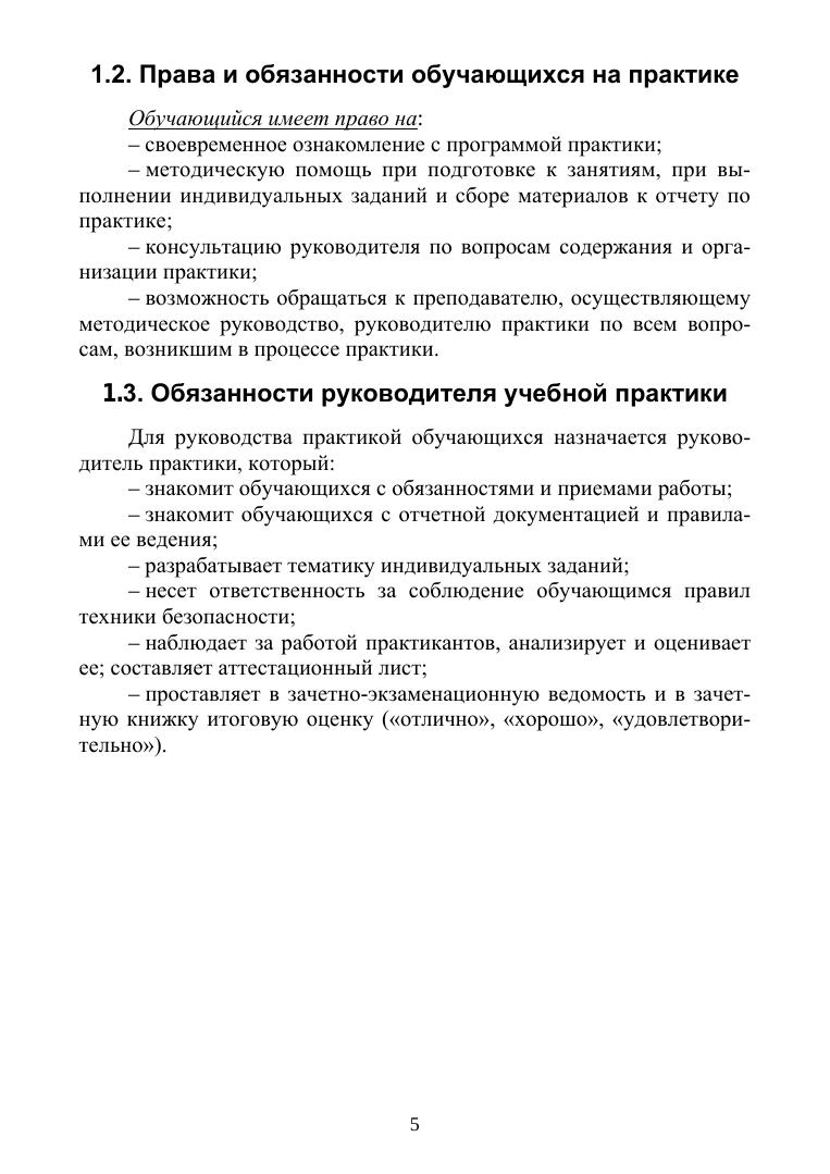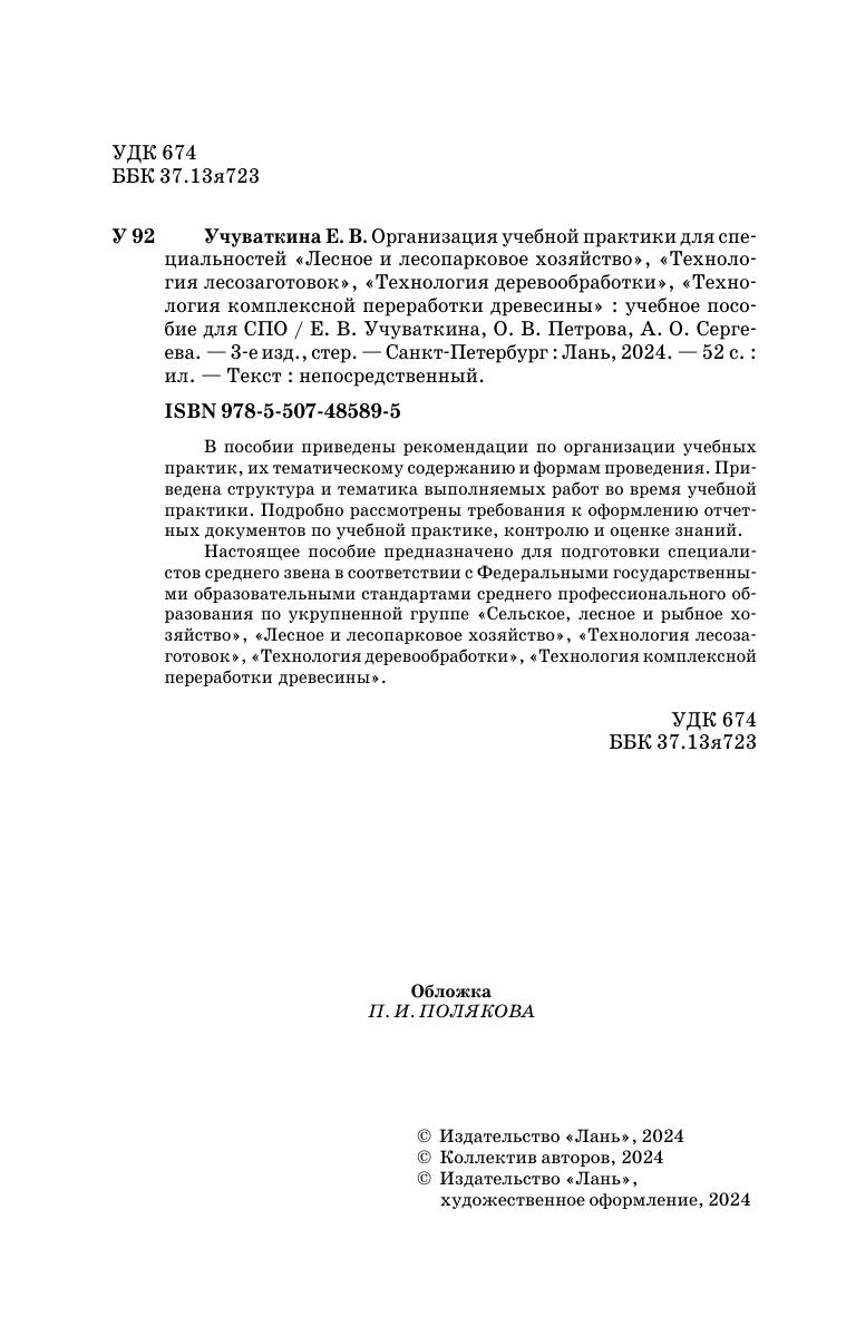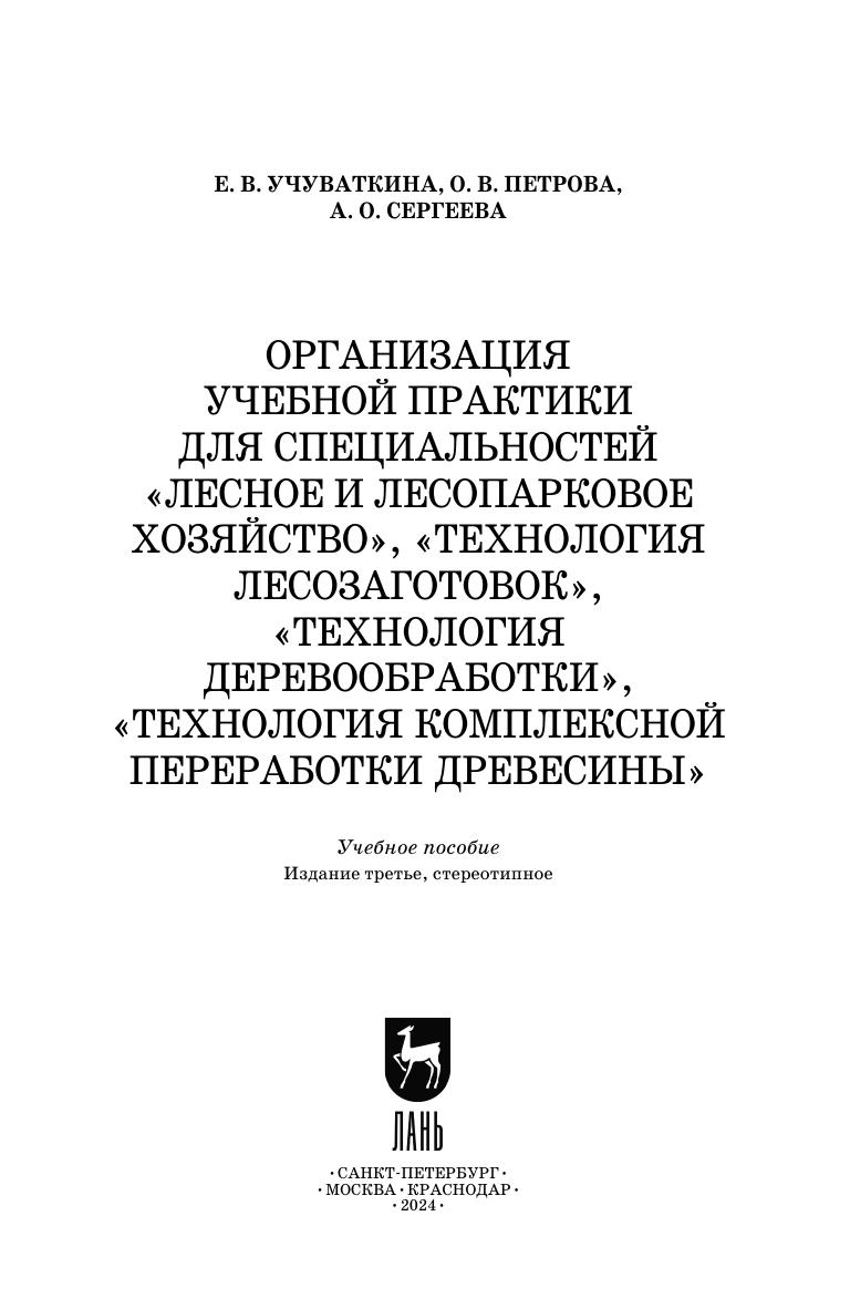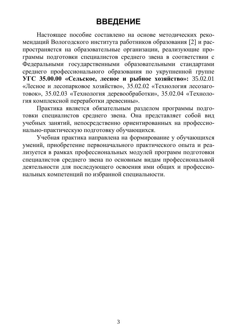 В пособии приведены рекомендации по организации учебных практик, их тематическому содержанию и формам проведения. Приведена структура и тематика выполняемых работ во время учебной практики. Подробно рассмотрены требования к оформлению отчетных документов по учебной практике, контролю и оценке знаний. Соответствует современным требованиям Федерального государственного образовательного стандарта среднего профессионального образования и профессиональным квалификационным требованиям. Настоящее пособие предназначено для подготовки специалистов среднего звена в соответствии с Федеральными государственными образовательными стандартами среднего профессионального образования по укрупненной группе «Сельское, лесное и рыбное хозяйство»: «Лесное и лесопарковое хозяйство», «Технология лесозаготовок», «Технология деревообработки», «Технология комплексной переработки древесины».