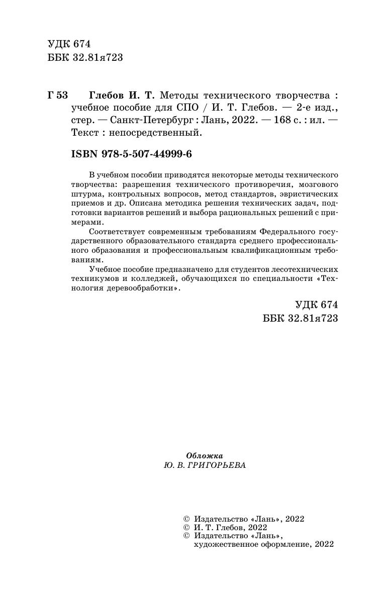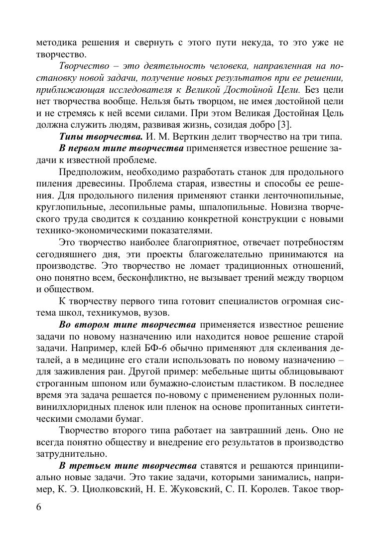 В учебном пособии приводятся некоторые методы технического творчества: разрешения технического противоречия, мозгового штурма, контрольных вопросов, метод стандартов, эвристических приемов и др. Описана методика решения технических задач, подготовки вариантов решений и выбора рациональных решений с примерами. Соответствует современным требованиям Федерального государственного образовательного стандарта среднего профессионального образования и профессиональным квалификационным требованиям. Учебное пособие предназначено для студентов лесотехнических техникумов и колледжей, обучающихся по специальности «Технология деревообработки».