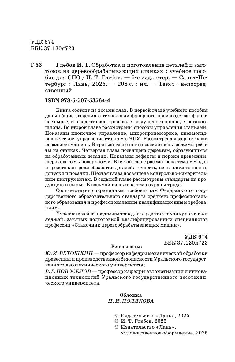 Книга состоит из восьми глав. В первой главе учебного пособия даны общие сведения о технологии фанерного производства. Фанерное сырье, его подготовка, производство лущеного шпона, строганого шпона. Во второй главе рассмотрены способы управления станками. Показано кнопочное управление, микропроцессорное, пневмогидравлическое, управление станком с ЧПУ. Рассмотрена машина лазерно-гравировальная. В третьей главе книги рассмотрены режимы работы на станках. Четвертая глава посвящена дефектам, образующимся на обработанных деталях. Показаны дефекты и пороки древесины, шероховатость поверхности. В пятой главе рассмотрена тема методов и средств контроля обработки деталей. Точность, испытания точности, допуски и посадки. Шестая глава посвящена контрольно измерительным инструментам. В седьмой главе рассмотрены стандарты на продукцию и сырье. В восьмой — изложена тема охраны труда. Соответствует современным требованиям Федерального государственного образовательного стандарта среднего профессионального образования и профессиональным квалификационным требованиям. Учебное пособие предназначено для студентов техникумов и колледжей, занятых подготовкой квалифицированных рабочих станочников деревообрабатывающих машин.