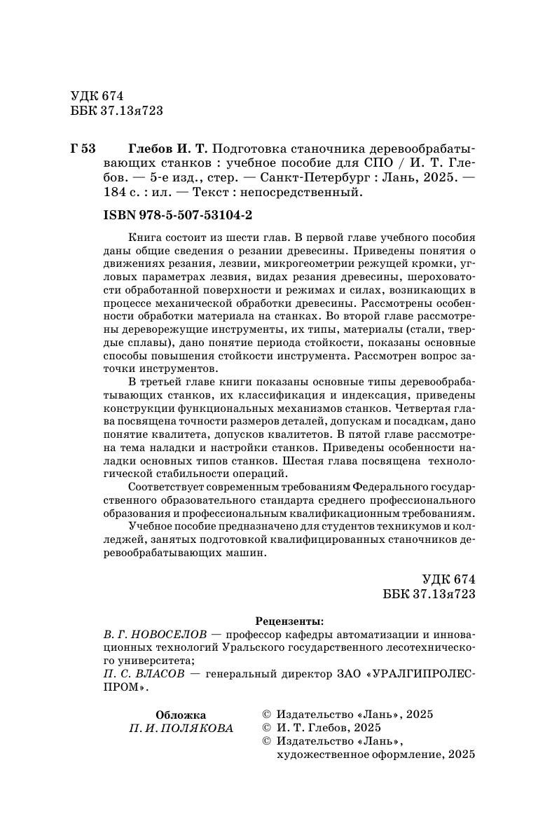 Книга состоит из пяти глав. В первой главе учебного пособия даны общие сведения о резании древесины. Приве-дены понятия о движениях резания, лезвии, микрогеометрии режущей кромки, угловых параметрах лезвия, видах реза-ния древесины, шероховатости обработанной поверхности и режимах и силах, возникающих в процессе механической обработки древесины. Рассмотрены особенности обработки материала на станках. Во второй главе рассмотрены дереворежущие инструменты, их типы, материалы (стали, твердые сплавы), дано понятие периода стойкости, показаны основные способы повышения стойкости инструмента. Рассмотрен вопрос заточки инструментов. В третьей главе книги показаны основные типы деревообрабатывающих станков, их классификация и индексация, приведены конструкции функциональных механизмов станков. Четвертая глава посвящена точности размеров деталей, допускам и посадкам, дано понятие квалитета, допусков квалитетов. В пятой главе рассмотрена тема наладки и настройки станков. Приведены особенности наладки основных типов станков. Шестая глава посвящена технологической стабильности операций. Соответствует современным требованиям Федерального государственного образовательного стандарта среднего профессионального образования и профессиональным квалификационным требованиям. Учебное пособие предназначено для студентов техникумов и колледжей, занятых подготовкой квалифицированных станочников деревообрабатывающих машин.