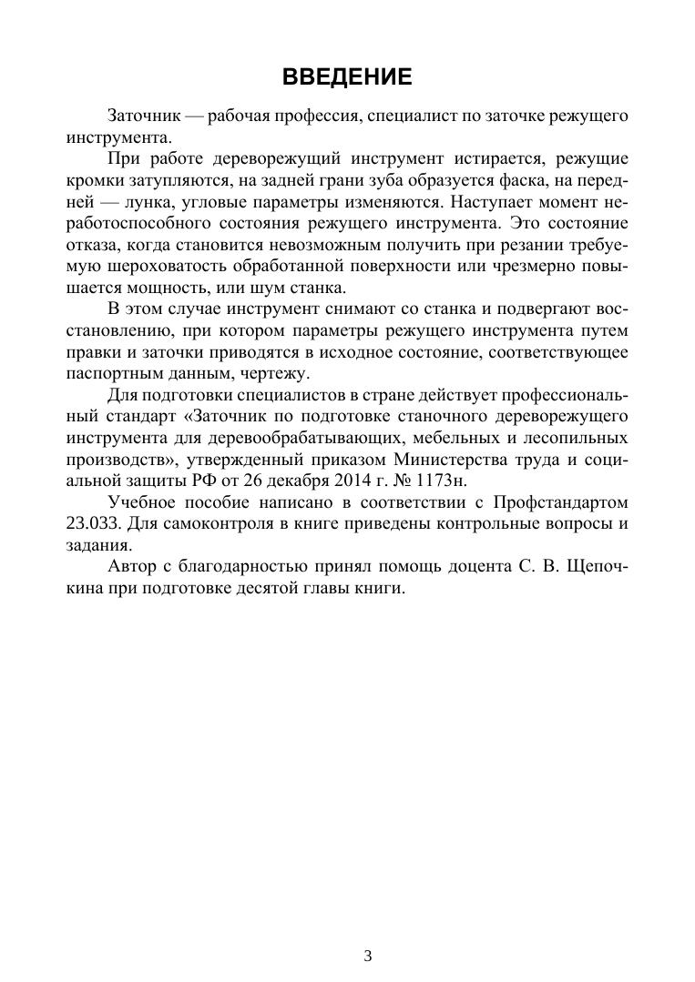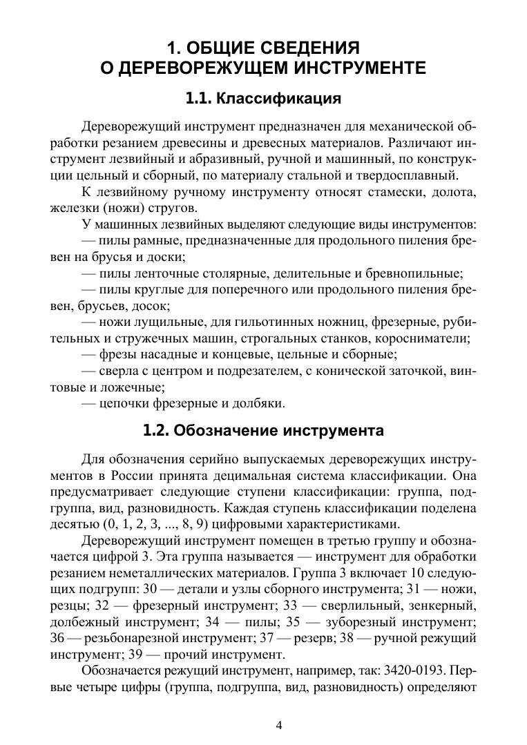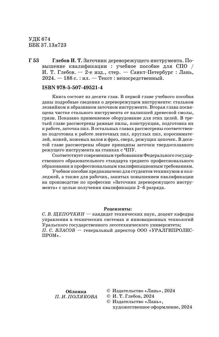 Книга состоит из десяти глав. В первой главе учебного пособия даны подробные сведения о дереворежущем инструменте: стальном лезвийном и абразивном заточном инструменте. Вторая глава посвящена чистке стального инструмента от налипшей древесной смолы, грязи. Показано применяемое оборудование для этих целей. В третьей главе рассмотрены рамные пилы, конструкция, подготовка их к работе, заточка пил. В остальных главах рассмотрены соответственно подготовка к работе ленточных пил, круглых пил, короснимателей, ножей, ножевых валов и фрез, сверл, режущих цепочек. В десятой главе рассмотрены общие принципы заточки твердосплавного режущего инструмента на станках с ЧПУ. Соответствует современным требованиям Федерального государственного образовательного стандарта среднего профессионального образования и профессиональным квалификационным требованиям. Учебное пособие предназначено для студентов техникумов и колледжей, а также для рабочих, занятых повышением квалификации на производстве по профессии «Заточник дереворежущего инструмента» с целью получения квалификации 2–6 разряда.
