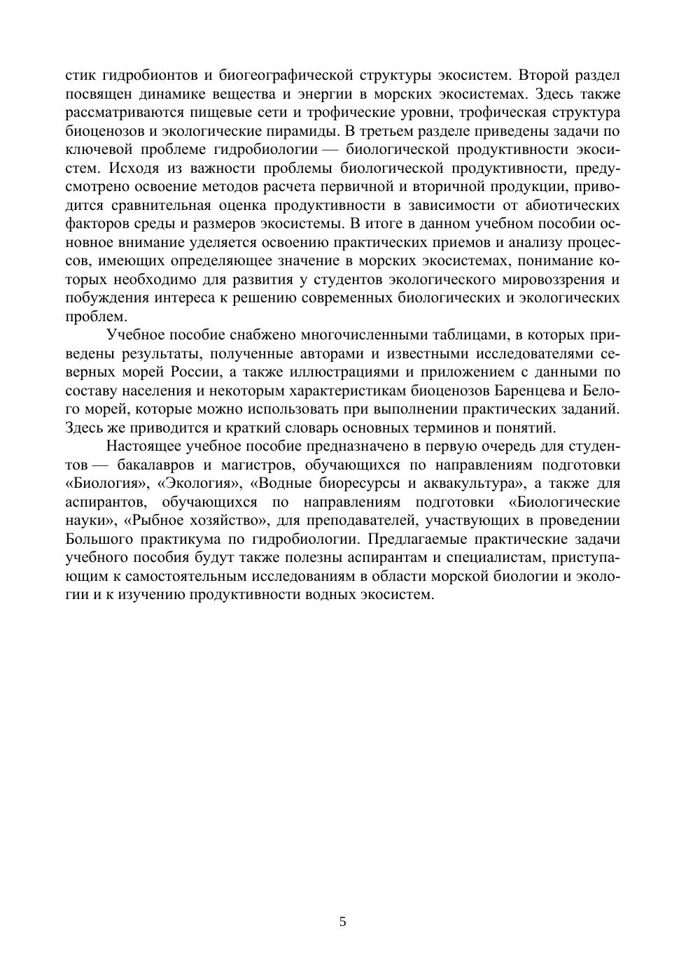В учебном пособии приводятся общие сведения о свойствах морских экологических систем. Особое внимание уделяется структуре и функционированию морских сообществ Баренцева и Белого морей. Представлены практические работы, задания и вопросы, которые студентам необходимо использовать на занятиях и в процессе самостоятельной работы для развития и совершенствования биологического и экологического мышления. Учебное пособие предназначено для студентов вузов, обучающихся по направлениям подготовки «Биология», «Экология и природопользование», «Водные биоресурсы и аквакультура», для аспирантов, обучающихся по направлениям подготовки «Биологические науки», «Рыбное хозяйство», а также для преподавателей, участвующих в проведении практикума по гидробиологии.