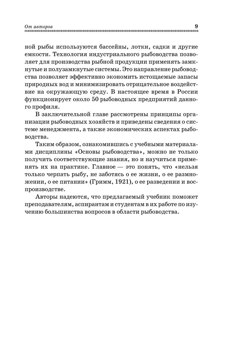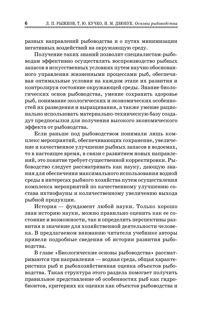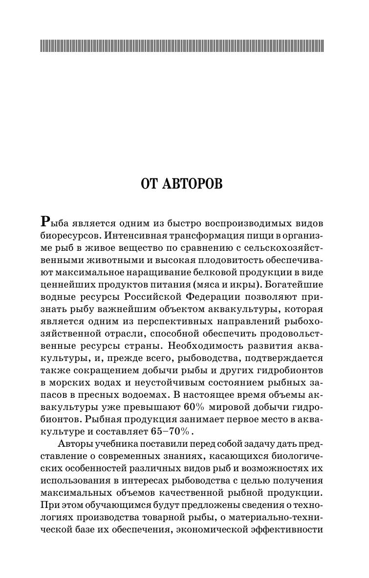 В учебнике представлена история развития рыбоводства, приведены рыбохозяйственные требования к качеству водной среды, даны общая характеристика рыб, биологическая и рыбохозяйственная оценка объектов рыбоводства, рассмотрены основные производственные процессы (селекционно-племенная работа, получение качественных половых продуктов, способы осеменения и инкубации икры, получение жизнестойкого посадочного материала, методы сортировки, количественного учета и контроля). Большое внимание уделено биологическим основам кормления выращиваемых рыб, проблемам здоровья и профилактики заболеваний. Рассмотрены вопросы транспортировки половых продуктов, посадочного материала и товарной рыбы. Описаны основные направления рыбоводства (пастбищное, прудовое, садковое и индустриальное), дана их общая характеристика и технологические особенности. Показаны основные принципы организации рыбоводных хозяйств (менеджмент, экономика). Соответствует современным требованиям Федерального государственного образовательного стандарта среднего профессионального образования и профессиональным квалификационным требованиям. Учебник рекомендуется студентам колледжей и техникумов, а также рыбоводам различной квалификации и всем желающим заниматься разведением и выращиванием рыбы.