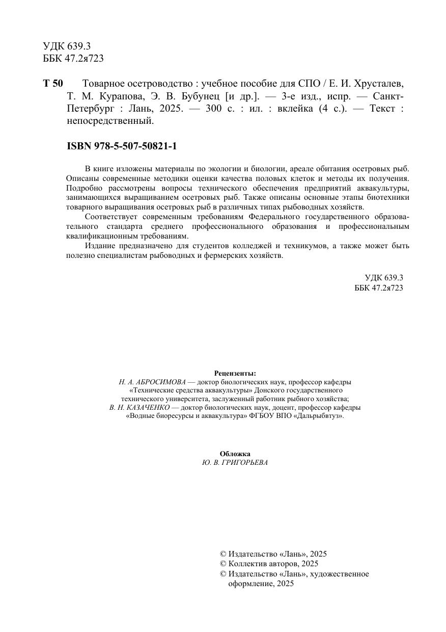В книге изложены материалы по экологии и биологии, ареале обитания осетровых рыб. Описаны современные методики оценки качества половых клеток и методы их получения. Подробно рассмотрены вопросы технического обеспечения предприятий аквакультуры, занимающихся выращиванием осетровых рыб. Также описаны основные этапы биотехники товарного выращивания осетровых рыб в различных типах рыбоводных хозяйств. Соответствует современным требованиям Федерального государственного образовательного стандарта среднего профессионального образования и профессиональным квалификационным требованиям. Издание предназначено для студентов колледжей и техникумов, а также может быть полезно специалистам рыбоводных и фермерских хозяйств.