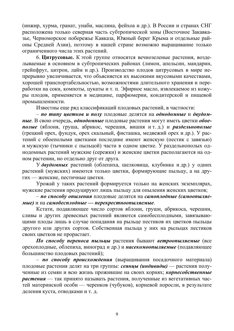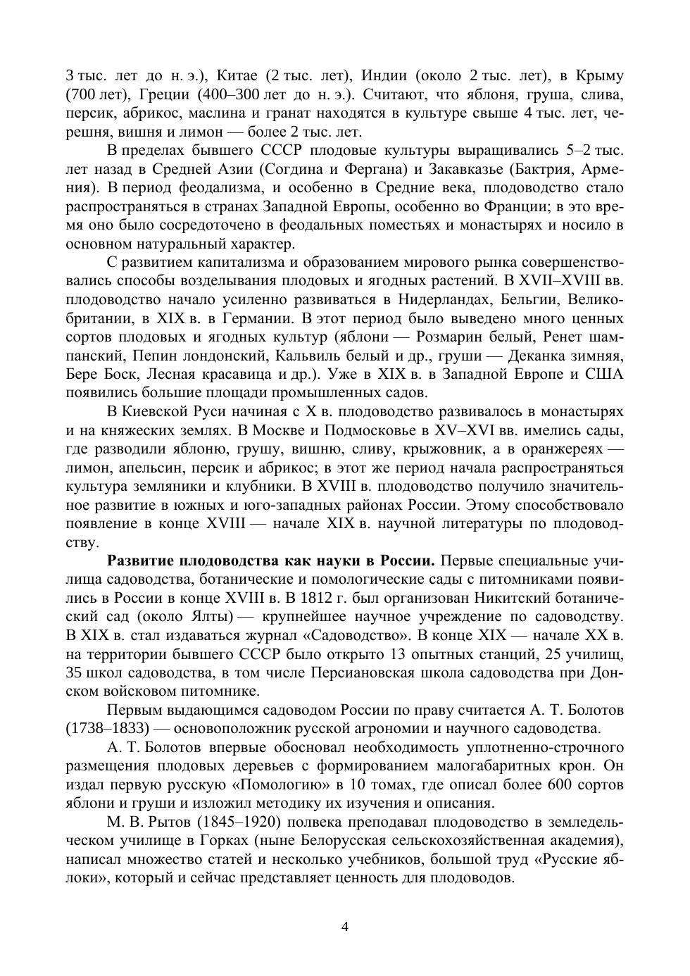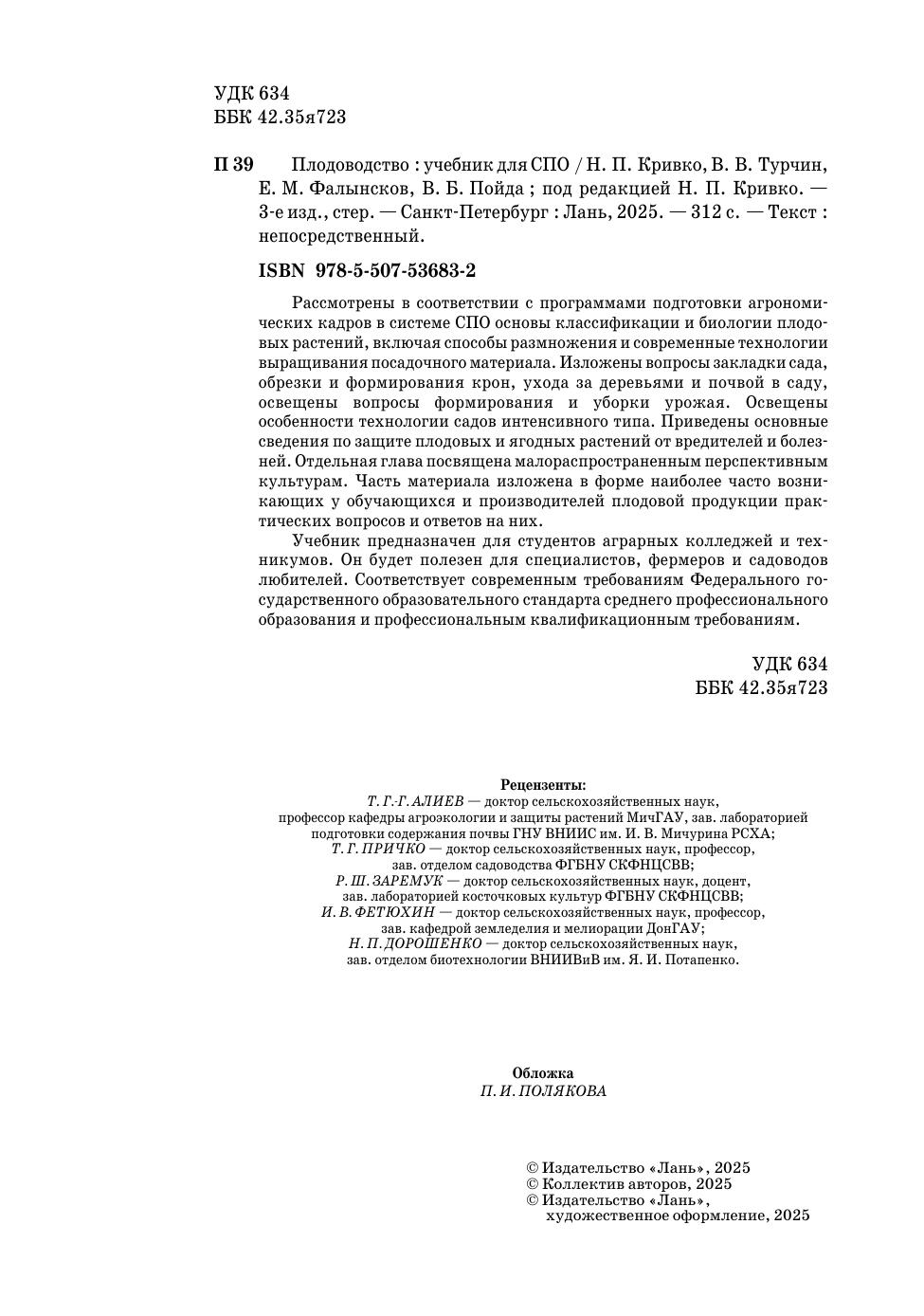 Рассмотрены в соответствии с программами подготовки агрономических кадров в системе СПО основы классификации и биологии плодовых растений, включая способы размножения и современные технологии выращивания посадочного материала. Изложены вопросы закладки сада, обрезки и формирования крон, ухода за деревьями и почвой в саду, освещены вопросы формирования и уборки урожая. Освещены особенности технологии садов интенсивного типа. Приведены основные сведения по защите плодовых и ягодных растений от вредителей и болезней. Отдельная глава посвящена малораспространенным перспективным культурам. Часть материала изложена в форме наиболее часто возникающих у обучающихся и производителей плодовой продукции практических вопросов и ответов на них. Учебник предназначен для студентов аграрных колледжей и техникумов. Он будет полезен для специалистов, фермеров и садоводов любителей. Соответствует современным требованиям Федерального государственного образовательного стандарта среднего профессионального образования и профессиональным квалификационным требованиям.