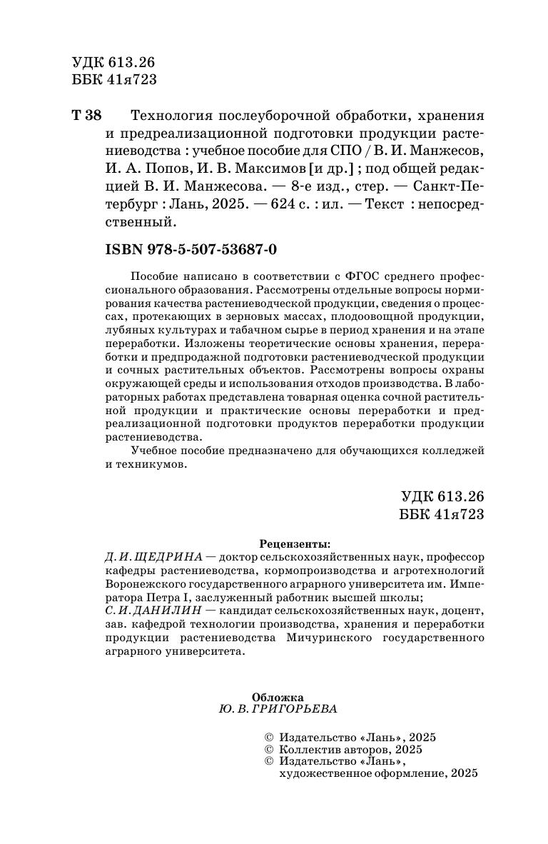 Пособие написано в соответствии с ФГОС среднего профессионального образования. Рассмотрены отдельные вопросы нормирования качества растениеводческой продукции, сведения о процессах, протекающих в зерновых массах, плодоовощной продукции, лубяных культурах и табачном сырье в период хранения и на этапе переработки. Изложены теоретические основы хранения, переработки и предпродажной подготовки растениеводческой продукции и сочных растительных объектов. Рассмотрены вопросы охраны окружающей среды и использования отходов производства. В лабораторных работах представлена товарная оценка сочной растительной продукции и практические основы переработки и предреализационной подготовки продуктов переработки продукции растениеводства. Учебное пособие предназначено для обучающихся колледжей и техникумов.