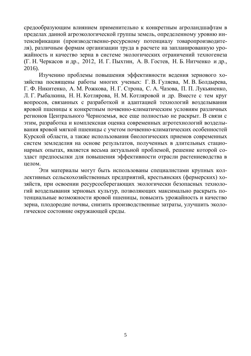 На основании экспериментальных статистических и литературных данных в работе освещены теоретические и практические аспекты производства продовольственного зерна яровой пшеницы в условиях Курской области. Дана комплексная агротехнологическая оценка приемов и способов возделывания яровой пшеницы, определено рациональное сочетание систем удобрения с различным уровнем биологизации (минеральная, органоминеральная, органическая) и способов основной обработки почвы (вспашка, плоскорезная обработка, поверхностная обработка), влияние технологий возделывания с различным уровнем интенсификации на плодородие чернозема типичного, урожайность и качество зерна яровой пшеницы. Книга предназначена для руководителей и специалистов сельскохозяйственных предприятий, преподавателей сельскохозяйственных учебных заведений, студентов агрономических факультетов.