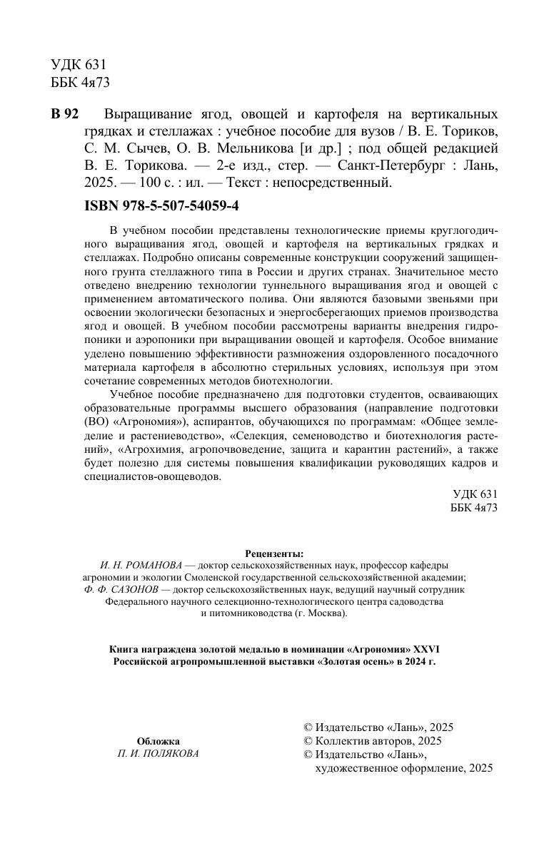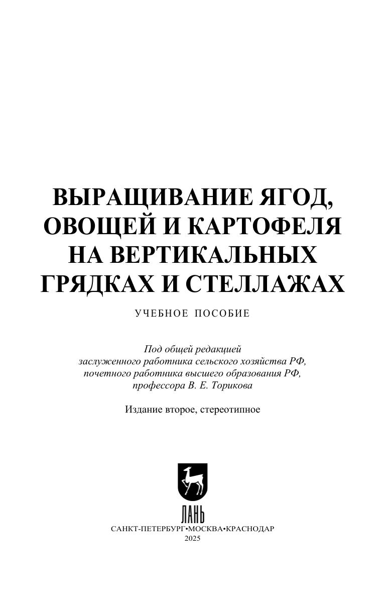 В учебном пособии представлены технологические приемы круглогодичного выращивания ягод, овощей и картофеля на вертикальных грядках и стеллажах. Подробно описаны современные конструкции сооружений защищенного грунта стеллажного типа в России и других странах. Значительное место отведено внедрению технологии туннельного выращивания ягод и овощей с применением автоматического полива. Они являются базовыми звеньями при освоении экологически безопасных и энергосберегающих приемов производства ягод и овощей. В учебном пособии рассмотрены варианты внедрения гидропоники и аэропоники при выращивании овощей и картофеля. Особое внимание уделено повышению эффективности размножения оздоровленного посадочного материала картофеля в абсолютно стерильных условиях, используя при этом сочетание современных методов биотехнологии. Учебное пособие предназначено для подготовки студентов, осваивающих образовательные программы высшего образования (направление подготовки (ВО) «Агрономия»), аспирантов, обучающихся по программам: «Общее земледелие и растениеводство», «Селекция, семеноводство и биотехнология растений», «Агрохимия, агропочвоведение, защита и карантин растений», а также будет полезно для системы повышения квалификации руководящих кадров и специалистов-овощеводов.