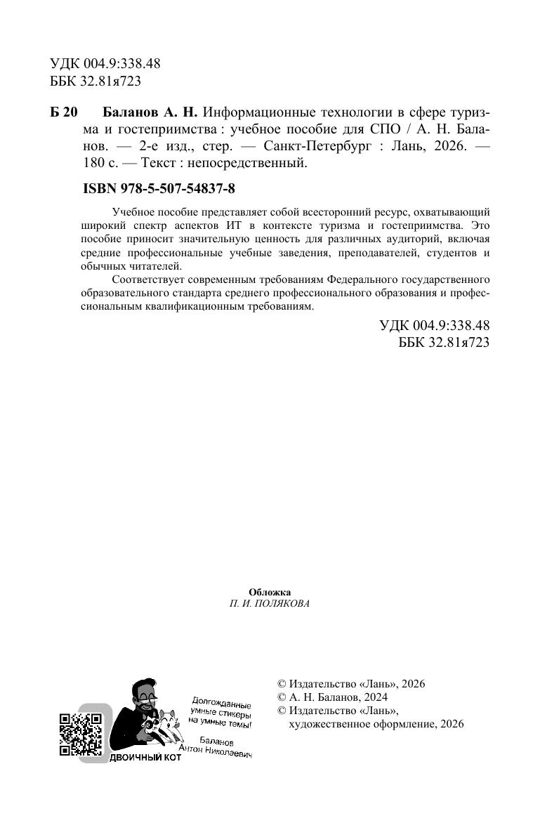 Учебное пособие представляет собой всесторонний ресурс, охватывающий широкий спектр аспектов ИТ в контексте туризма и гостеприимства. Это пособие приносит значительную ценность для различных аудиторий, включая средние профессиональные учебные заведения, преподавателей, студентов и обычных читателей. Соответствует современным требованиям Федерального государственного образовательного стандарта среднего профессионального образования и профессиональным квалификационным требованиям.