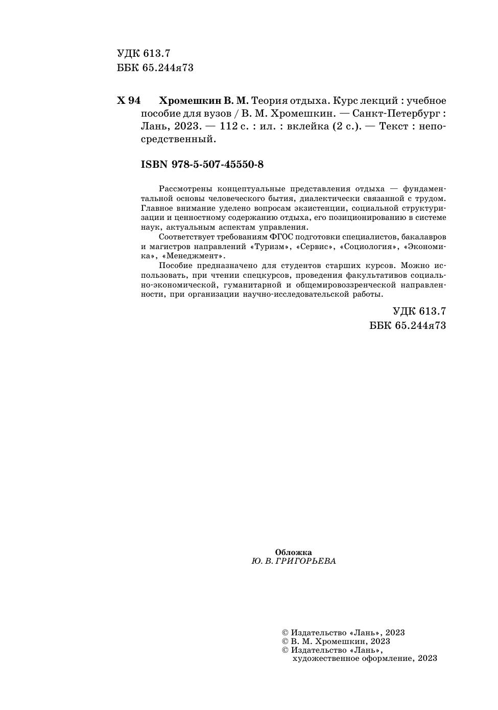 Рассмотрены концептуальные представления отдыха — фундаментальной основы человеческого бытия, диалектически связанной с трудом. Главное внимание уделено вопросам экзистенции, социальной структуризации и ценностному содержанию отдыха, его позиционированию в системе наук, актуальным аспектам управления. Соответствует требованиям ФГОС подготовки специалистов, бакалавров и магистров направлений «Туризм», «Сервис», «Социология», «Экономика», «Менеджмент». Пособие предназначено для студентов старших курсов. Можно использовать, при чтении спецкурсов, проведения факультативов социально-экономической, гуманитарной и общемировоззренческой направленности, при организации научно-исследовательской работы.