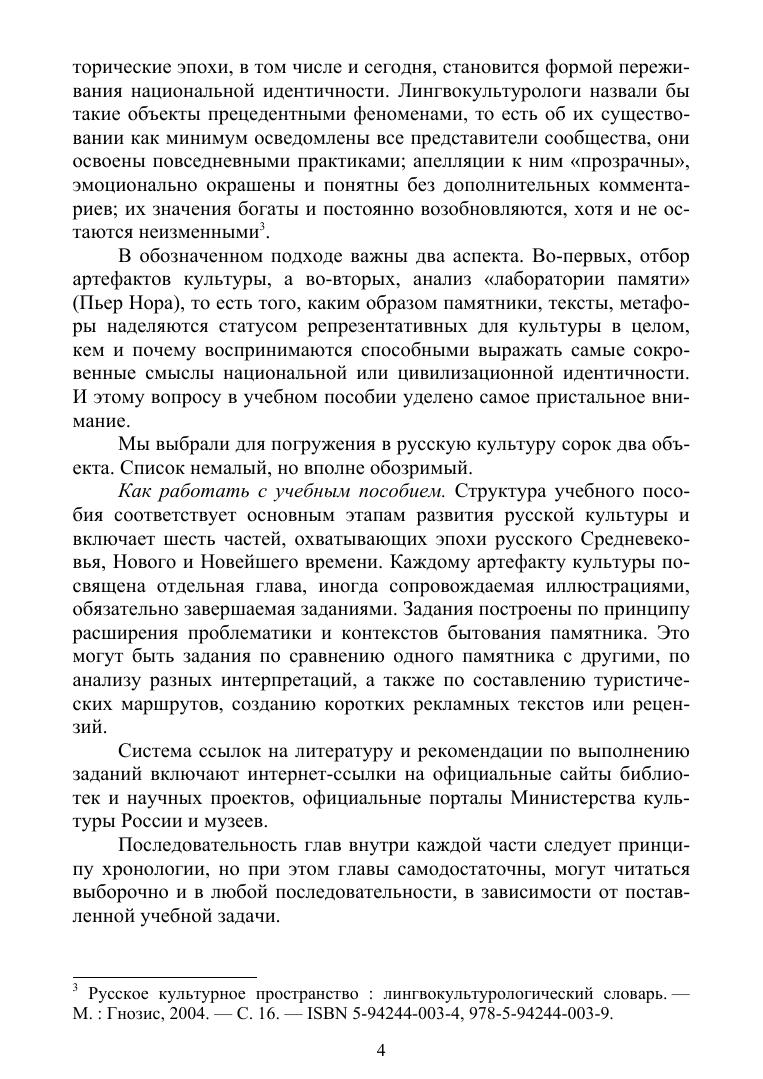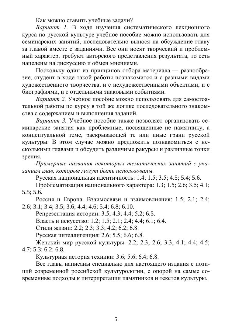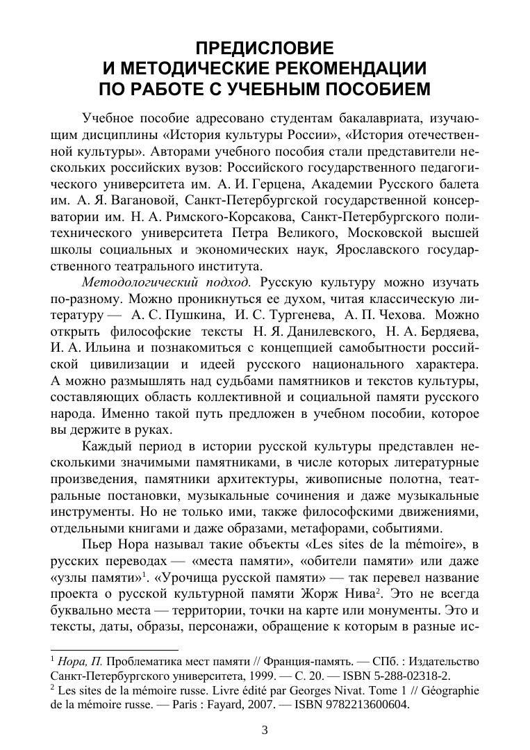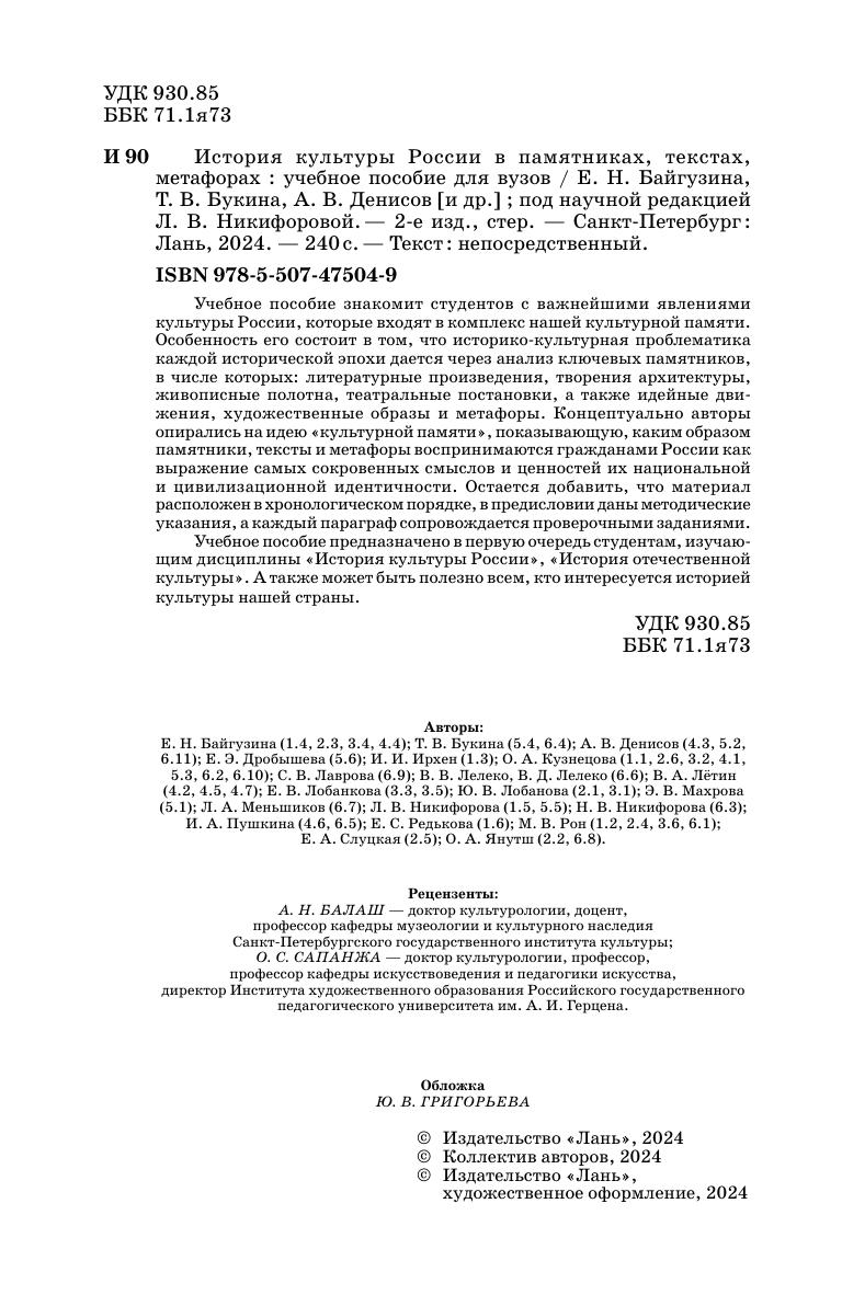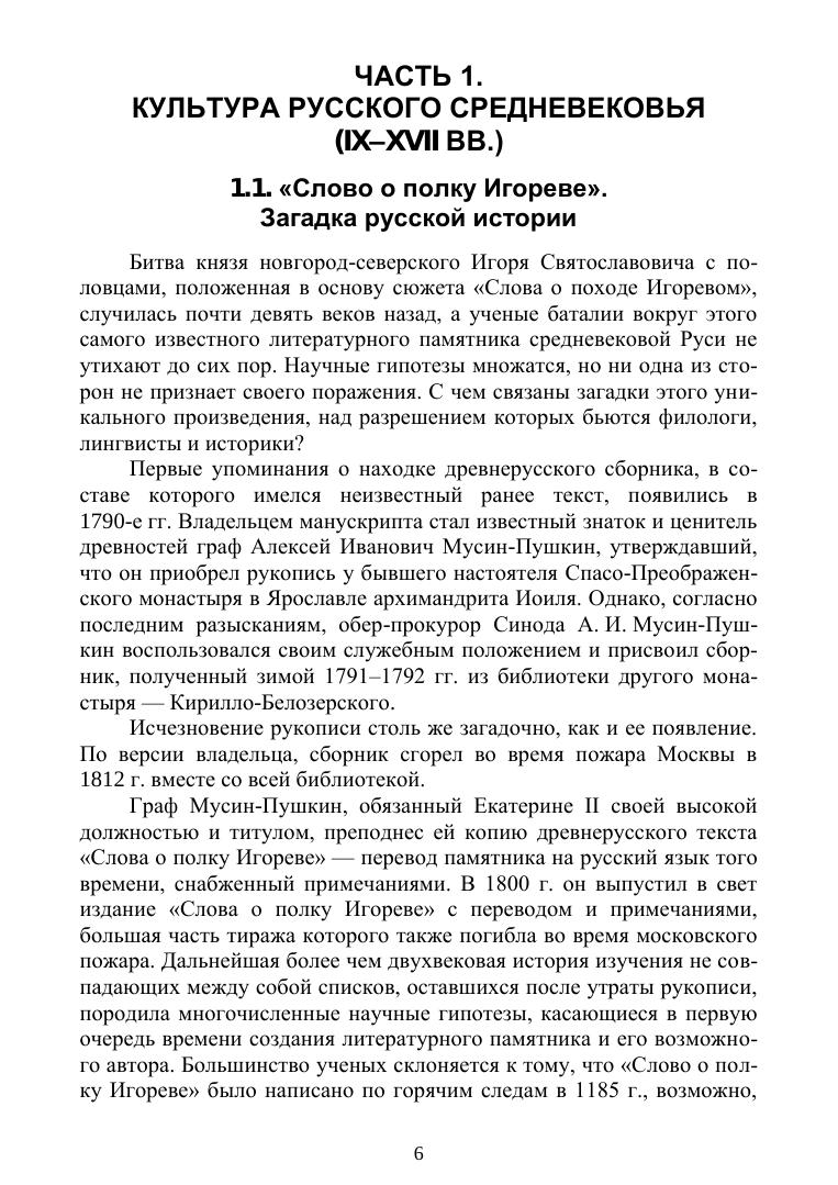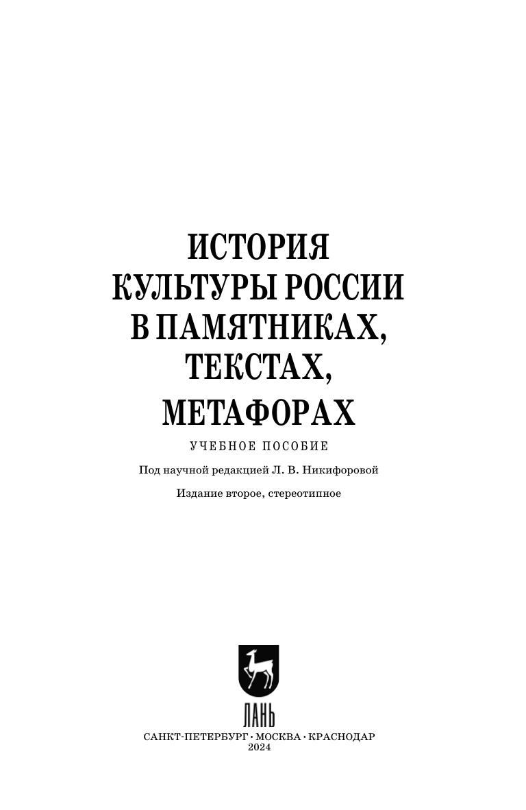 Учебное пособие знакомит студентов с важнейшими явлениями культуры России, которые входят в комплекс нашей культурной памяти. Особенность его состоит в том, что историко-культурная проблематика каждой исторической эпохи дается через анализ ключевых памятников, в числе которых: литературные произведения, творения архитектуры, живописные полона, театральные постановки, а также идейные движения, художественные образы и метафоры. Концептуально авторы опирались на идею «культурной памяти», показывающую, каким образом памятники, тексты и метафоры воспринимаются гражданами России как выражение самых сокровенных смыслов и ценностей их национальной и цивилизационной идентичности. Остается добавить, что материал расположен в хронологическом порядке, в предисловии даны методические указания, а каждый параграф сопровождается проверочными заданиями. Учебное пособие предназначено в первую очередь студентам, изучающим дисциплины «История культуры России», «История отечественной культуры». А также может быть полезно всем, кто интересуется историей культуры нашей страны.