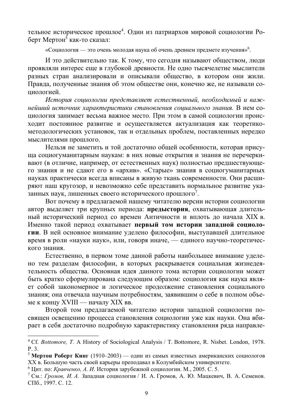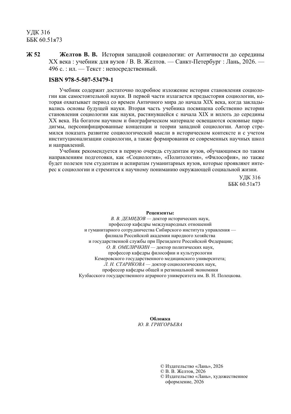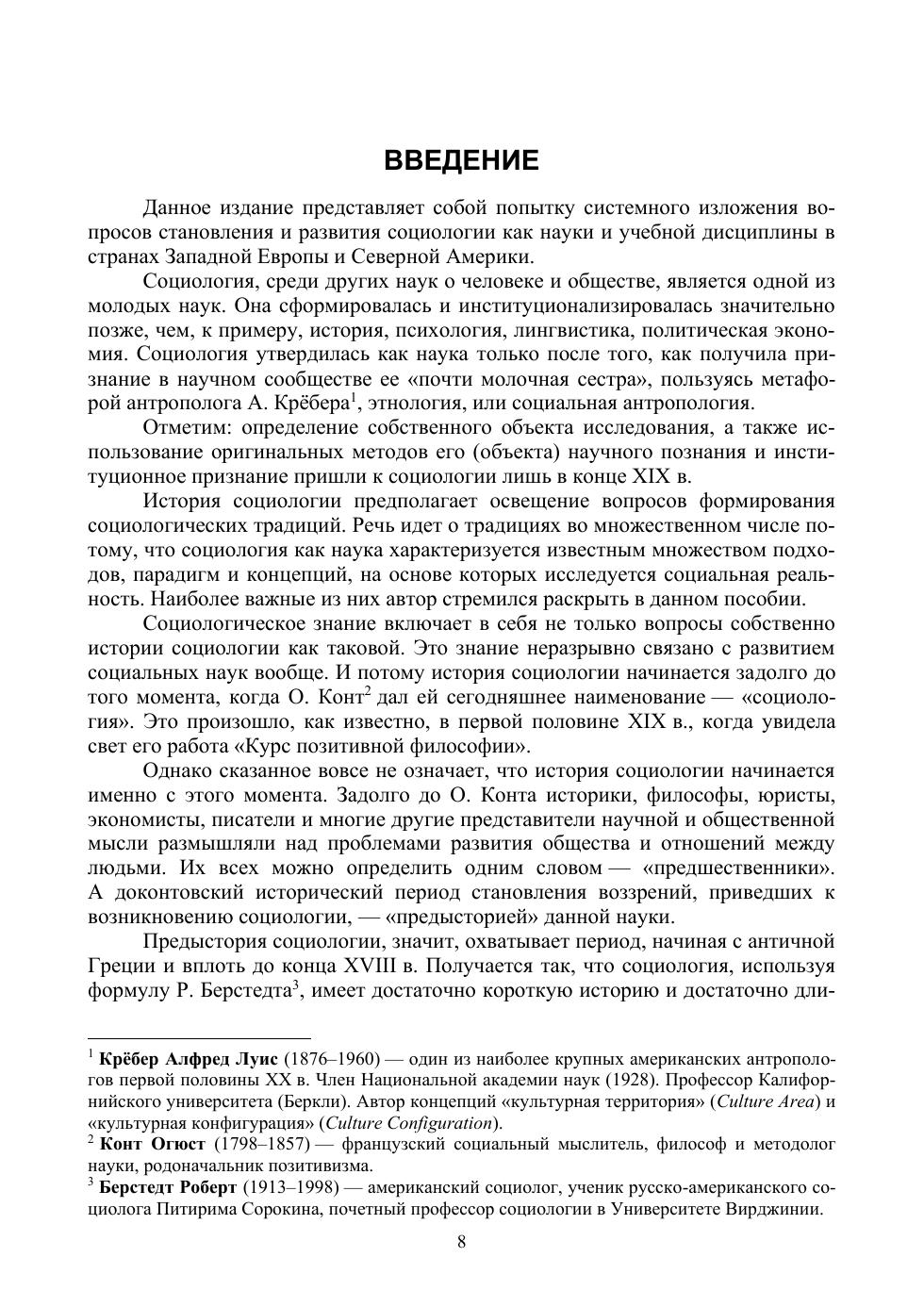 Учебник содержит достаточно подробное изложение истории становления социологии как самостоятельной науки. В первой части излагается предыстория социологии, которая охватывает период со времен Античного мира до начала XIX века, когда заклады- вались основы будущей науки. Вторая часть учебника посвящена собственно истории становления социологии как науки, растянувшейся с начала XIX и вплоть до середины XX века. На богатом научном и биографическом материале освещаются основные парадигмы, персонифицированные концепции и теории западной социологии. Автор стремился показать развитие социологической мысли в историческом контексте и с учетом институционализации социологии, а также формирования ее современных научных школ и направлений. Учебник рекомендуется в первую очередь студентам вузов, обучающимся по таким направлениям подготовки, как «Социология», «Политология», «Философия», но также будет полезен тем студентам и аспиратам гуманитарных вузов, которые проявляют инте- рес к социологии и стремится к научному пониманию окружающей социальной жизни.