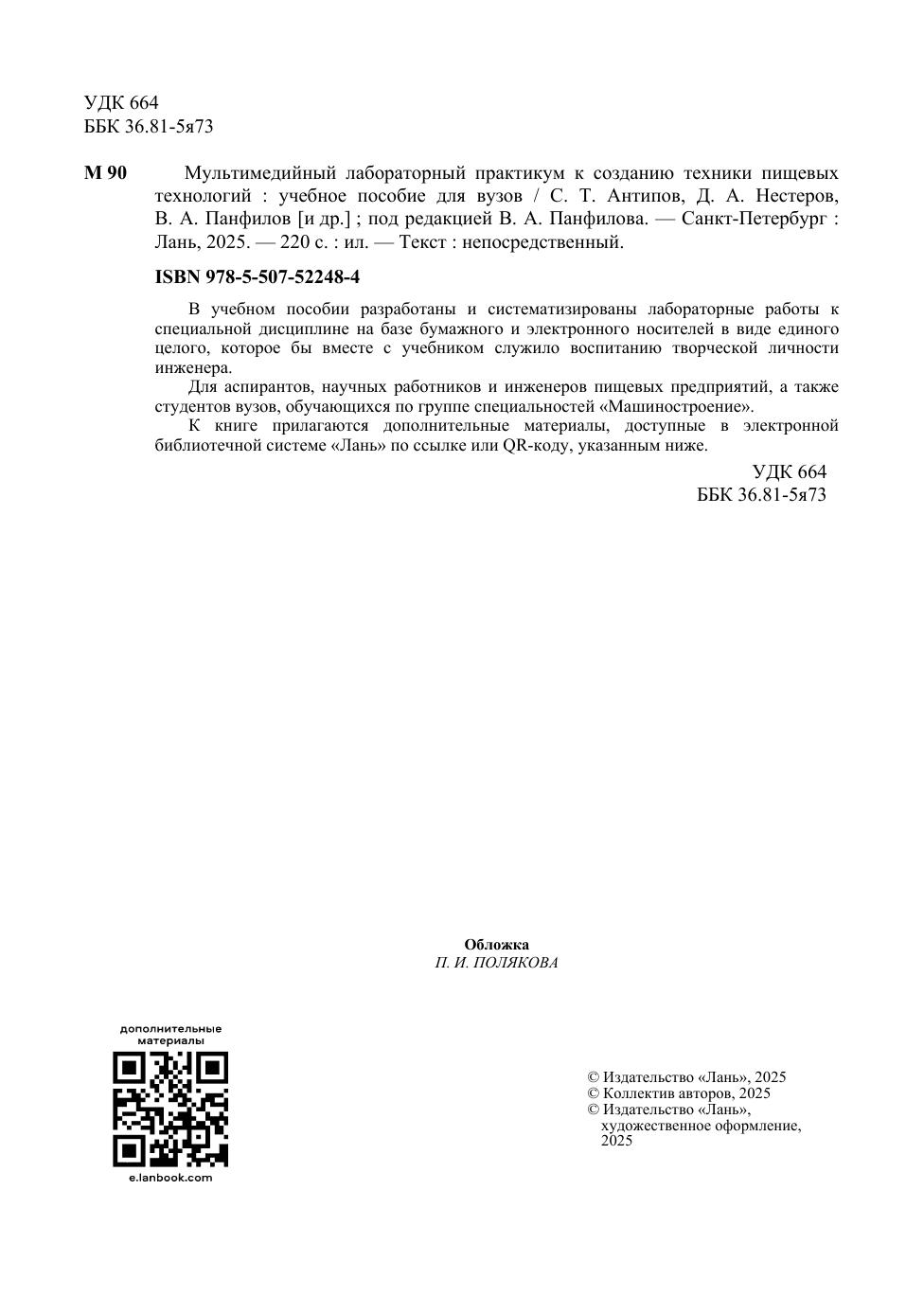 В учебном пособии разработаны и систематизированы лабораторные работы к специальной дисциплине на базе бумажного и электронного носителей в виде единого целого, которое бы вместе с учебником служило воспитанию творческой личности инженера. Для аспирантов, научных работников и инженеров пищевых предприятий, а также студентов вузов, обучающихся по группе специальностей «Машиностроение». К книге прилагаются дополнительные материалы, доступные в электронной библиотечной системе «Лань» по ссылке или QR-коду, указанным ниже.