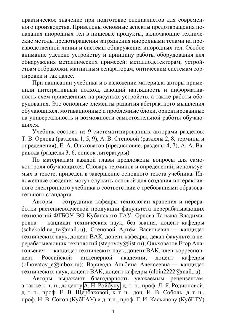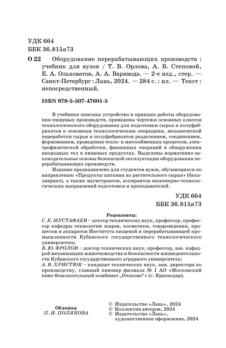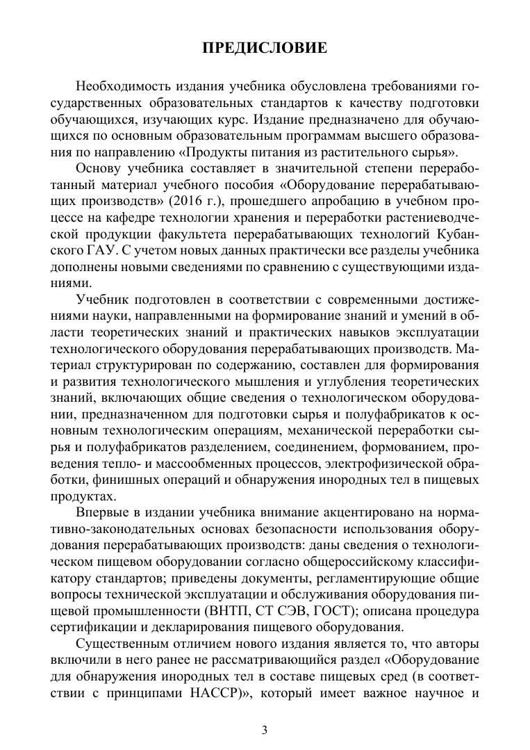В учебнике описаны устройство и принцип работы оборудования пищевых производств, приведены чертежи основных классов технологического оборудования для подготовки сырья и полуфабрикатов к основным технологическим операциям, механической переработки сырья и полуфабрикатов разделением, соединением, формованием, проведения тепло- и массообменных процессов, электрофизической обработки, финишных операций и обнаружения инородных тел в пищевых продуктах. Выделены нормативно-законодательные основы безопасной эксплуатации оборудования перерабатывающих производств. Издание предназначено для студентов вузов, обучающихся по направлению «Продукты питания из растительного сырья» (бакалавриат), а также магистрантов, аспирантов инженерно-технологических направлений подготовки и преподавателей.