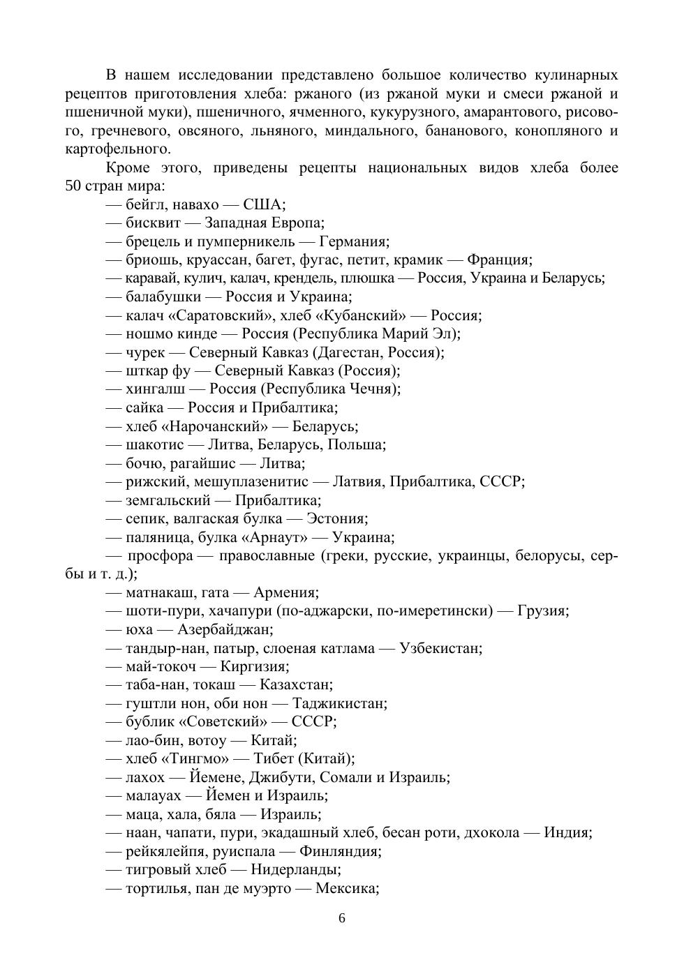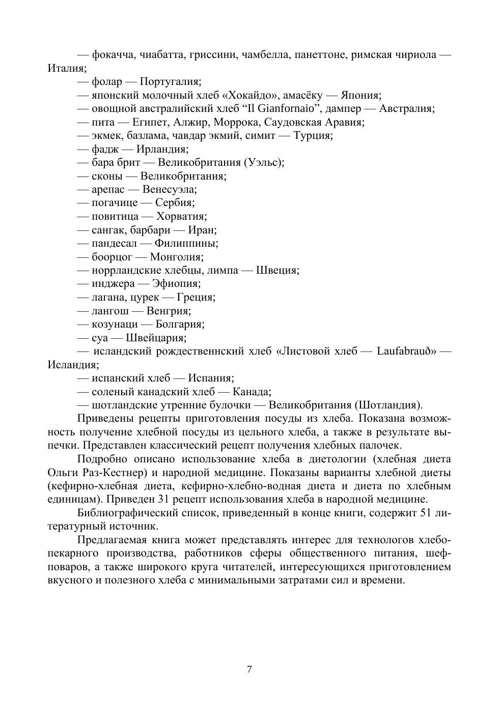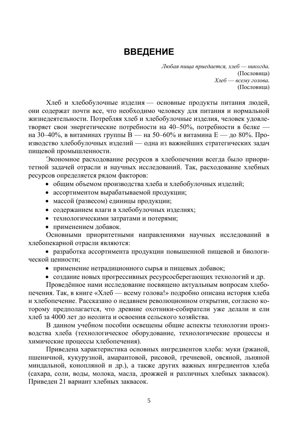 В учебном пособии подробно описаны история возникновения хлеба и основы технологии производства хлеба. Приведена характеристика основных ингредиентов хлеба: муки (ржаной, пшеничной, ячменной, овсяной, кукурузной, рисовой, гречневой, амарантовой, льняной, миндальной, банановой, конопляной и др.), а также других важных ингредиентов (дрожжей, соли и воды, а также сахара, молока, жиров, различных хлебных опар, заквасок и других продуктов брожения). Представлено большое количество кулинарных рецептур приготовления хлеба: ржаного (из ржаной муки и смеси ржаной и пшеничной муки), пшеничного, ячменного, овсяного, кукурузного, рисового, гречневого, амарантового, льняного, миндального, бананового, конопляного, картофельного и др. Приведены технологии и рецептуры национальных видов хлеба народов более 50 стран мира и рецептуры приготовления хлебной посуды. Подробно описано использование хлеба в диетологии (хлебная диета Ольги Раз-Кестнер) и народной медицине. Учебное пособие предназначено для студентов вузов, может представлять интерес для технологов хлебопекарного производства, научных сотрудников, работников сферы общественного питания и ресторанного бизнеса, а также для широкого круга читателей интересущихся приготовлением вкусного, ароматного и полезного хлеба.