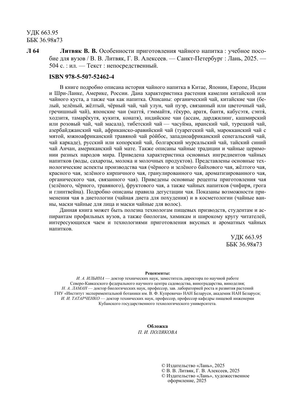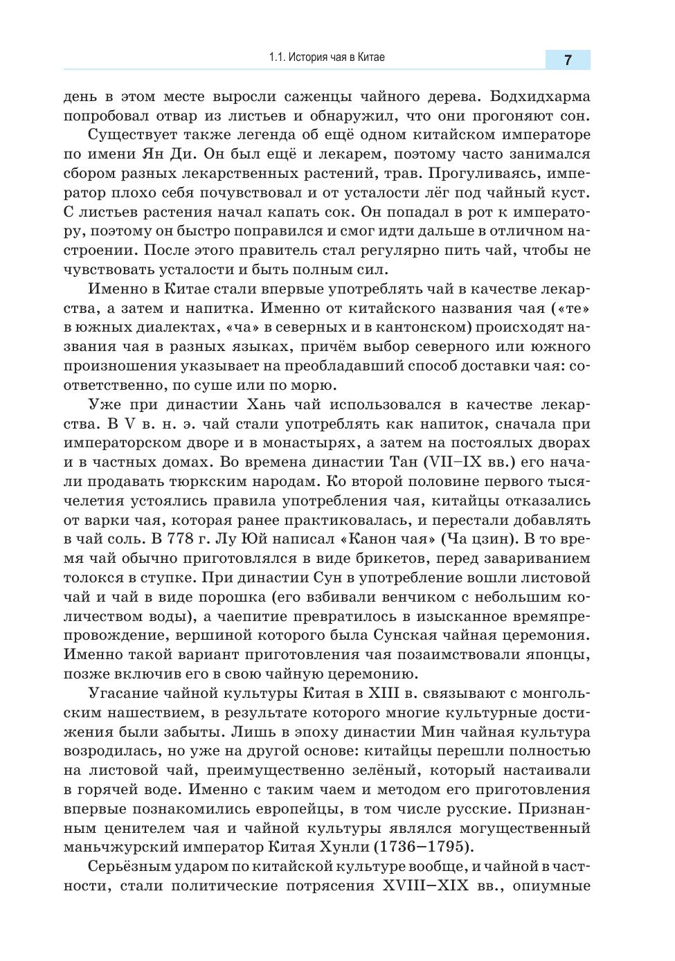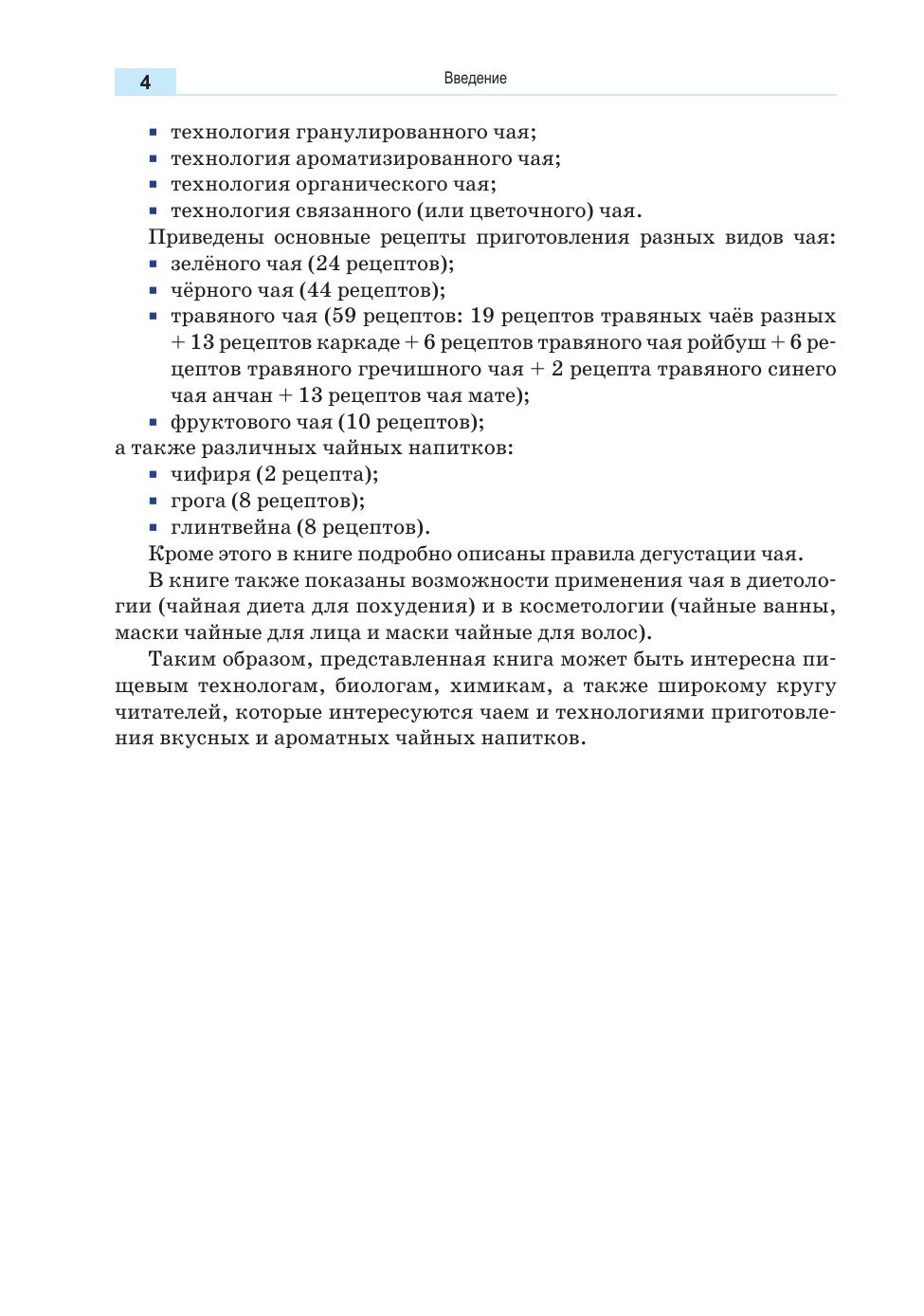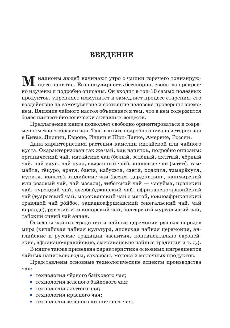 В книге подробно описана история чайного напитка в Китае, Японии, Европе, Индии и Шри-Ланке, Америке, России. Дана характеристика растения камелии китайской или чайного куста, а также чая как напитка. Описаны: органический чай, китайские чаи (белый, зелёный, жёлтый, чёрный чай, чай улун, чай пуэр, связанный или цветочный чай, гречишный чай), японские чаи (маття́, гэммайтя, гёкуро, аратя, бантя, кабусэтя, сэнтя́, ходзитя, тамарёкутя, кукитя, конатя), индийские чаи (ассам, дарджилинг, кашмирский или розовый чай, чай масала), тибетский чай – часуйма, иранский чай, турецкий чай, азербайджанский чай, африканско-аравийский чай (туарегский чай, марокканский чай с мятой, южноафриканский травяной чай рóйбос, западноафриканский сенегальский чай, чай каркаде), русский или копорский чай, болгарский мурсальский чай, тайский синий чай Анчан, американский чай мате. Также описаны чайные традиции и чайные церимонии разных народов мира. Приведена характеристика основных ингредиентов чайных напитков (воды, сахарозы, молока и молочных продуктов). Представлены основные технологические аспекты производства чая (чёрного и зелёного байхового чая, жёлтого чая, красного чая, зелёного кирпичного чая, гранулированного чая, ароматизированного чая, органического чая, связанного чая). Приведены основные рецепты приготовления чая (зелёного, чёрного, травяного), фруктового чая, а также чайных напитков (чифиря, грога и глинтвейна). Подробно описаны правила дегустации чая. Показаны возможности применения чая в диетологии (чайная диета для похудения) и в косметологии (чайные ванны, маски чайные для лица и маски чайные для волос). Данная книга может быть полезна технологам пищевых призводств, студентам и аспирантам профильных вузов, а также биологам, химикам и широкому кругу читателей, интересующихся чаем и технологиями приготовления вкусных и ароматных чайных напитков.