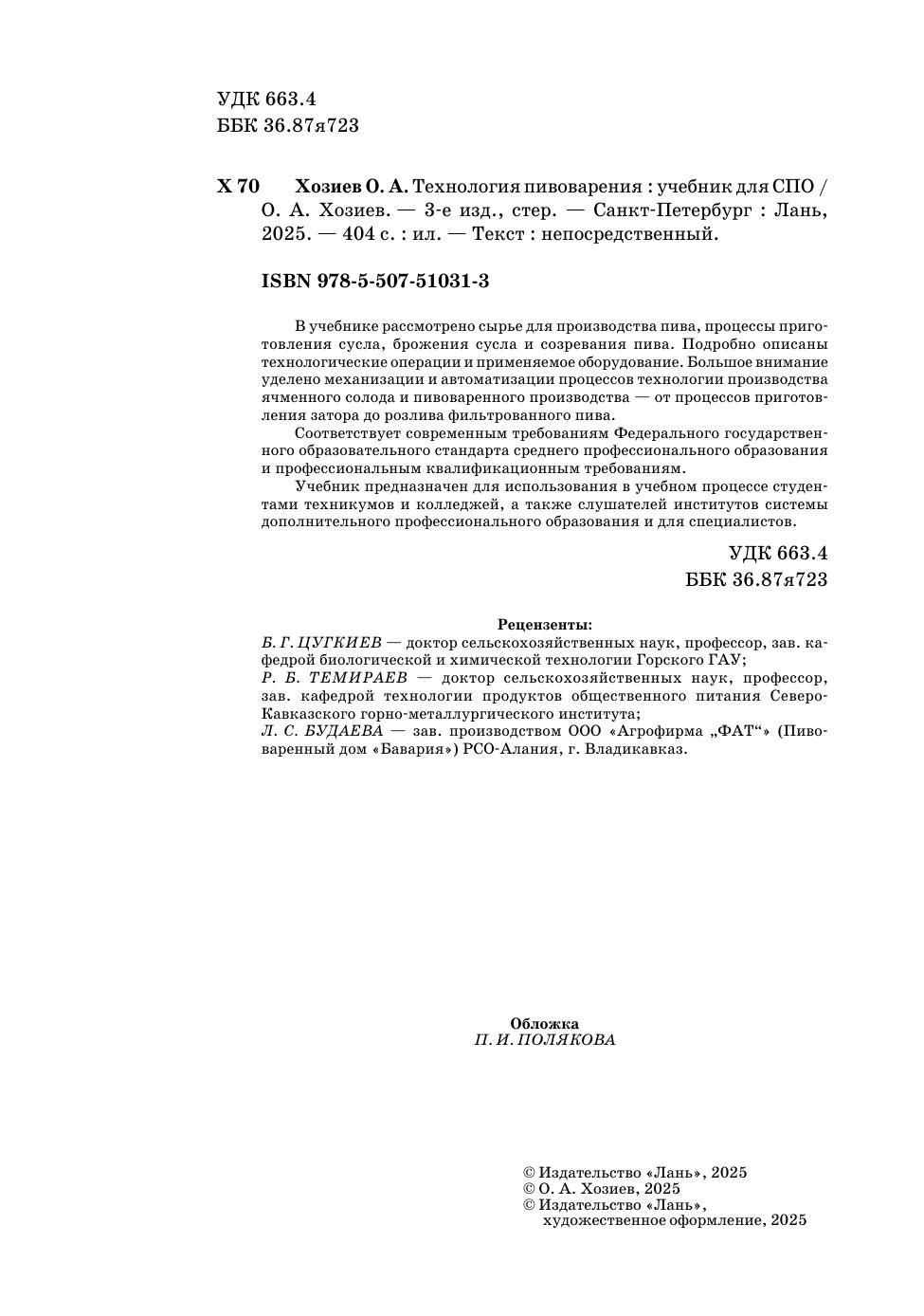 В учебнике рассмотрено сырье для производства пива, процессы приготовления сусла, брожения сусла и созревания пива. Подробно описаны технологические операции и применяемое оборудование. Большое внимание уделено механизации и автоматизации процессов технологии производства ячменного солода и пивоваренного производства — от процессов приготовления затора до розлива фильтрованного пива. Соответствует современным требованиям Федерального государственного образовательного стандарта среднего профессионального образования и профессиональным квалификационным требованиям. Учебник предназначен для использования в учебном процессе студентами техникумов и колледжей, а также слушателей институтов системы дополнительного профессионального образования, а также для специалистов.