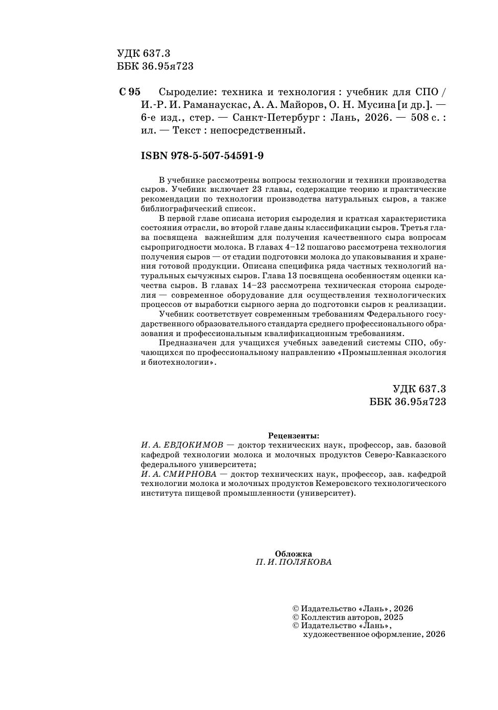 В учебнике рассмотрены вопросы технологии и техники производства сыров. Учебник включает 23 главы, содержащие теорию и практические рекомендации по технологии производства натуральных сыров, а также библиографический список.В первой главе описана история сыроделия и краткая характеристика состояния отрасли, во второй главе даны классификации сыров. Третья глава посвящена важнейшим для получения качественного сыра вопросам сыропригодности молока. В главах 4–12 пошагово рассмотрена технология получения сыров — от стадии подготовки молока до упаковывания и хранения готовой продукции. Описана специфика ряда частных технологий натуральных сычужных сыров. Глава 13 посвящена особенностям оценки качества сыров. В главах 14–23 рассмотрена техническая сторона сыроделия — современное оборудование для осуществления технологических процессов от выработки сырного зерна до подготовки сыров к реализации. Соответствует современным требованиям Федерального государственного образовательного стандарта среднего профессионального образования и профессиональным квалификационным требованиям. Учебник предназначен для учащихся учебных заведений системы СПО, обучающихся по специальностям, входящим в УГСН «Промышленная экология и биотехнологии».
