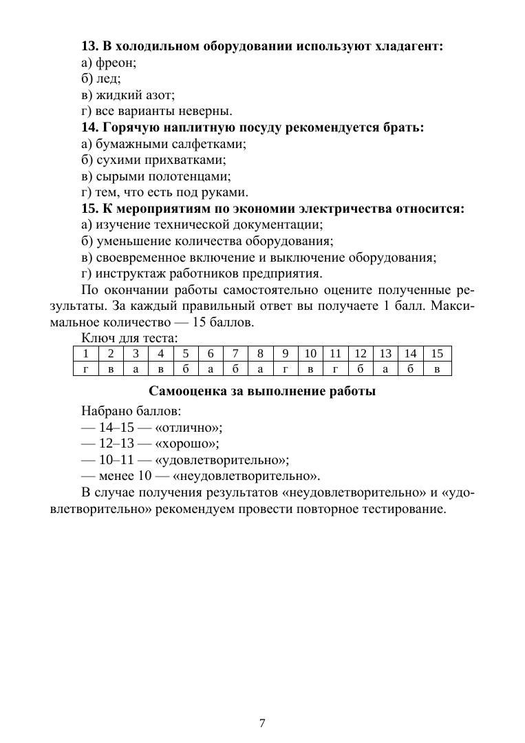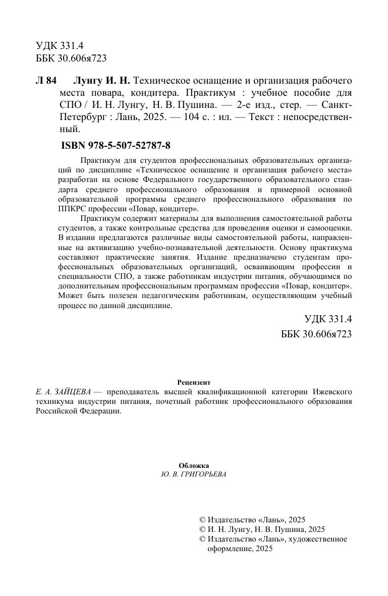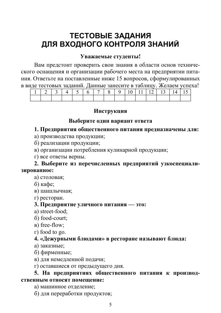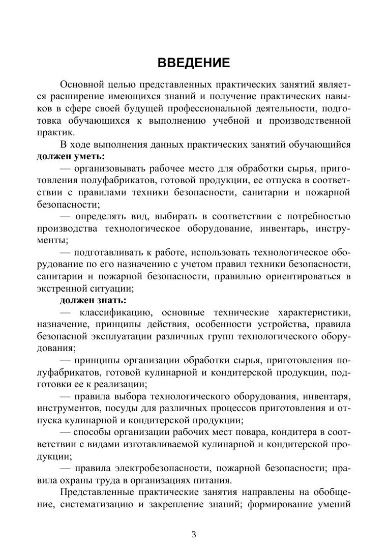 Практикум для студентов профессиональных образовательных организаций по дисциплине «Техническое оснащение и организация рабочего места» разработан на основе Федерального государственного образовательного стандарта среднего профессионального образования и примерной основной образовательной программы среднего профессионального образования по ППКРС профессии «Повар, кондитер». Практикум содержит материалы для выполнения самостоятельной работы студентов, а также контрольные средства для проведения оценки и самооценки. В издании предлагаются различные виды самостоятельной работы, направленные на активизацию учебно-познавательной деятельности. Основу практикума составляют практические занятия. Издание предназначено студентам профессиональных образовательных организаций, осваивающим профессии и специальности СПО, а также работникам индустрии питания, обучающимся по дополнительным профессиональным программам профессии «Повар, кондитер». Может быть полезен педагогическим работникам, осуществляющим учебный процесс по данной дисциплине.