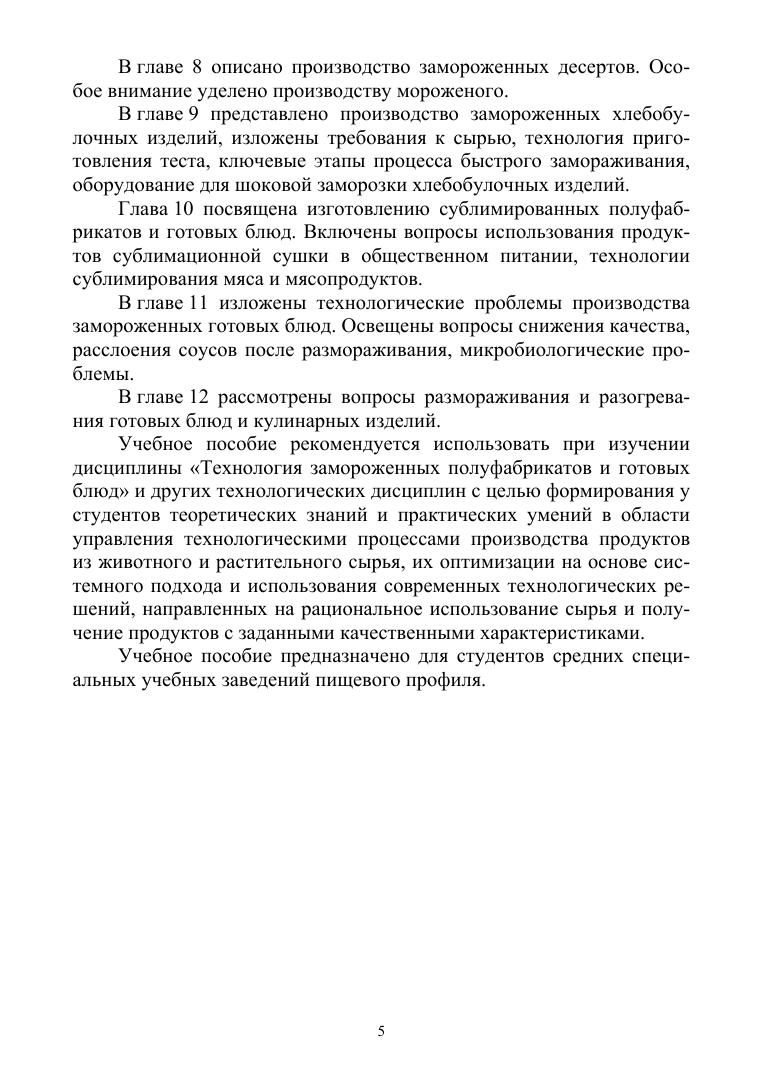 В учебном пособии рассмотрены технологии изготовления замороженных готовых блюд из сырья животного и растительного происхождения. Содержание пособия опирается на достижения технологии, публикуемые в учебной литературе и научных изданиях. Соответствует современным требованиям Федерального государственного образовательного стандарта среднего профессионального образования и профессиональным квалификационным требованиям. Учебное пособие предназначено для студентов средних специальных учебных заведений.