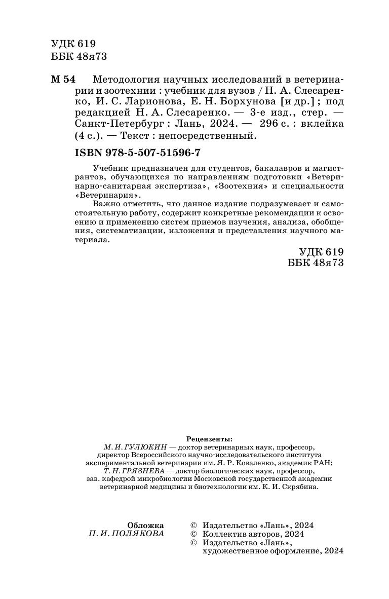 Учебник предназначен для студентов, бакалавров и магистрантов, обучающихся по направлениям подготовки «Ветеринарно-санитарная экспертиза», «Зоотехния» и специальности «Ветеринария». Важно отметить, что данное издание подразумевает и самостоятельную работу, содержит конкретные рекомендации к освоению и применению систем приемов изучения, анализа, обобщения, систематизации, изложения и представления научного материала.