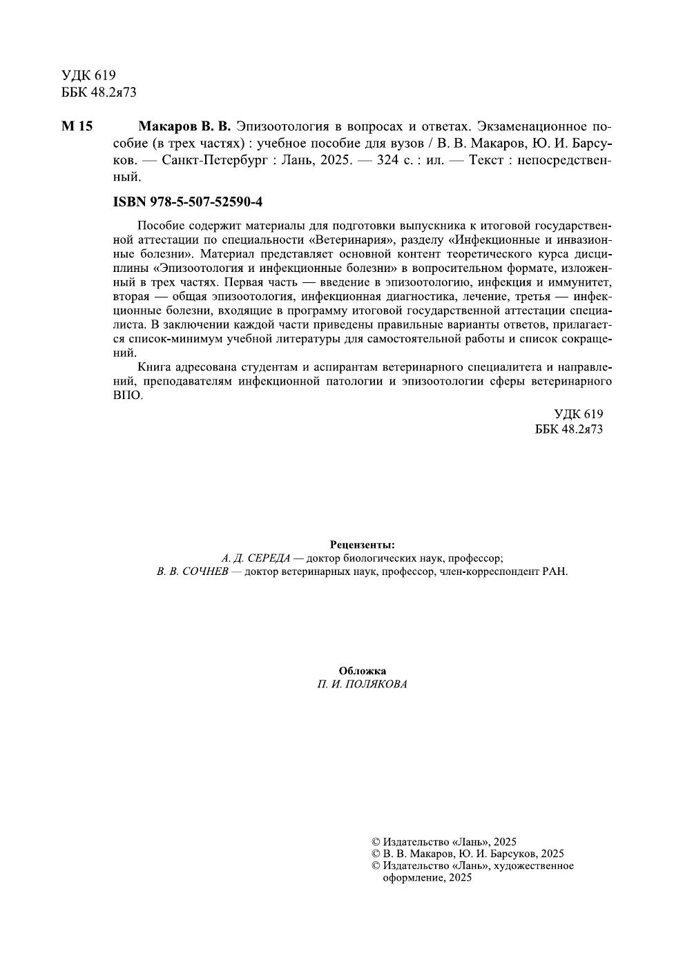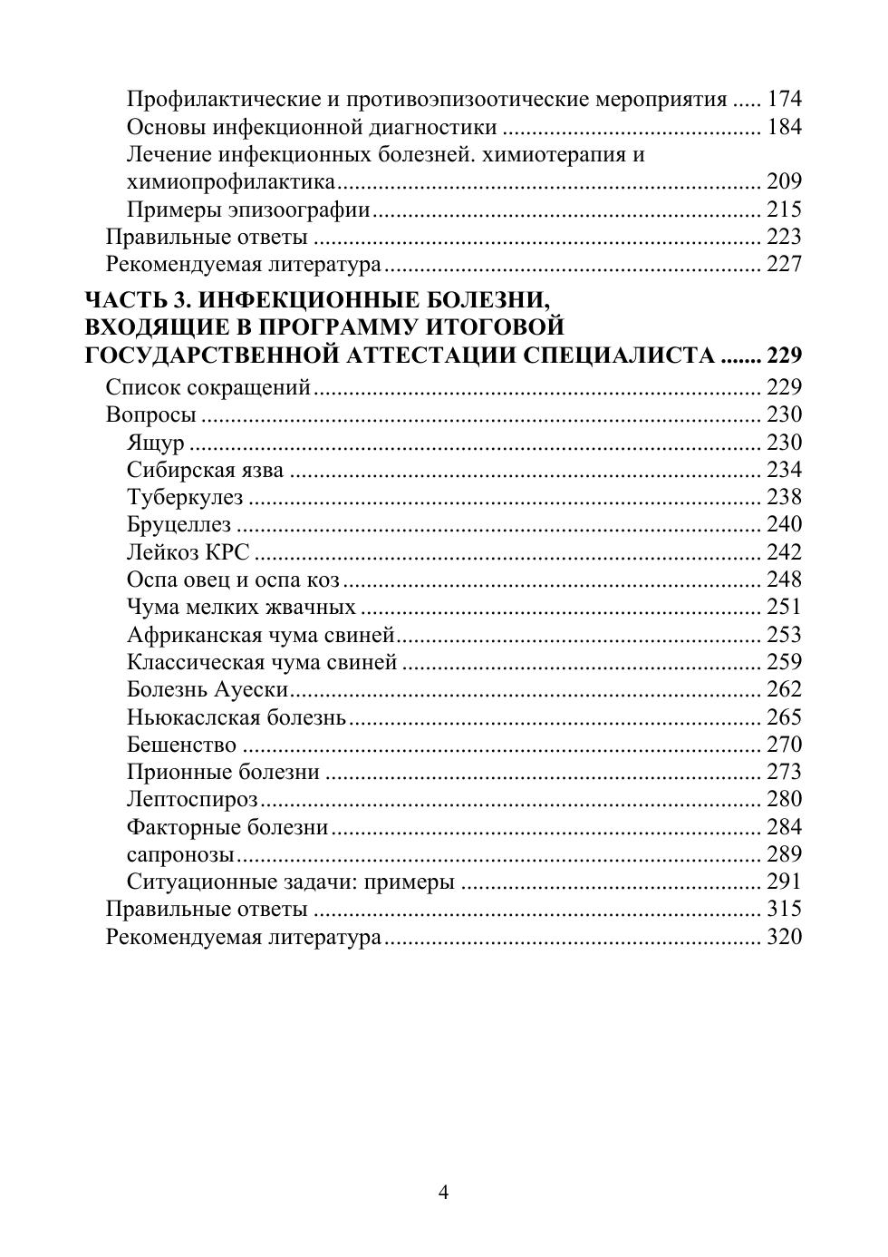 Пособие содержит материалы для подготовки выпускника к итоговой государственной аттестации по специальности «Ветеринария», разделу «Инфекционные и инвазионные болезни». Материал представляет основной контент теоретического курса дисциплины «Эпизоотология и инфекционные болезни» в вопросительном формате, изложенный в трех частях. Первая часть — введение в эпизоотологию, инфекция и иммунитет, вторая — общая эпизоотология, инфекционная диагностика, лечение, третья — инфекционные болезни, входящие в программу итоговой государственной аттестации специалиста. В заключении каждой части приведены правильные варианты ответов, прилагается список-минимум учебной литературы для самостоятельной работы и список сокращений. Книга адресована студентам и аспирантам ветеринарного специалитета и направлений, преподавателям инфекционной патологии и эпизоотологии сферы ветеринарного ВПО.
