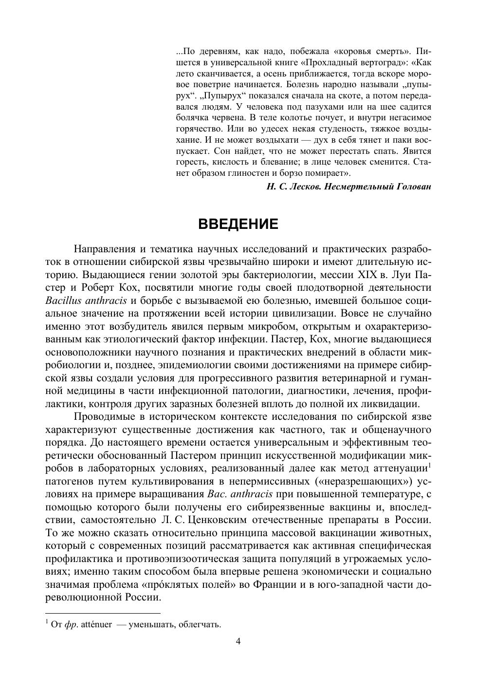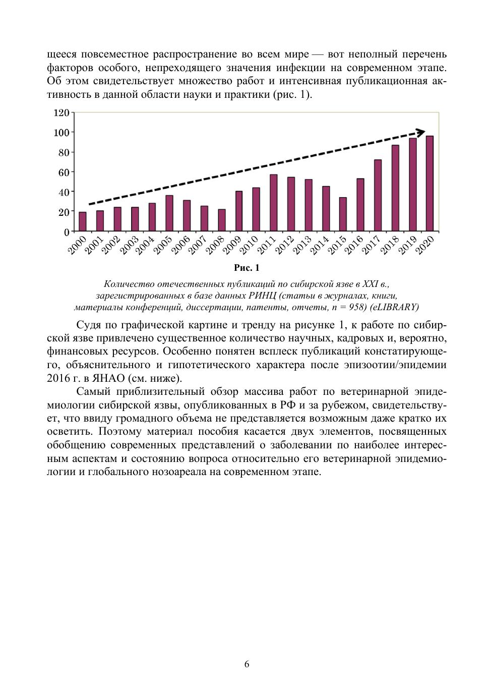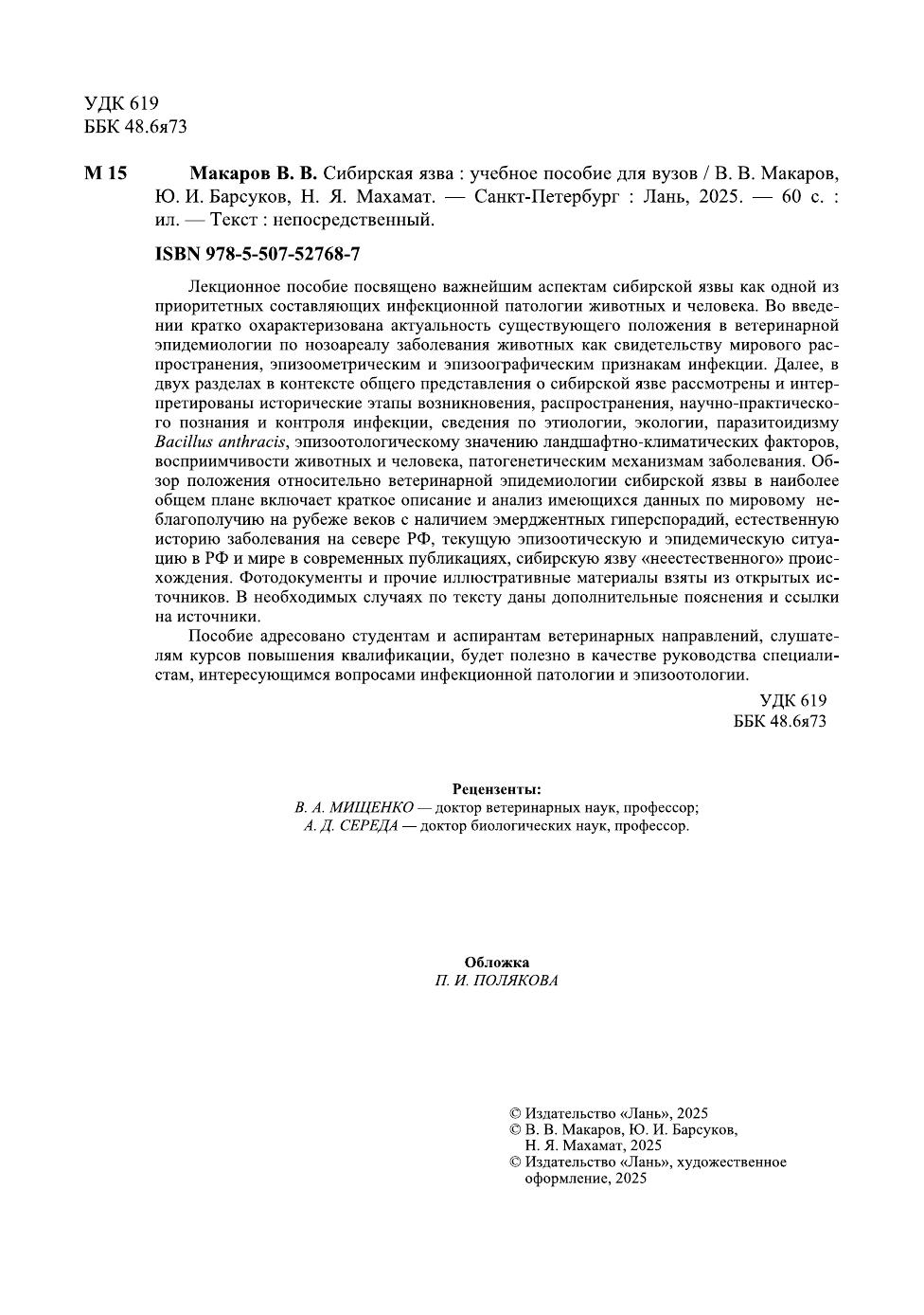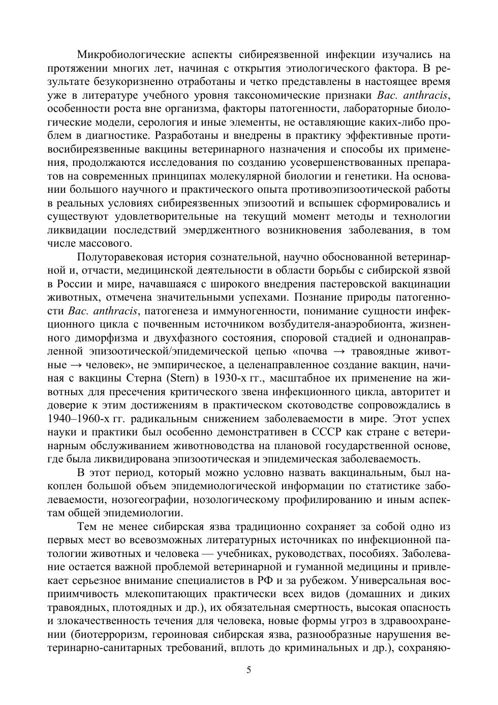 Лекционное пособие посвящено важнейшим аспектам сибирской язвы как одной из приоритетных составляющих инфекционной патологии животных и человека. Во введении кратко охарактеризована актуальность существующего положения в ветери-нарной эпидемиологии по нозоареалу заболевания животных как свидетельству мирового распространения, эпизоометрическим и эпизоографическим признакам инфекции. Далее, в двух разделах в контексте общего представления о сибирской язве рассмотрены и интерпретированы исторические этапы возникновения, распространения, научно-практического познания и контроля инфекции, сведения по этиологии, экологии, паразитоидизму Bacillus anthracis, эпизоотологическому значению ландшафтно-климатических факторов, восприимчивости животных и человека, патогенетическим механизмам заболевания. Обзор положения относительно ветеринарной эпидемиологии сибирской язвы в наиболее общем плане включает краткое описание и анализ имеющихся данных по мировому неблагополучию на рубеже веков с наличием эмерджентных гиперспорадий, естественную историю заболевания на севере РФ, текущую эпизоотическую и эпидемическую ситуацию в РФ и мире в современных публикациях, сибирскую язву «неестественного» происхождения. Фотодокументы и прочие иллюстративные материалы взяты из открытых источников. В необходимых случаях по тексту даны дополнительные пояснения и ссылки на источники. Пособие адресовано студентам и аспирантам ветеринарных направлений, слушателям курсов повышения квалификации, будет полезно в качестве руководства специалистам, интересующимся вопросами инфекционной патологии и эпизоотологии.