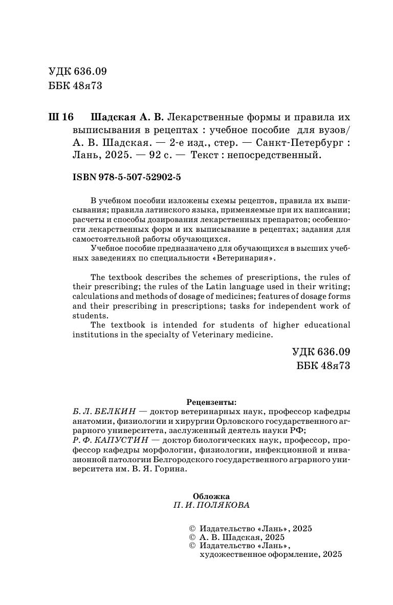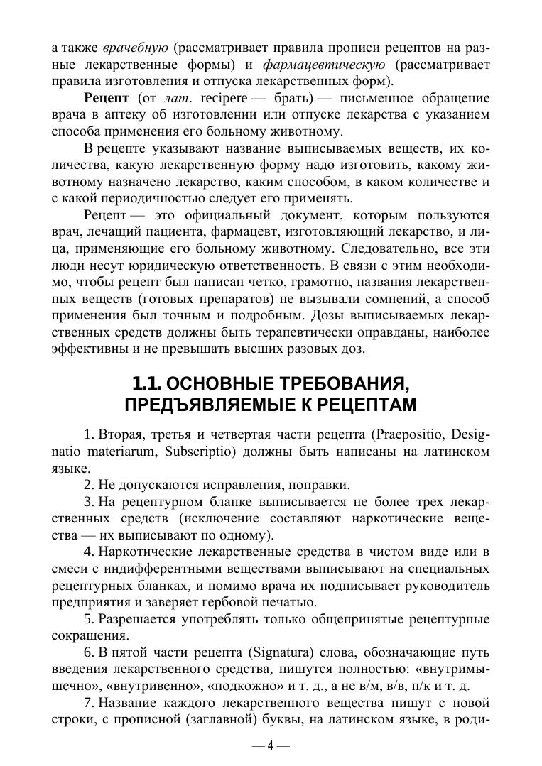 В учебном пособии изложены схемы рецептов, правила их выписывания, правила латинского языка, применяемые при их написании, расчеты и способы дозирования лекарственных препаратов, особенности лекарственных форм и их выписывание в рецептах, задания для самостоятельной работы обучающихся. Учебное пособие предназначено для обучающихся высших учебных заведений по специальности «Ветеринария». The textbook describes the schemes of prescriptions, the rules of their prescribing, the rules of the Latin language used in their writing, calculations and methods of dosage of medicines, features of dosage forms and their prescribing in prescriptions, tasks for independent work of students. The textbook is intended for students of higher educational institutions in the specialty of Veterinary medicine.